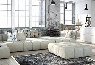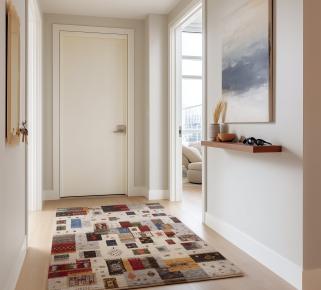 Designvloerkleden: Moderne ontwerpen gebaseerd op traditionele handknoopkunst. Creatief vormgegeven, vaak met strakke lijnen, gereduceerde patronen of innovatieve kleurconcepten en abstracte artistieke accenten. Hier ontmoeten hoogwaardige materialen en traditioneel vakmanschap een eigentijdse uitstraling.