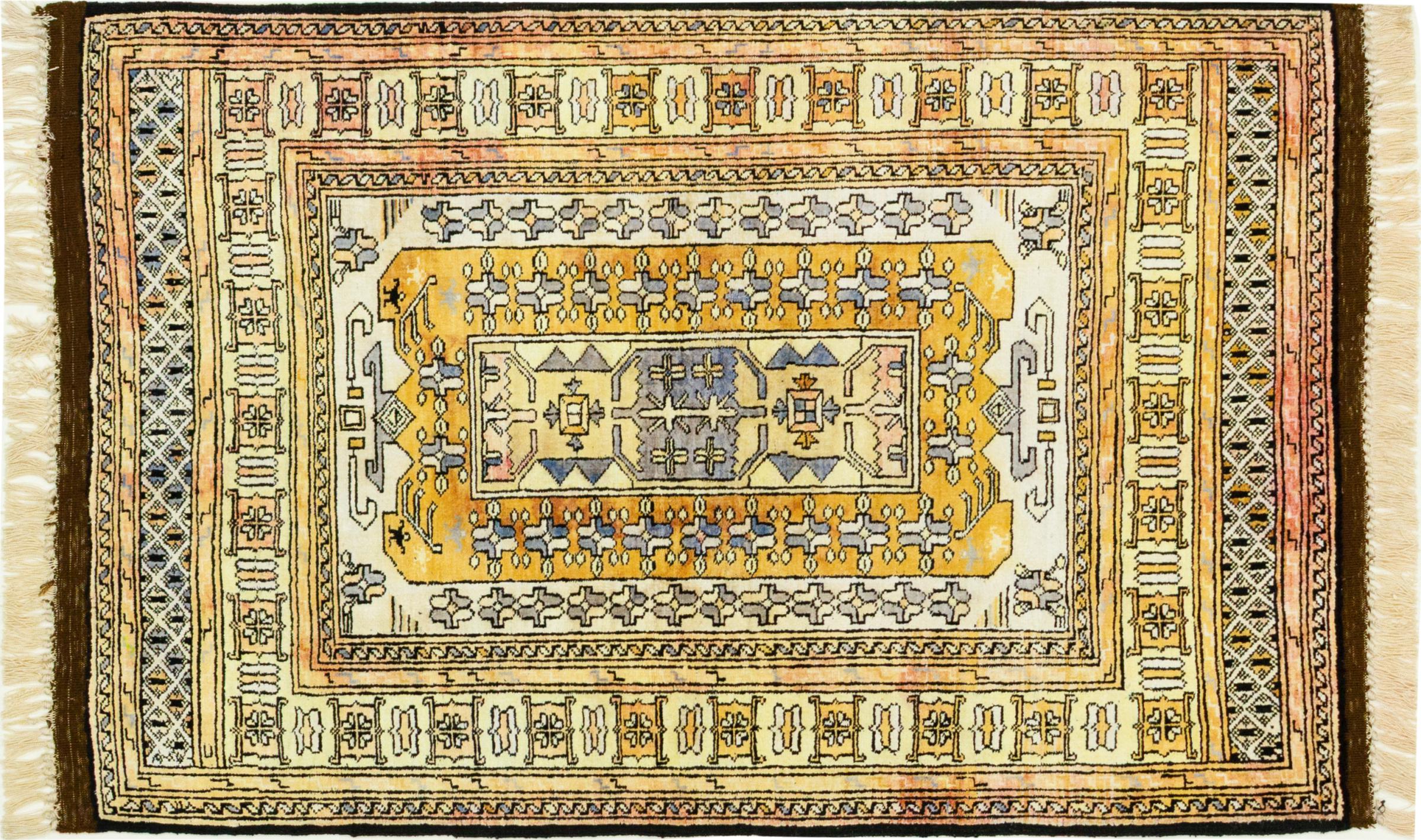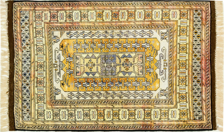 Tapijt ID: 303424005578854 Grootte: 113x78 cm Dikte: ap. 5 mm Knoopdichtheid: 320 000 - 360 000 / m² Verwerking: Handgeknoopte Pool: Zijde Schering: Zijde Oorsprong: Afghanistan Leeftijd: Nieuw Gewicht: ap. 3 kg Ook wel bekend als Afgan, Afghán, Afgán Op voorraad: Uniek - Nog maar 1 op voorraad