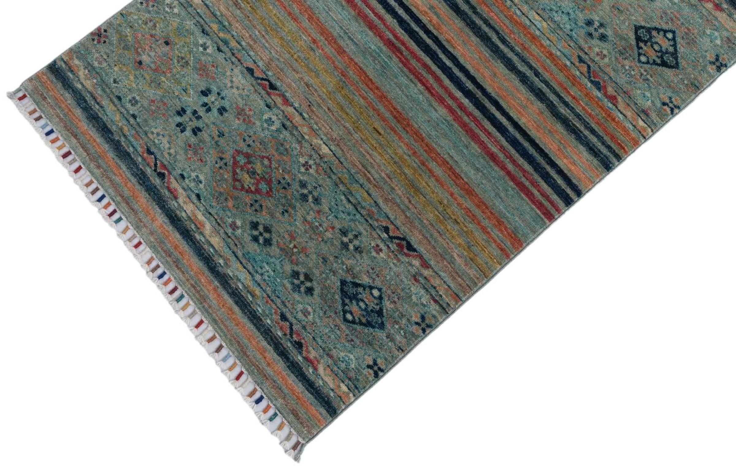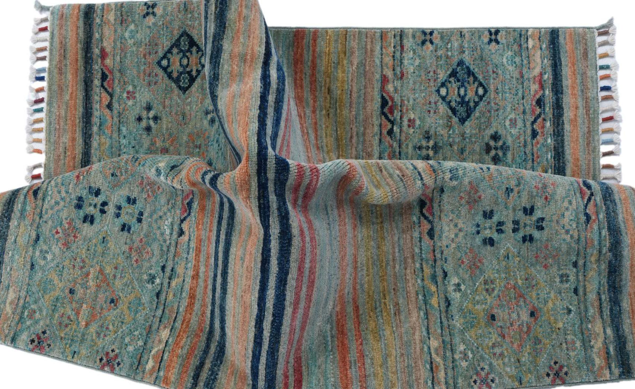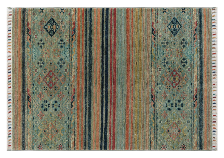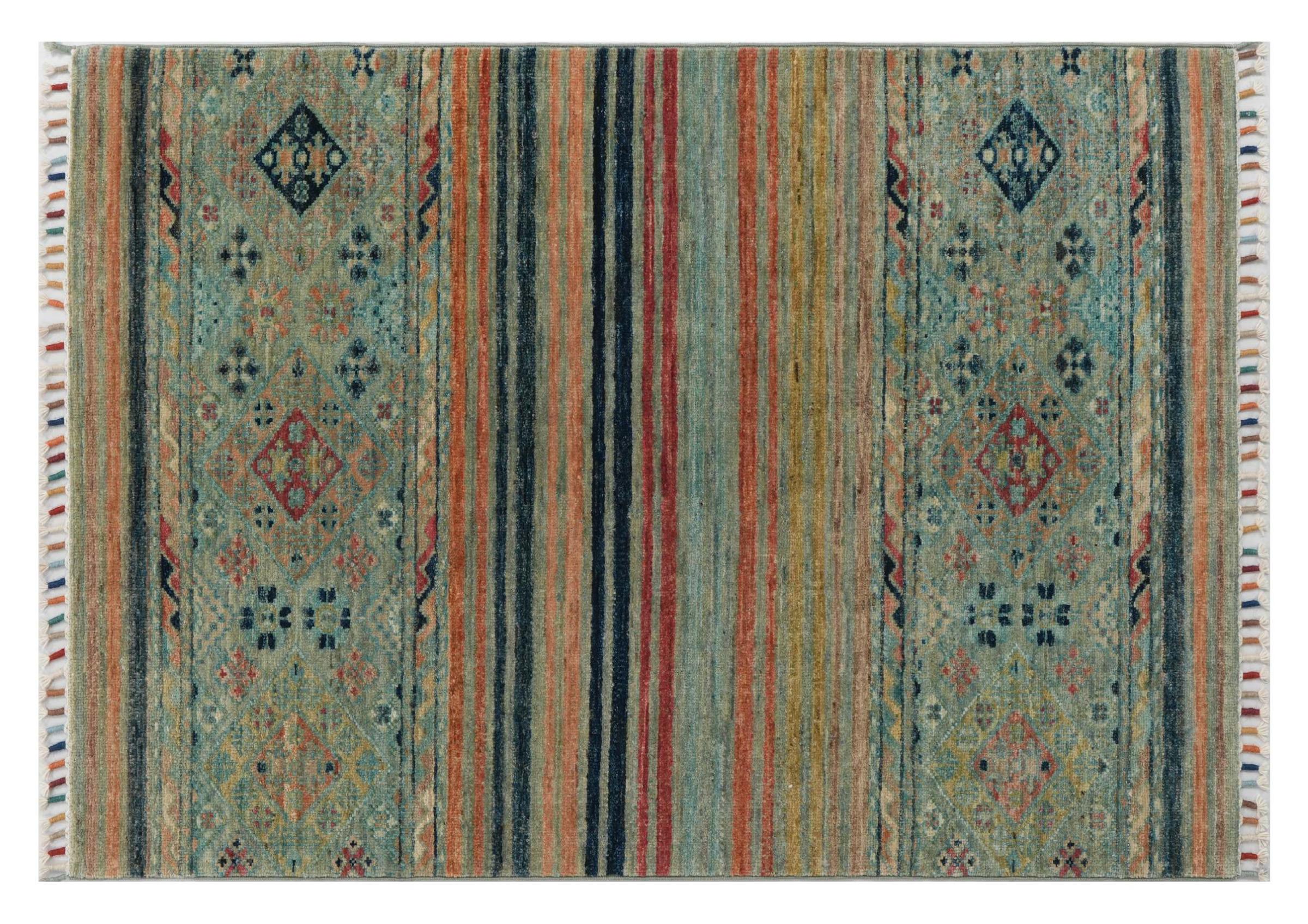 Dit Arijana Shaal-deken werd met de hand geknoopt in Pakistan met het fijnste vakmanschap. Het belooft een zeer hoge kwaliteit en biedt dus langdurig plezier. Het patroon in strepen is gevarieerd en spannend. Het is geïnspireerd op het bekende Moharamati ontwerp. Als monochrome tapijten voor u te saai zijn, zult u zeker blij zijn met deze Arijana Shaal.