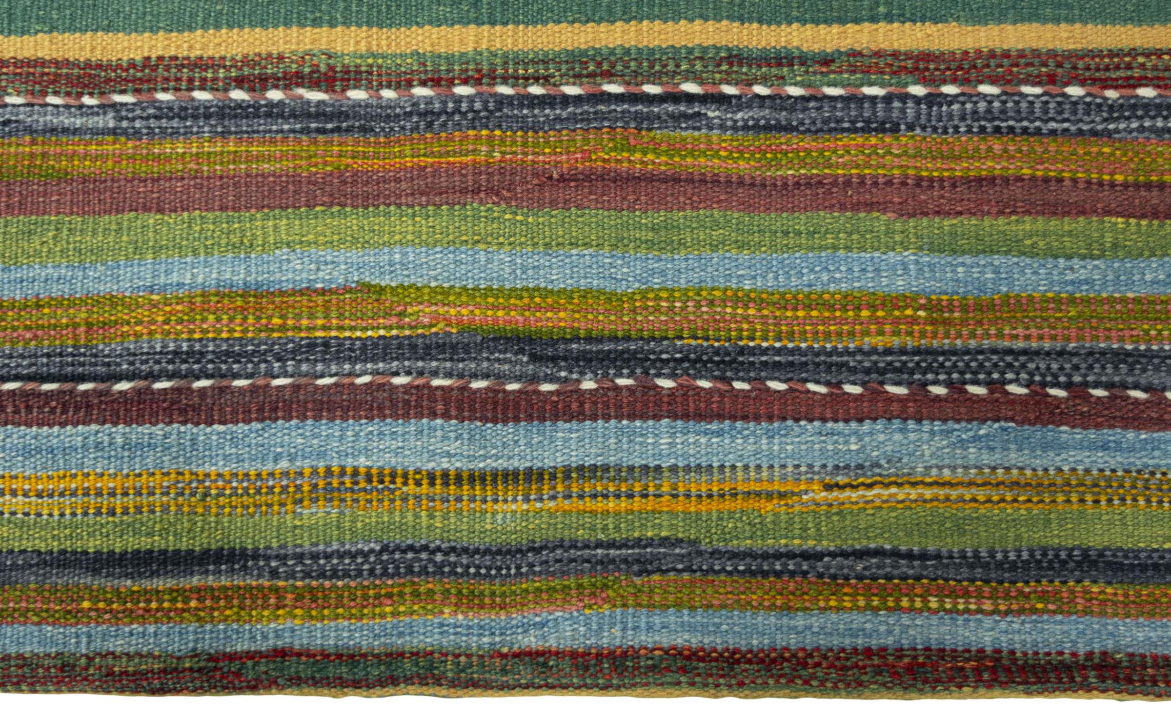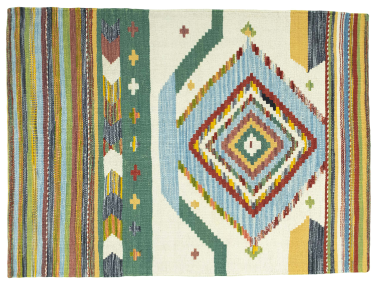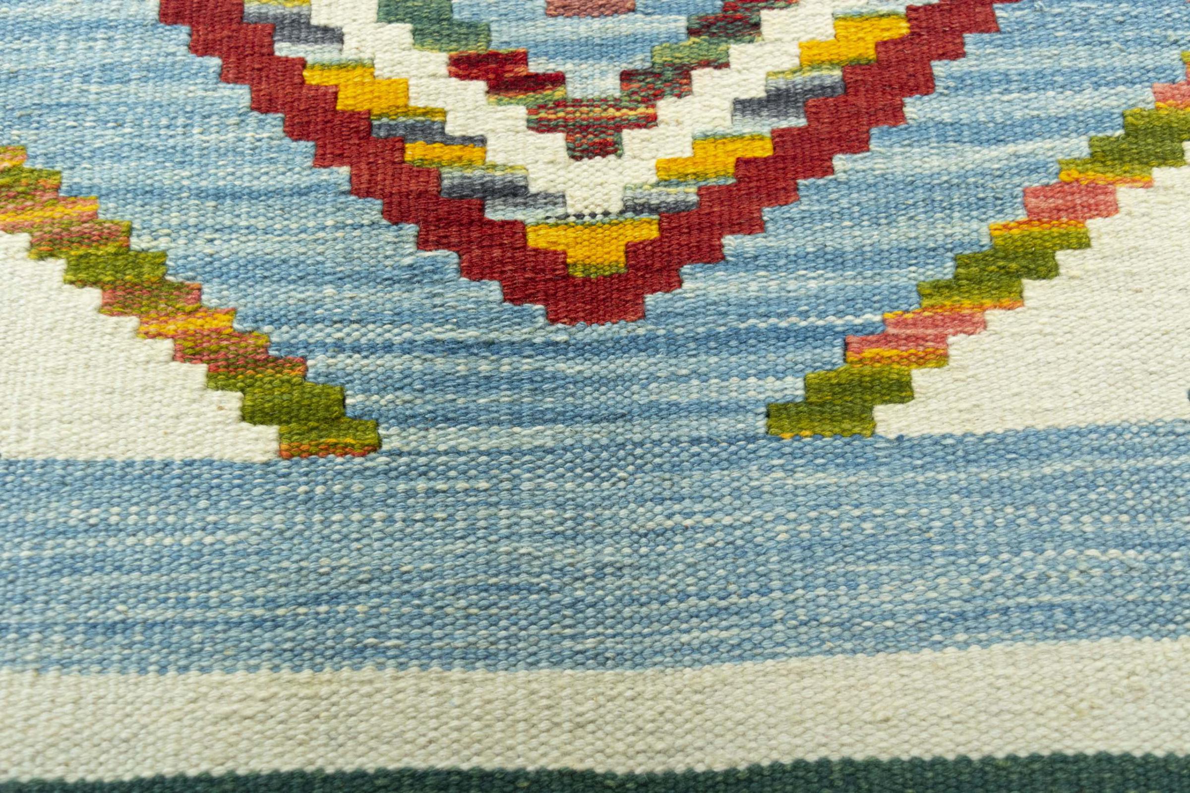 Dit tapijt is met de hand gemaakt op een weefgetouw als plat weefgetouw. Flatweave is de term die wordt gebruikt om tapijten zonder pool te beschrijven. Zoals de naam al belooft, zijn deze tapijten geweven en niet geknoopt. Dit resulteert in een vlak tapijt met een gestructureerd oppervlak. Platweefsels zijn niet zo zacht en meestal dunner dan geknoopte tapijten. Tegelijkertijd zijn ze veel minder complex te vervaardigen en kunnen ze meestal aan beide zijden (voor- en achterkant) worden gelegd. Hun patronen zijn meestal geometrisch, wat wordt bepaald door de stof.
