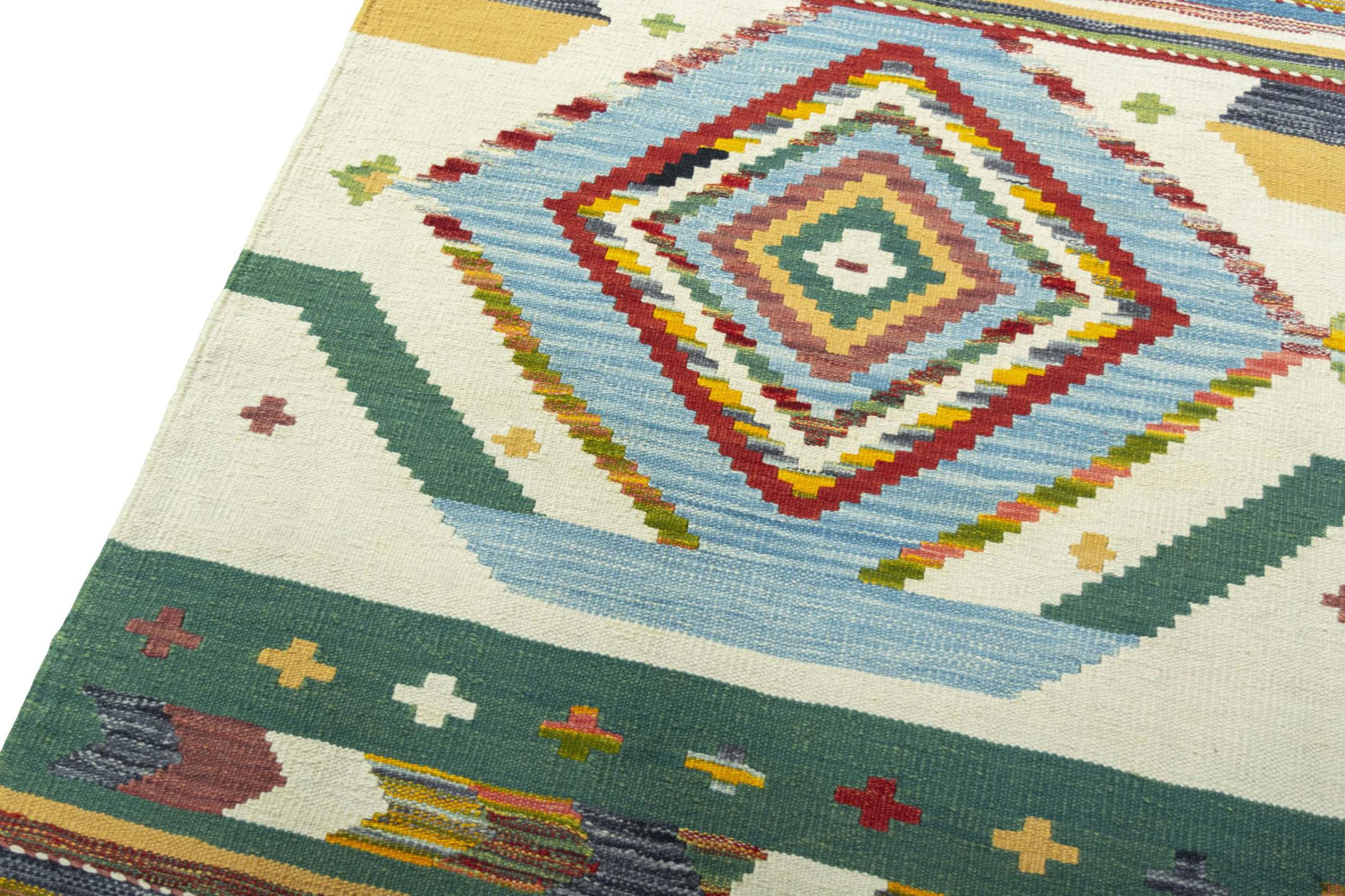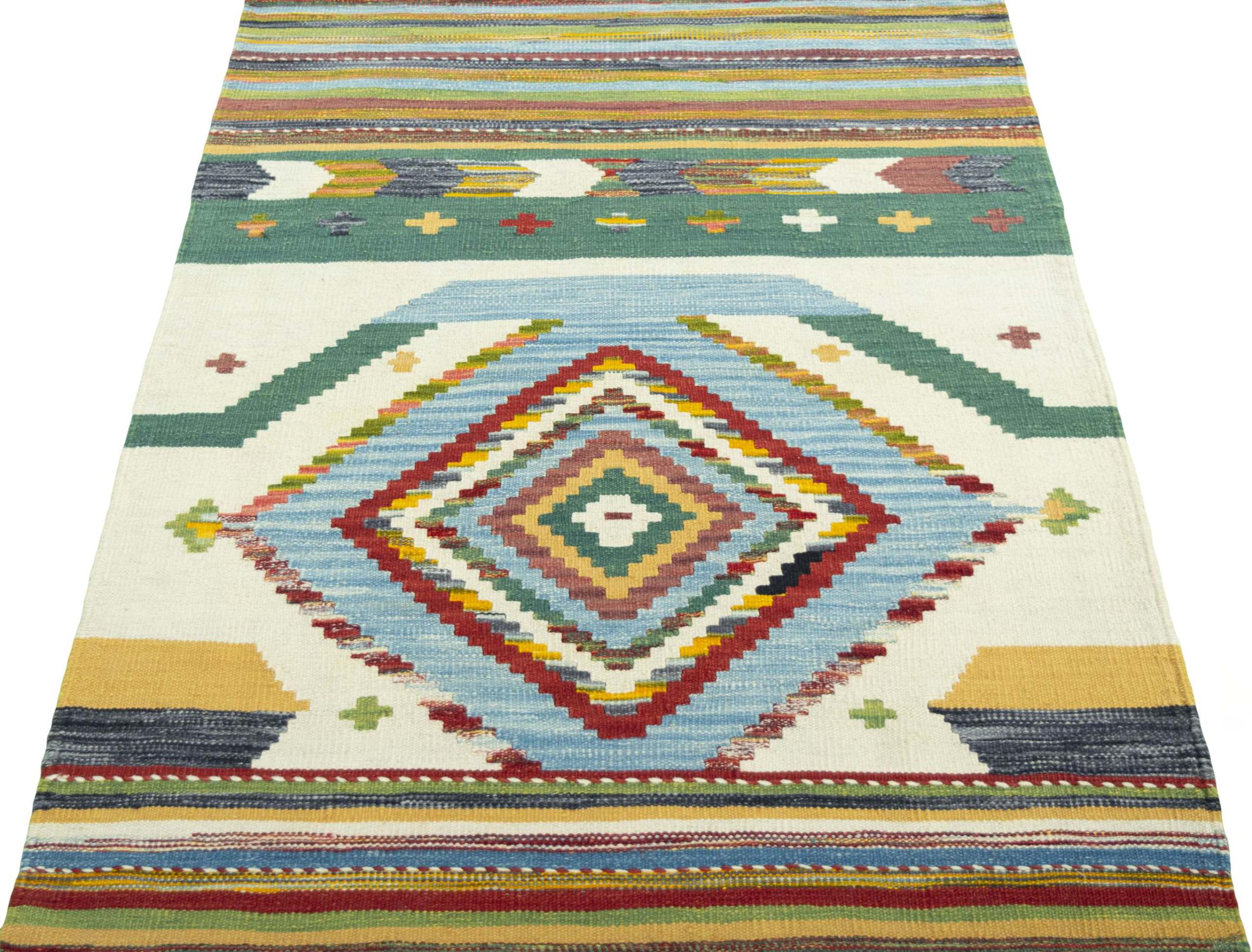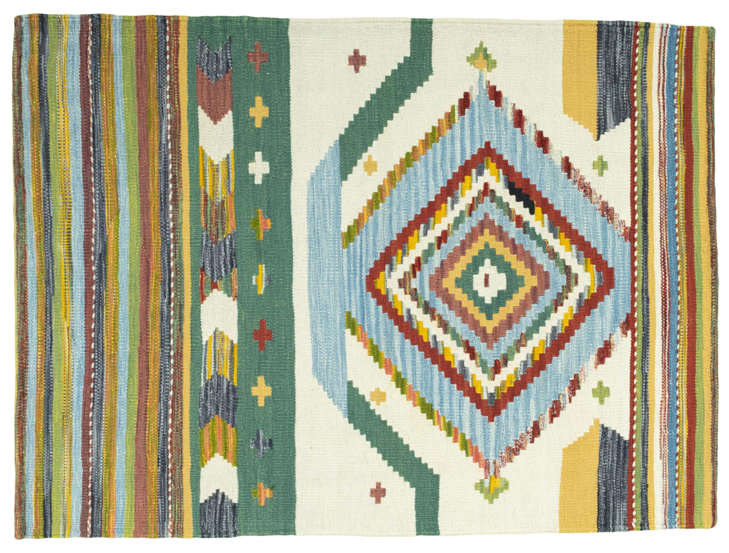 Dit tapijt is met de hand gemaakt op een weefgetouw als plat weefgetouw. Flatweave is de term die wordt gebruikt om tapijten zonder pool te beschrijven. Zoals de naam al belooft, zijn deze tapijten geweven en niet geknoopt. Dit resulteert in een vlak tapijt met een gestructureerd oppervlak. Platweefsels zijn niet zo zacht en meestal dunner dan geknoopte tapijten. Tegelijkertijd zijn ze veel minder complex te vervaardigen en kunnen ze meestal aan beide zijden (voor- en achterkant) worden gelegd. Hun patronen zijn meestal geometrisch, wat wordt bepaald door de stof.