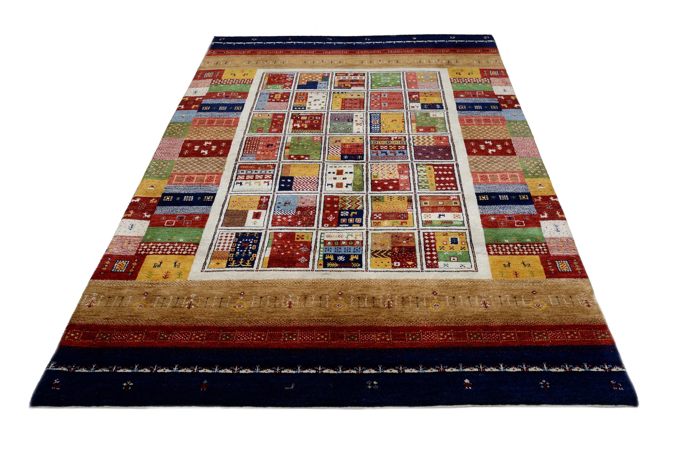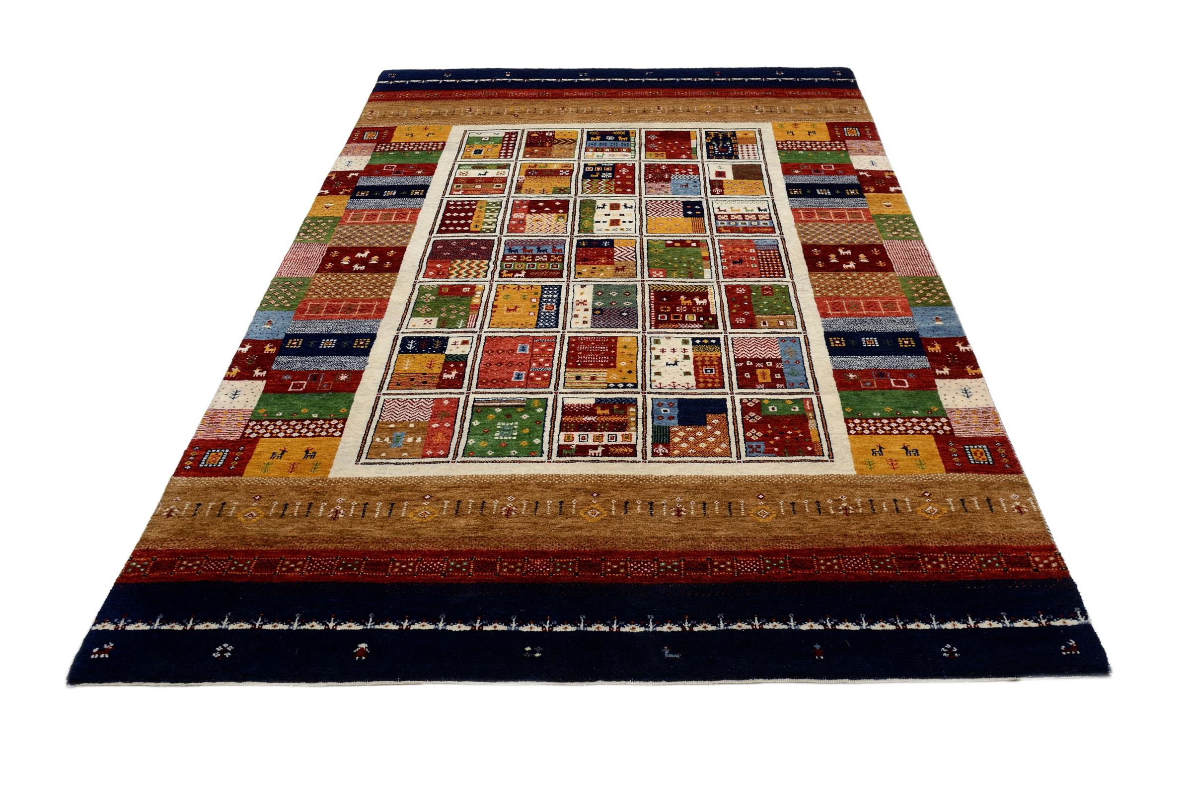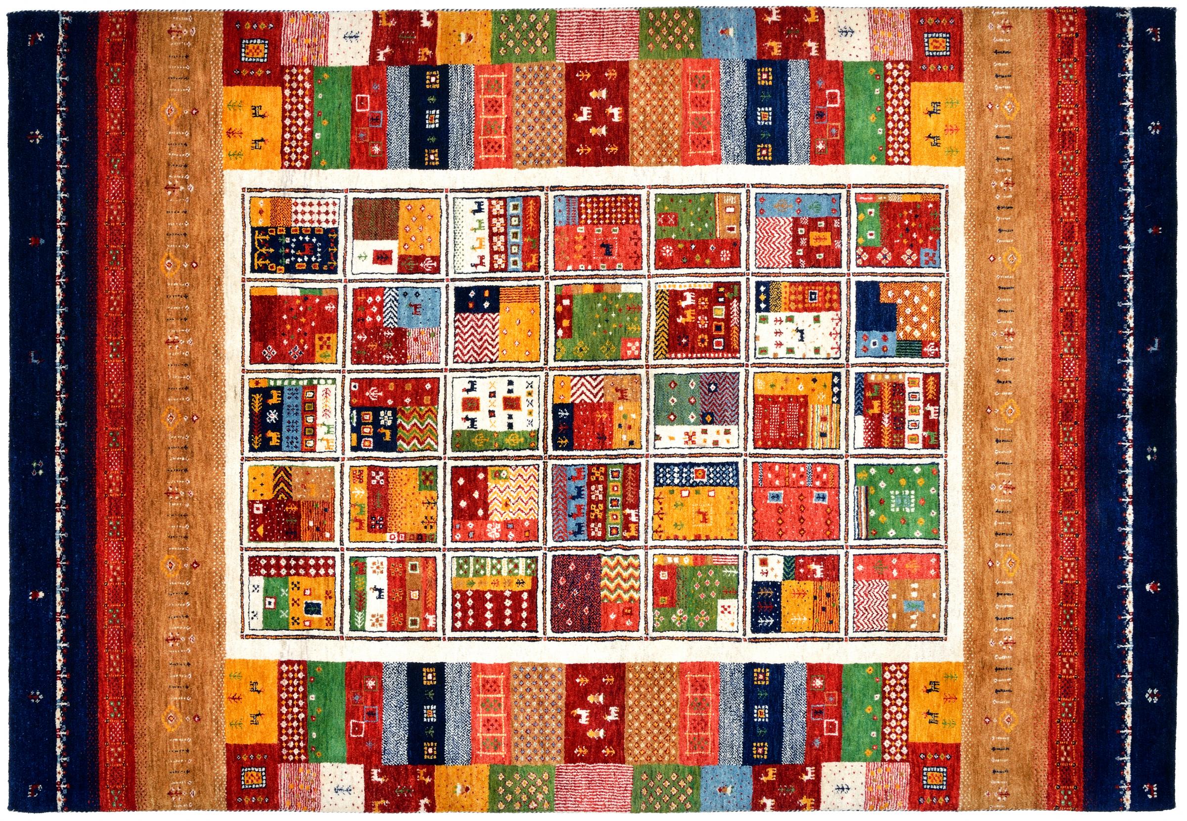 Dit prachtige Gabbeh tapijt werd met de hand geknoopt in India. Indiase Gabbeh tapijten zijn gemaakt van zachte schapenwol, zijn comfortabel aan de voeten en hebben een warmte-isolerende werking. Meestal zijn hun ontwerpen eenvoudig en tijdloos modern. Ze werden geïnspireerd door nomadische volkeren, die zeer eenvoudige motieven uit hun omgeving in de tapijten lieten vloeien. Indiase Gabbeh-tapijten komen niet helemaal in de buurt van de kwaliteit van een Perzische Gabbeh, maar hebben een zeer goede prijs-kwaliteitverhouding. Daarom zijn ze perfect geschikt als handgeknoopte beginnerstapijten.