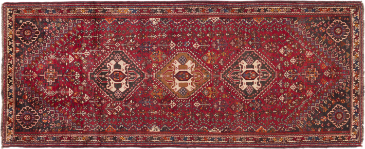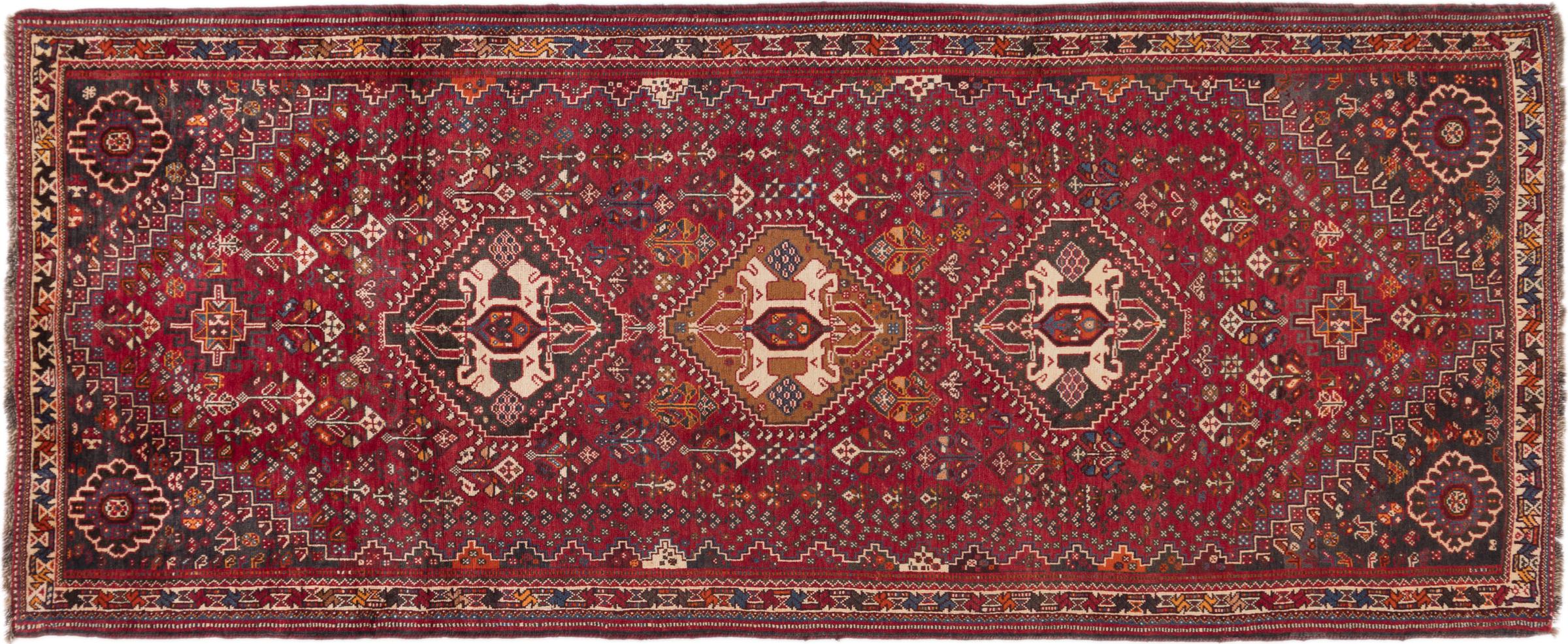 Tapijt ID: 298429005849 Grootte: 300x120 cm Dikte: ap. 12 mm Knoopdichtheid: 200 000 - 250 000 / m² Verwerking: Handgeknoopte Pool: Hand gesponnen wol Schering: Wol Oorsprong: Perzië / Iran Leeftijd: Nieuw Gewicht: ap. 13 kg Ook wel bekend als Qashqai, Gaschgai, Gashghai, Kashgai Op voorraad: Uniek - Nog maar 1 op voorraad