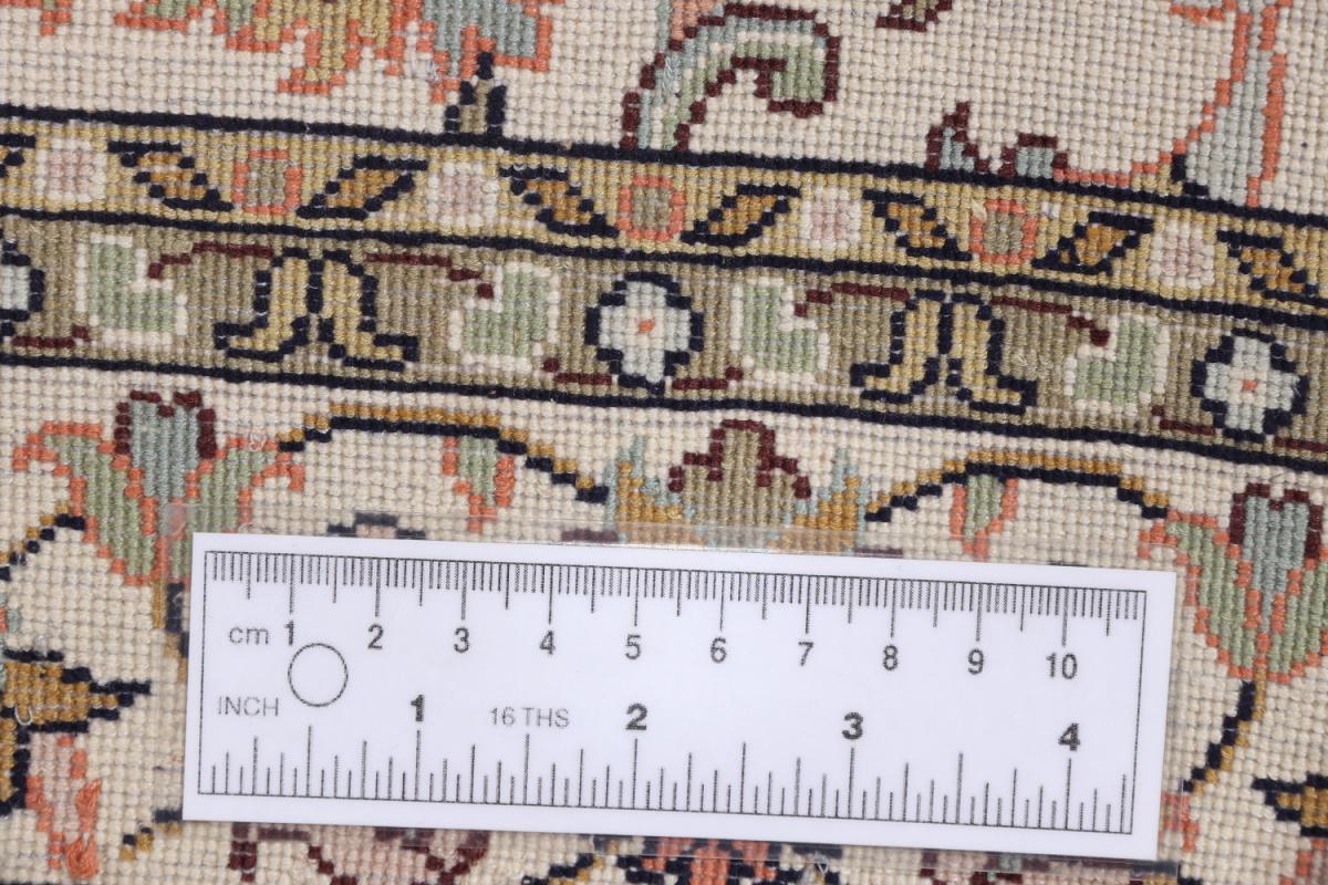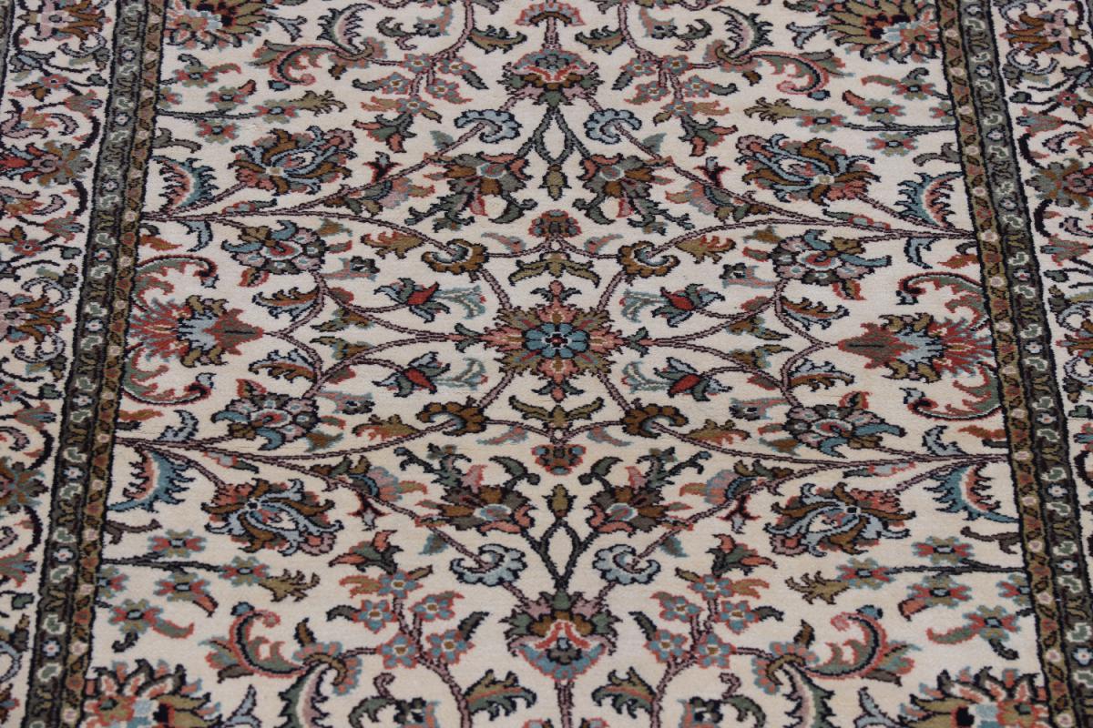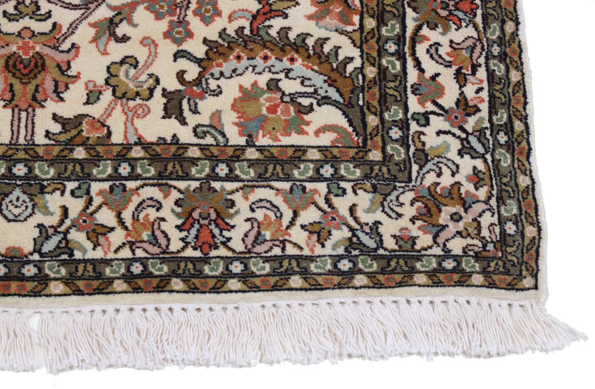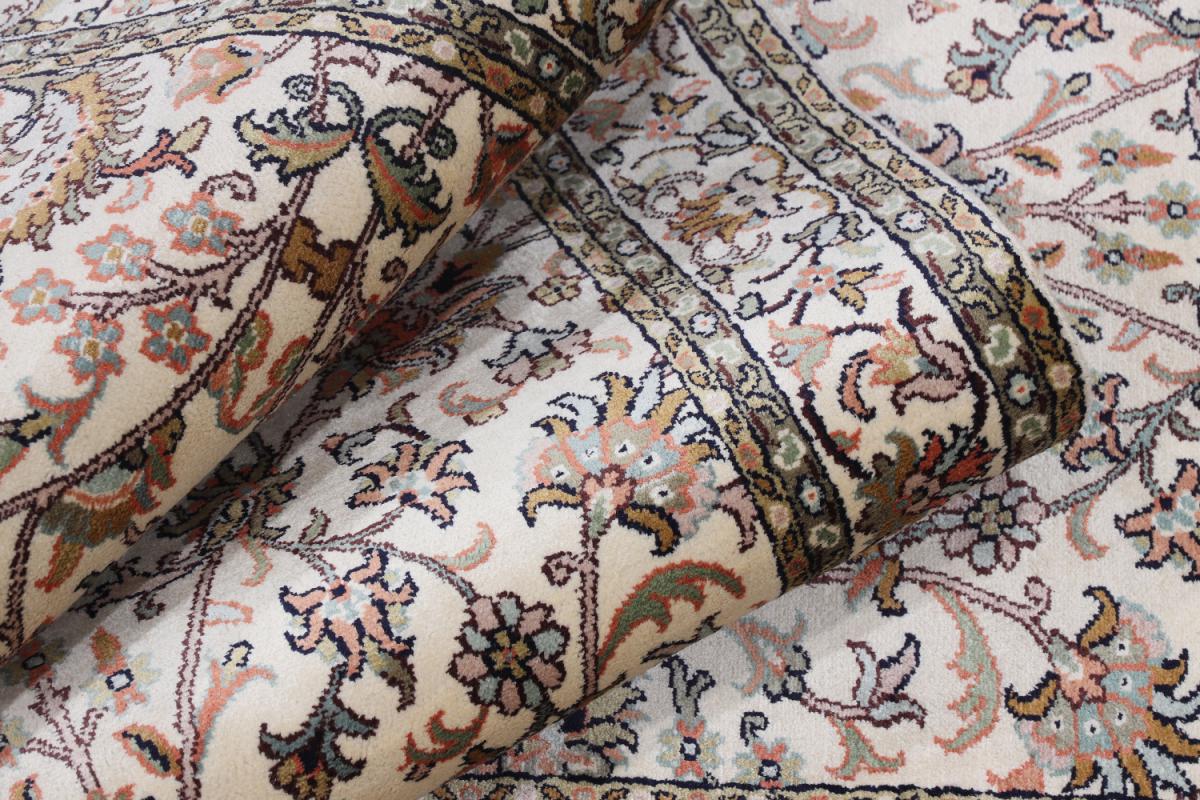 Dit handgeknoopte zijden tapijt uit Kasjmir weerspiegelt de vaardigheid van de Indiase tapijtwevers. Het is niet alleen gemaakt van pure zijde, maar de knoopdichtheid is zo fijn dat alleen zeer ervaren wevers een dergelijk werk kunnen maken. De fijne natuurlijke zijde is een fascinerend hoogtepunt. Het voelt niet alleen bijzonder zacht aan, maar laat ook de kleuren in de meest uiteenlopende facetten schitteren. Afhankelijk van de lichtinval komen compleet nieuwe details en kleuren aan het licht die nog jarenlang indruk zullen maken. Je kunt uren naar zo'n tapijt kijken en de tijd vergeten - een ervaring die niet in een foto is vast te leggen.