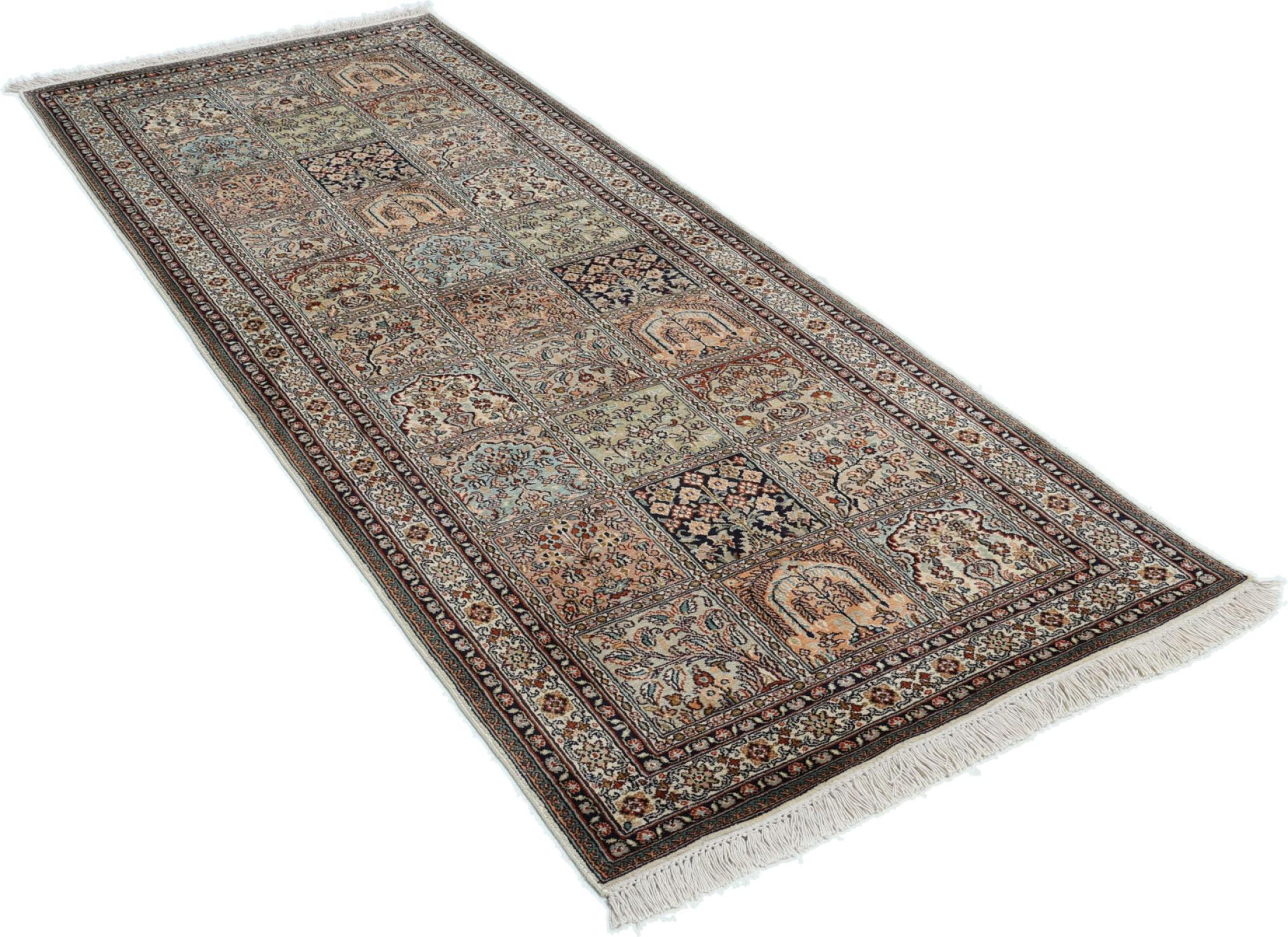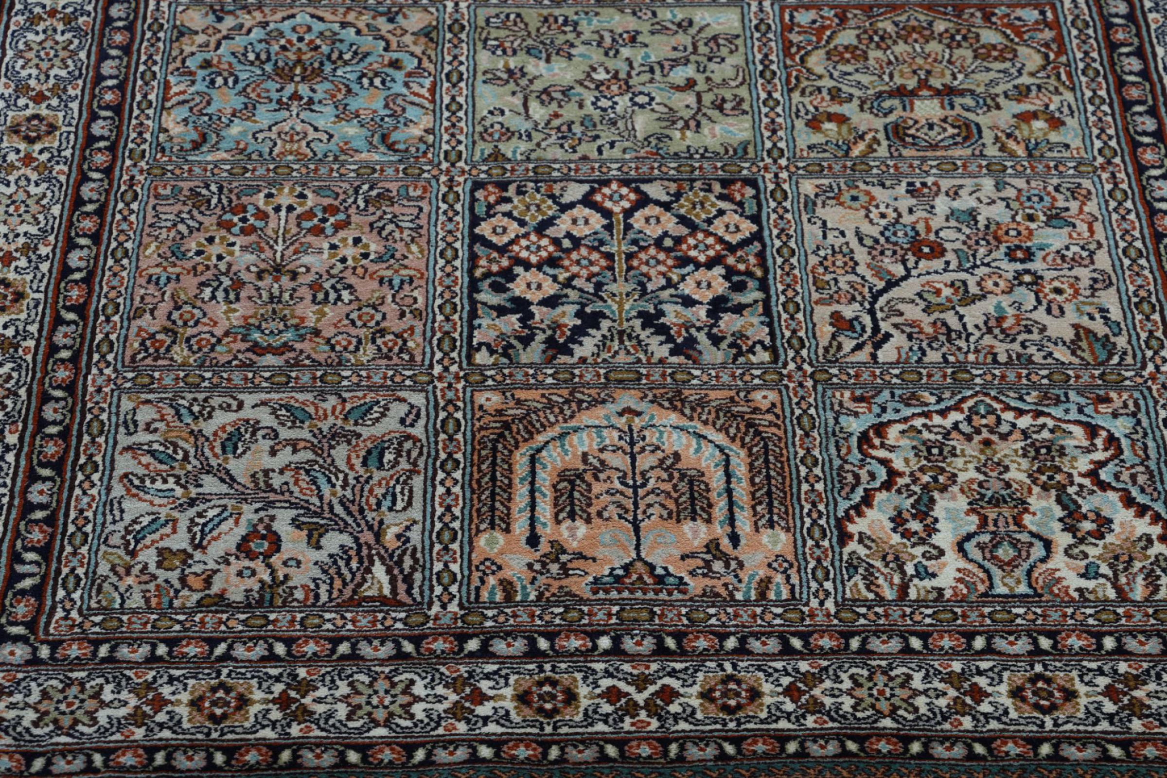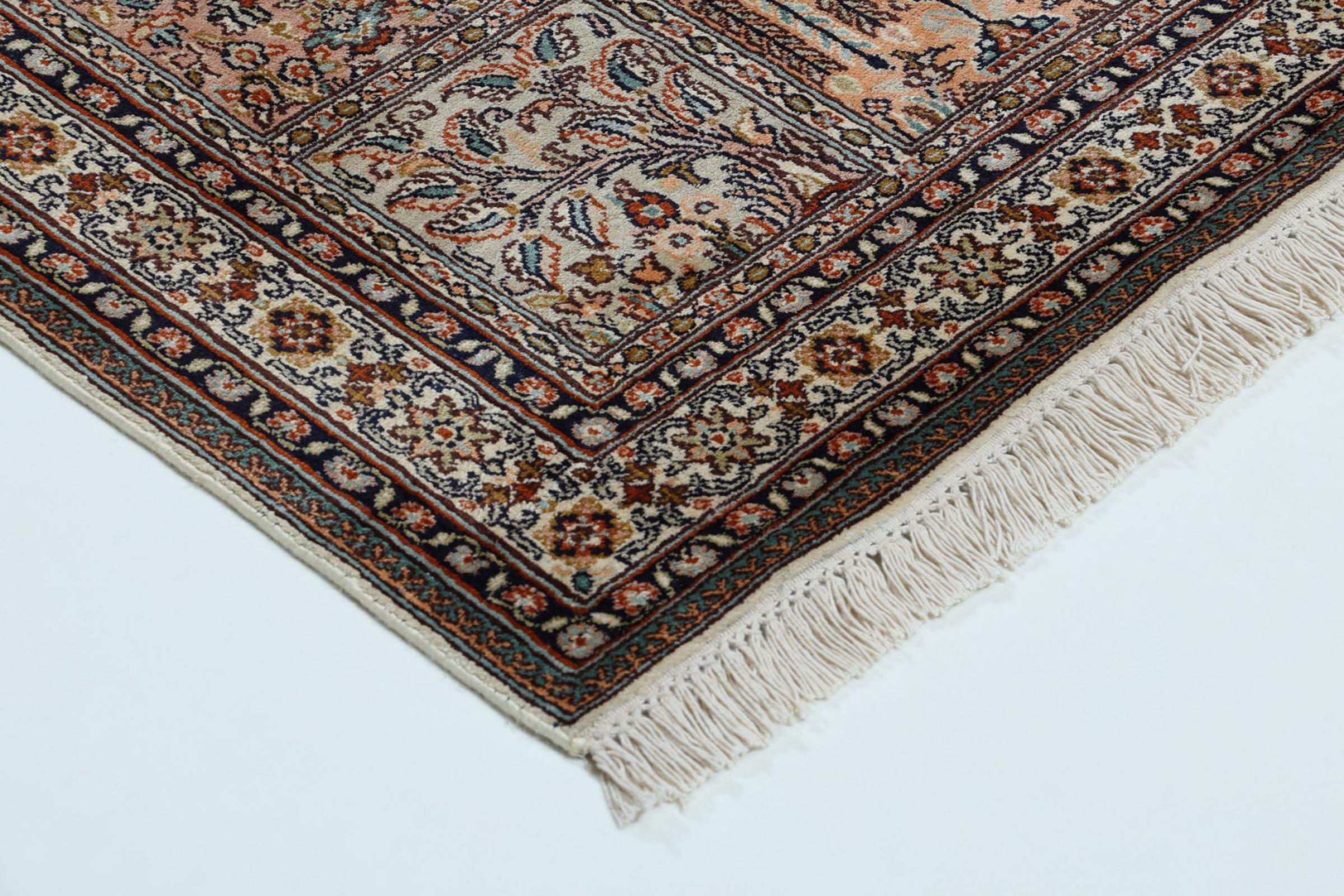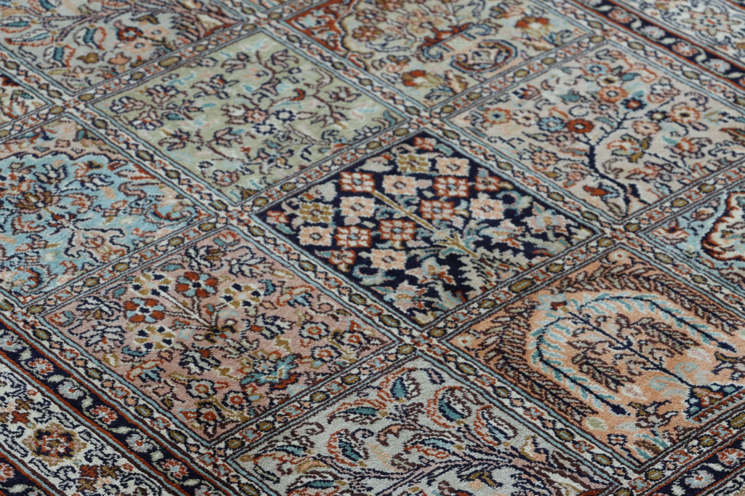 Dit handgeknoopte zijden tapijt uit Kasjmir weerspiegelt de vaardigheid van de Indiase tapijtwevers. Het is niet alleen gemaakt van pure zijde, maar de knoopdichtheid is zo fijn dat alleen zeer ervaren wevers een dergelijk werk kunnen maken. De fijne natuurlijke zijde is een fascinerend hoogtepunt. Het voelt niet alleen bijzonder zacht aan, maar laat ook de kleuren in de meest uiteenlopende facetten schitteren. Afhankelijk van de lichtinval komen compleet nieuwe details en kleuren aan het licht die nog jarenlang indruk zullen maken. Je kunt uren naar zo'n tapijt kijken en de tijd vergeten - een ervaring die niet in een foto is vast te leggen.