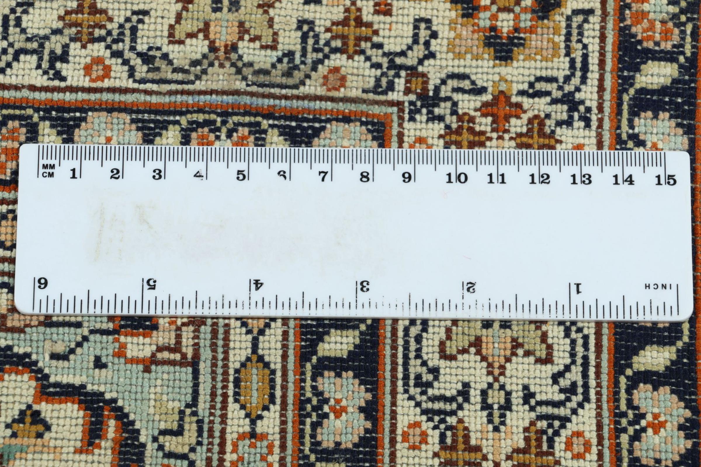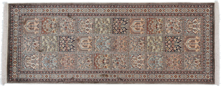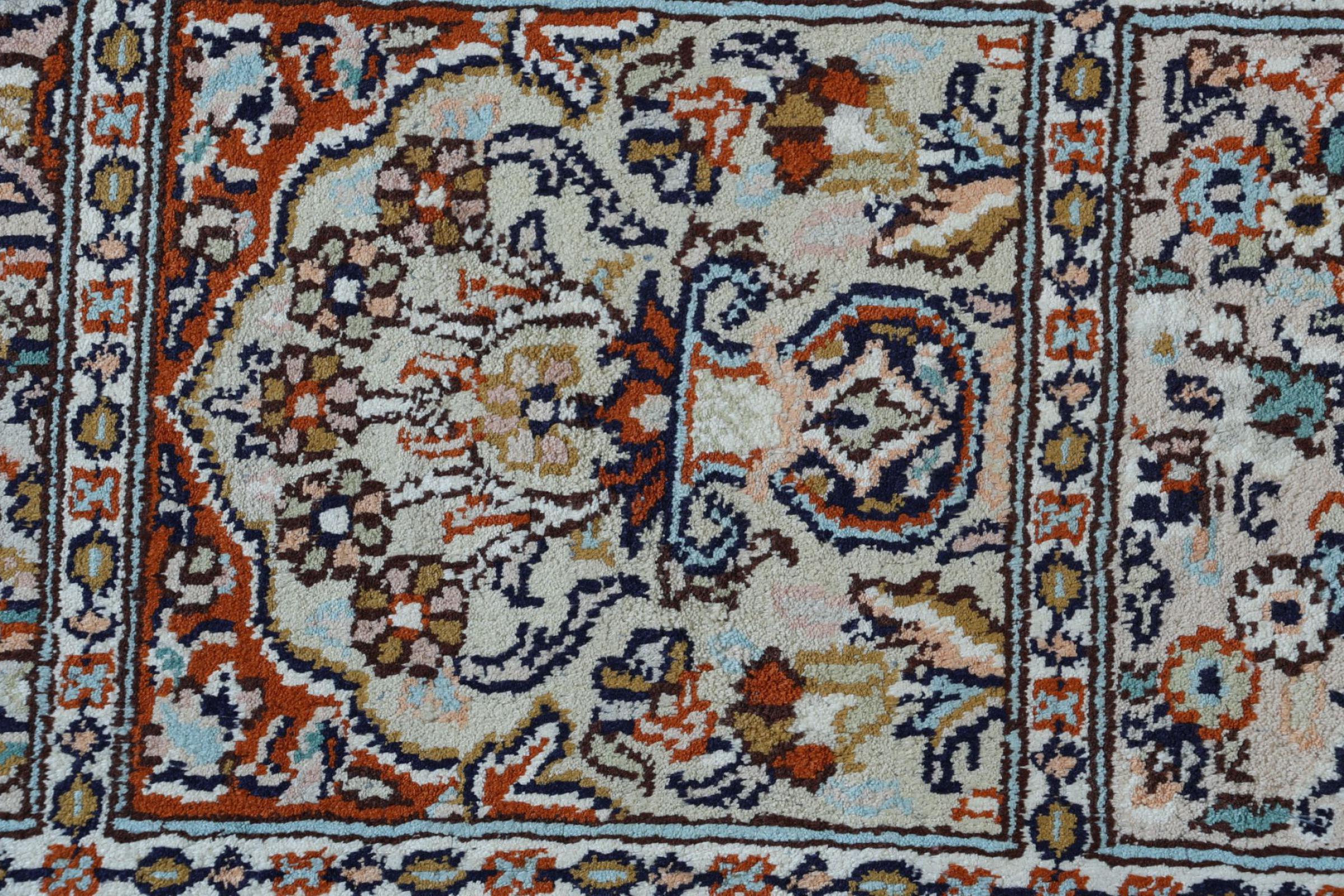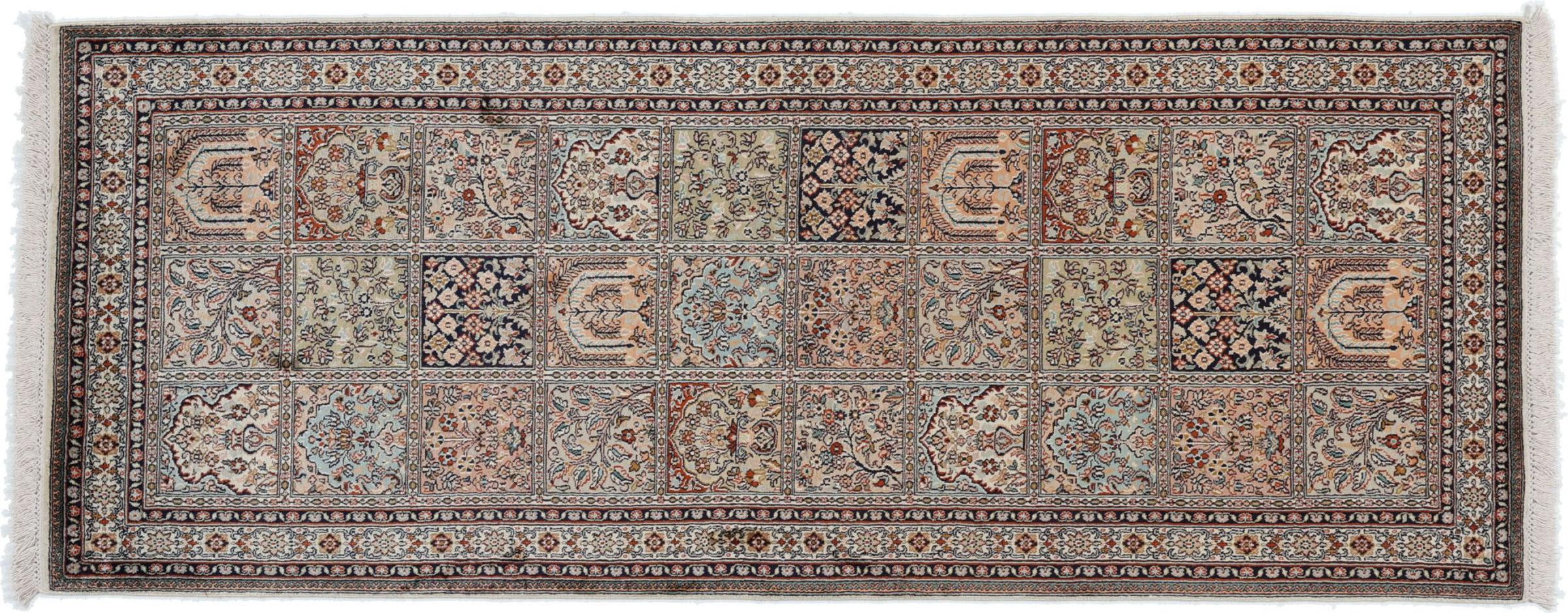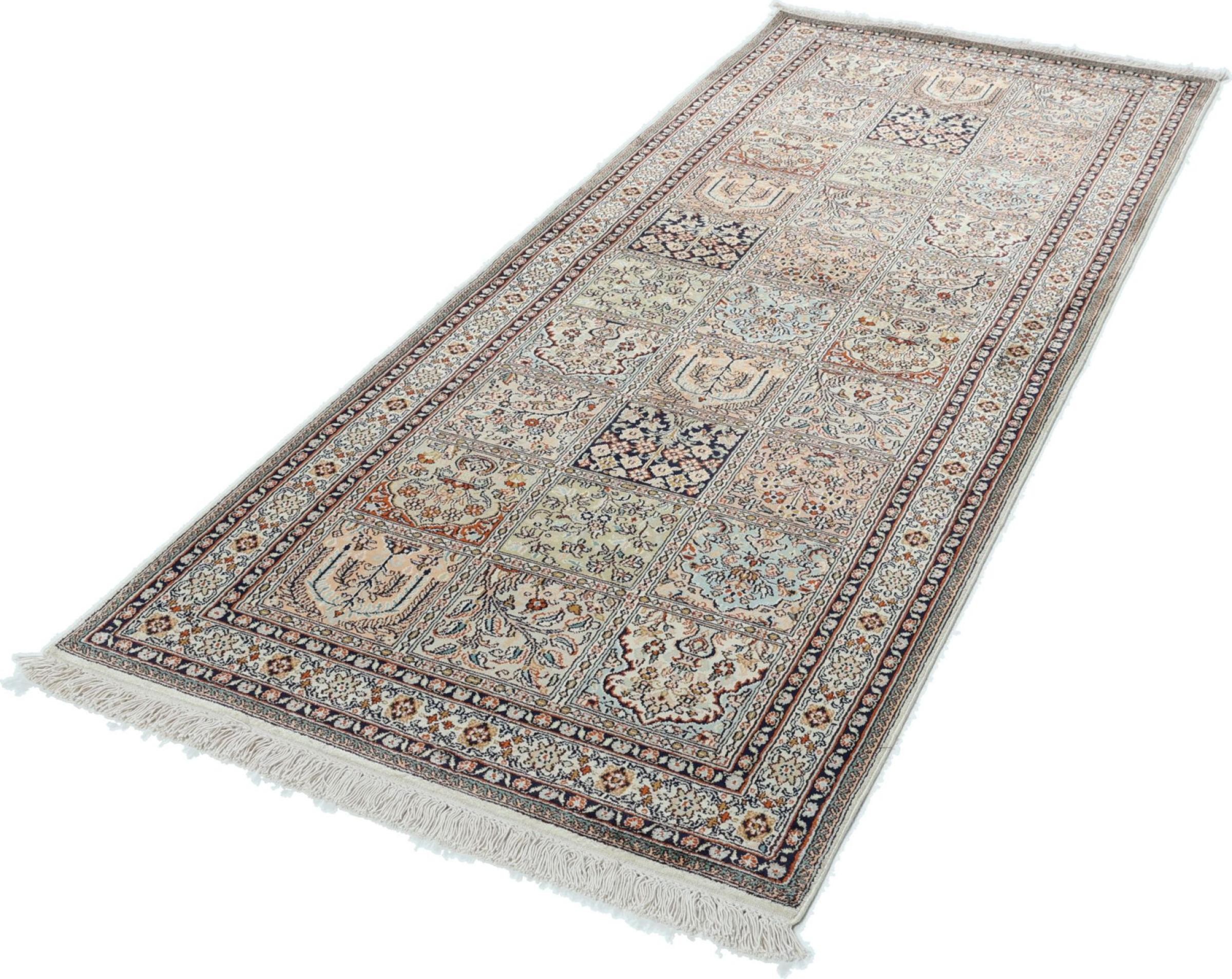 Dit handgeknoopte zijden tapijt uit Kasjmir weerspiegelt de vaardigheid van de Indiase tapijtwevers. Het is niet alleen gemaakt van pure zijde, maar de knoopdichtheid is zo fijn dat alleen zeer ervaren wevers een dergelijk werk kunnen maken. De fijne natuurlijke zijde is een fascinerend hoogtepunt. Het voelt niet alleen bijzonder zacht aan, maar laat ook de kleuren in de meest uiteenlopende facetten schitteren. Afhankelijk van de lichtinval komen compleet nieuwe details en kleuren aan het licht die nog jarenlang indruk zullen maken. Je kunt uren naar zo'n tapijt kijken en de tijd vergeten - een ervaring die niet in een foto is vast te leggen.