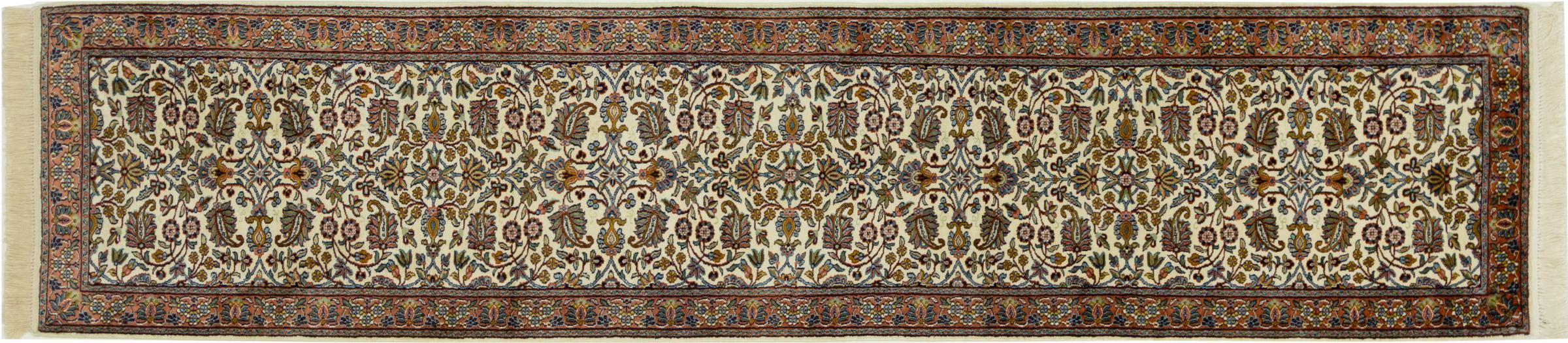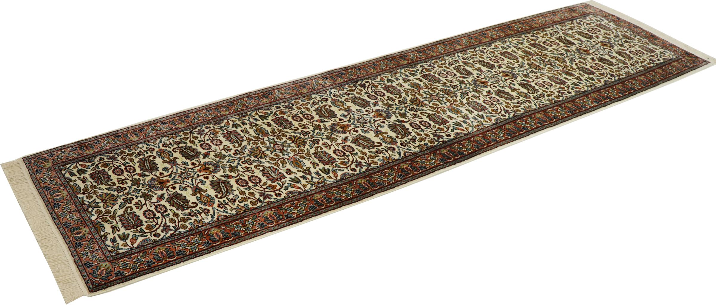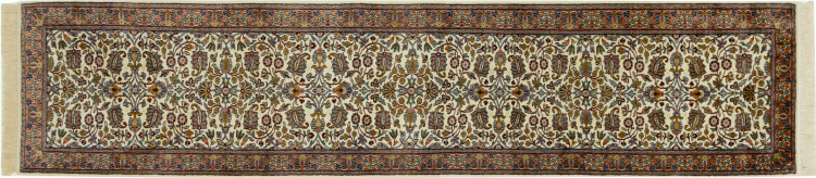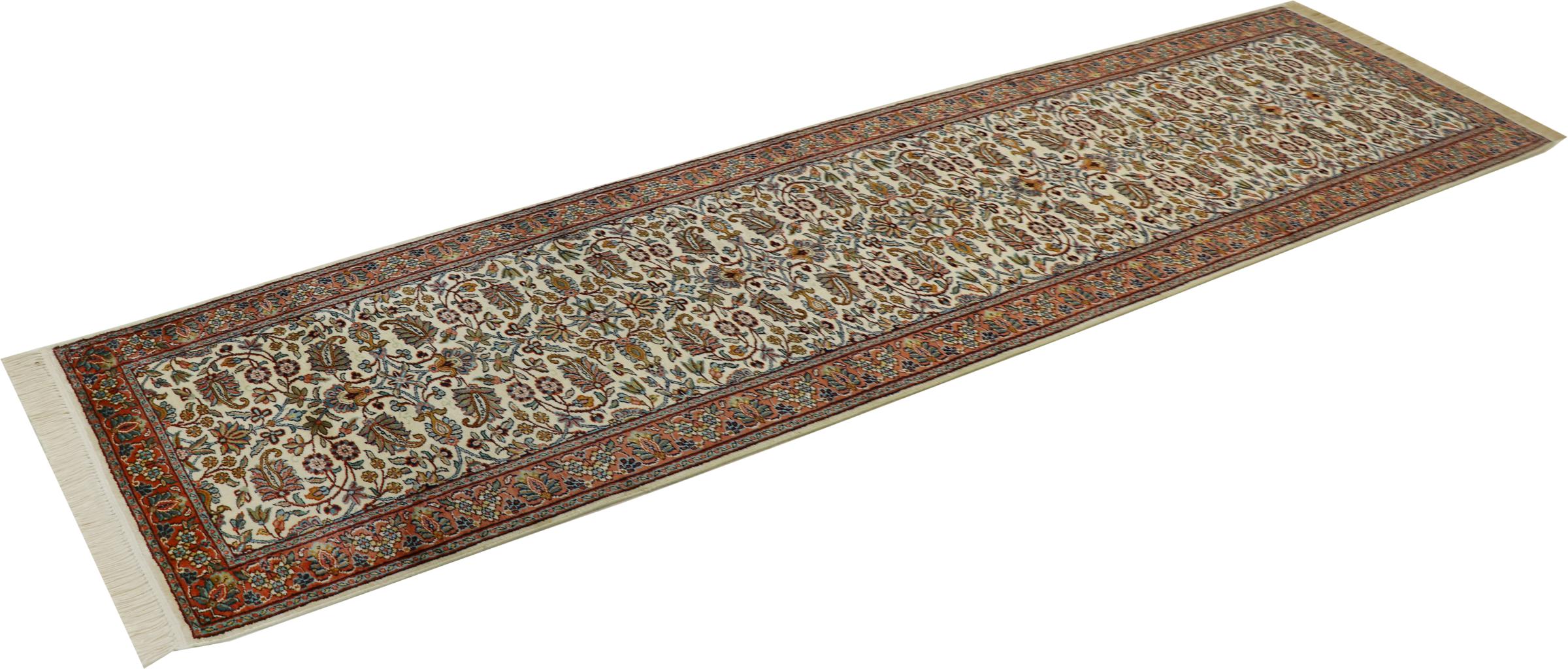 Tapijt ID: 303883004489844 Grootte: 302x67 cm Dikte: ap. 5 mm Knoopdichtheid: 320 000 - 360 000 / m² Verwerking: Handgeknoopte Pool: Zijde Schering: Katoen Oorsprong: India Leeftijd: Nieuw Gewicht: ap. 7 kg Op voorraad: Uniek - Nog maar 1 op voorraad