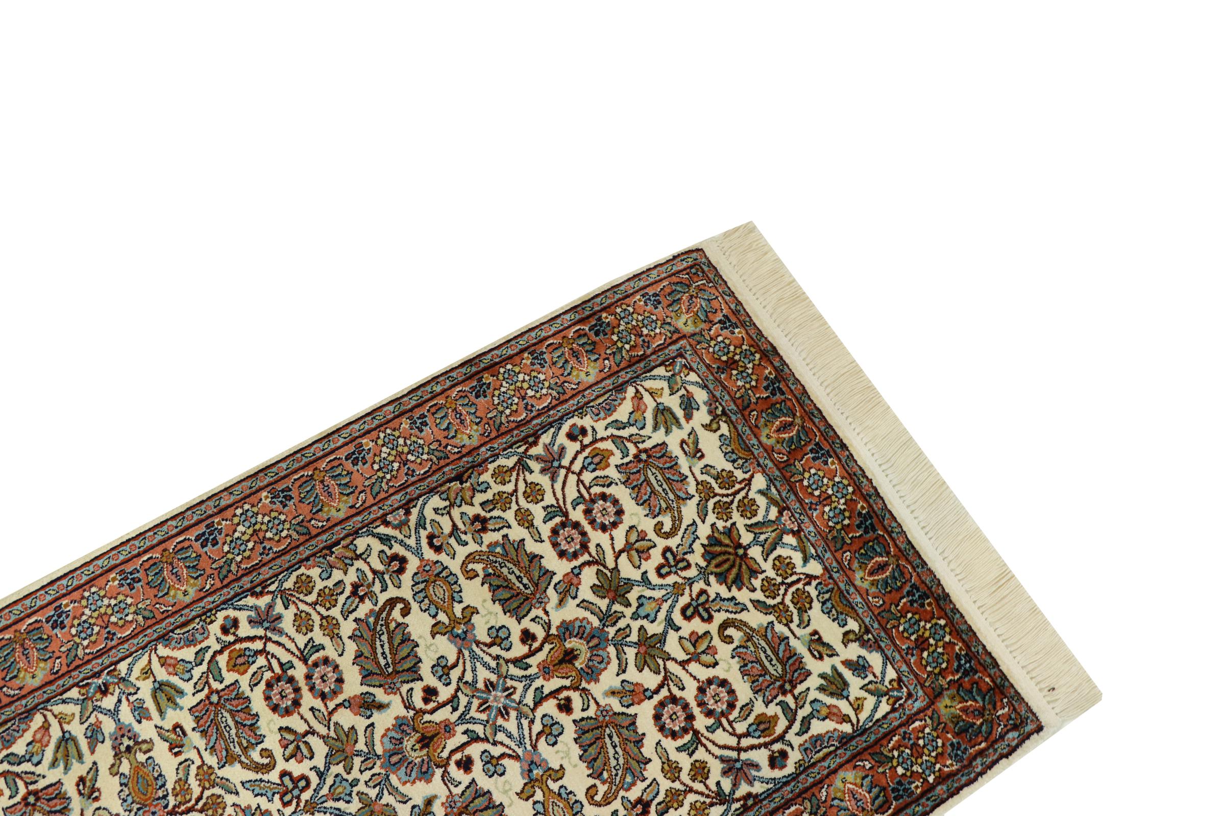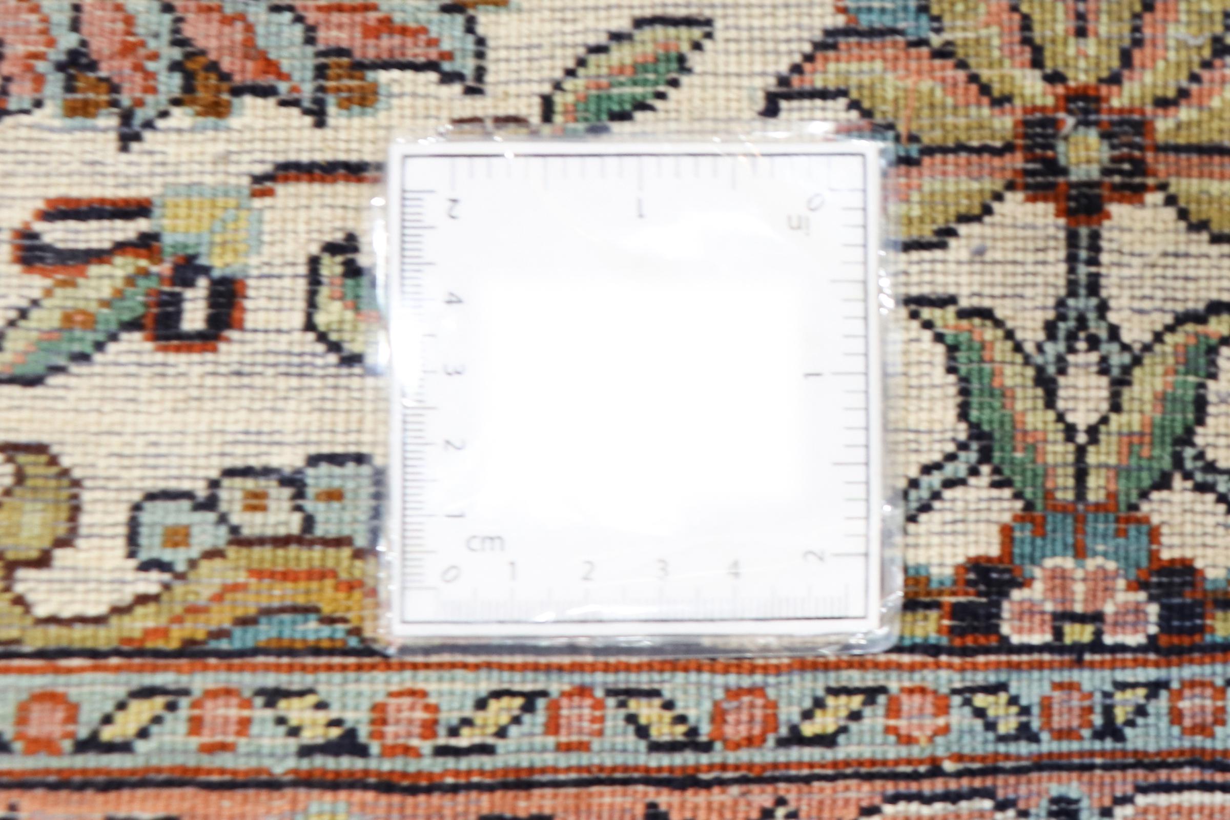Dit handgeknoopte zijden tapijt uit Kasjmir weerspiegelt de vaardigheid van de Indiase tapijtwevers. Het is niet alleen gemaakt van pure zijde, maar de knoopdichtheid is zo fijn dat alleen zeer ervaren wevers een dergelijk werk kunnen maken. De fijne natuurlijke zijde is een fascinerend hoogtepunt. Het voelt niet alleen bijzonder zacht aan, maar laat ook de kleuren in de meest uiteenlopende facetten schitteren. Afhankelijk van de lichtinval komen compleet nieuwe details en kleuren aan het licht die nog jarenlang indruk zullen maken. Je kunt uren naar zo'n tapijt kijken en de tijd vergeten - een ervaring die niet in een foto is vast te leggen.