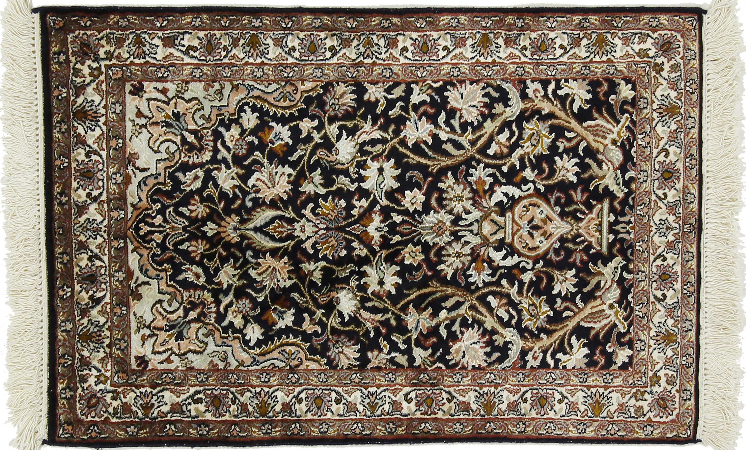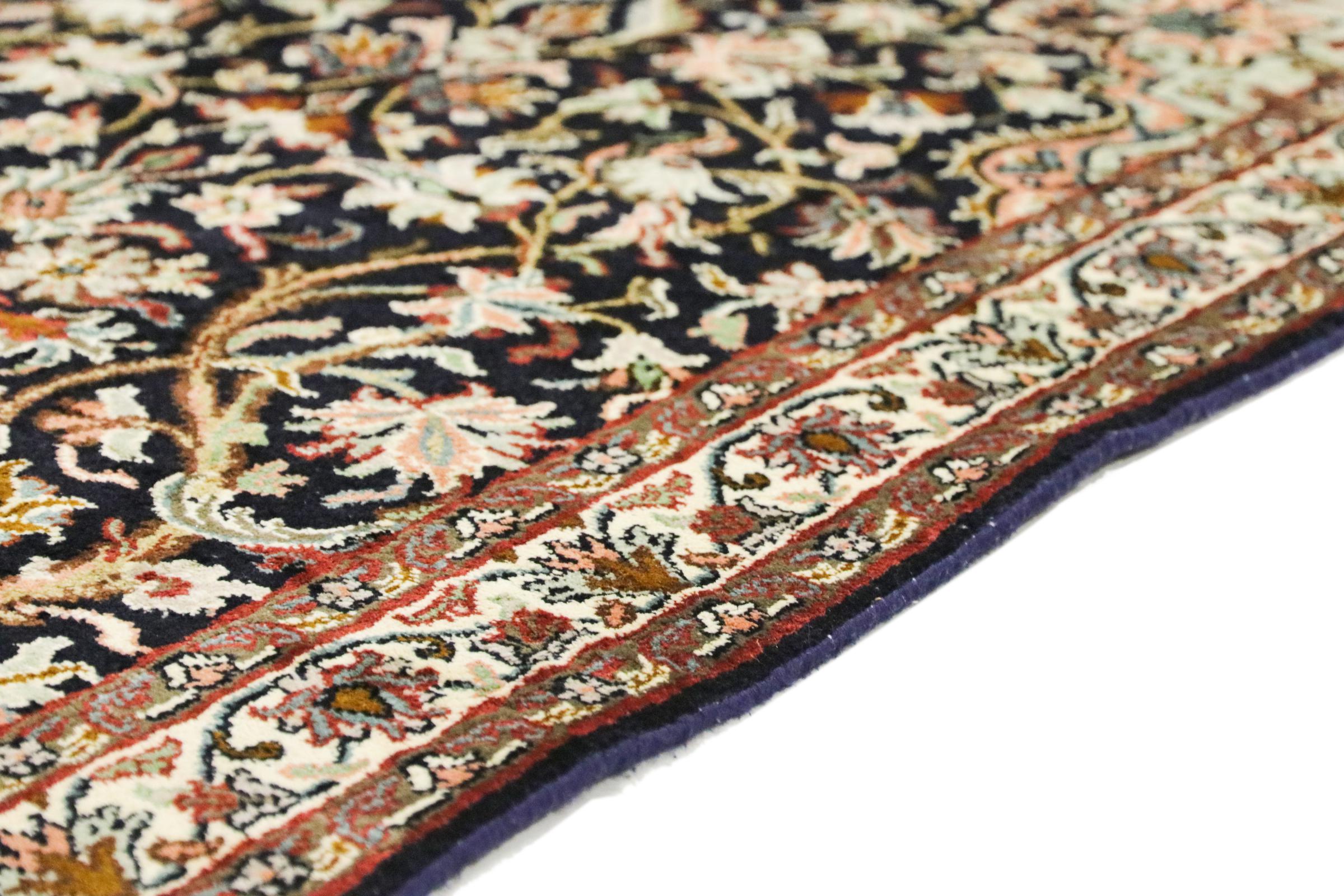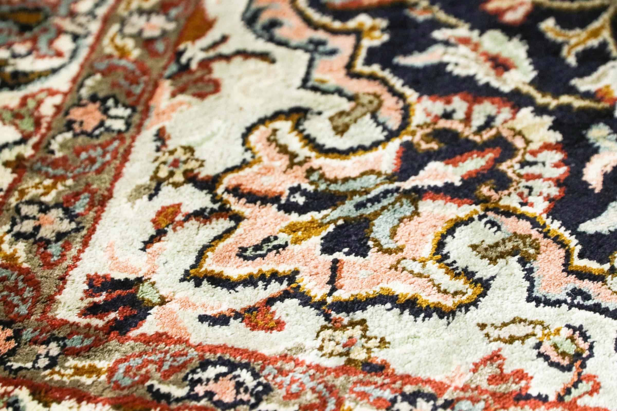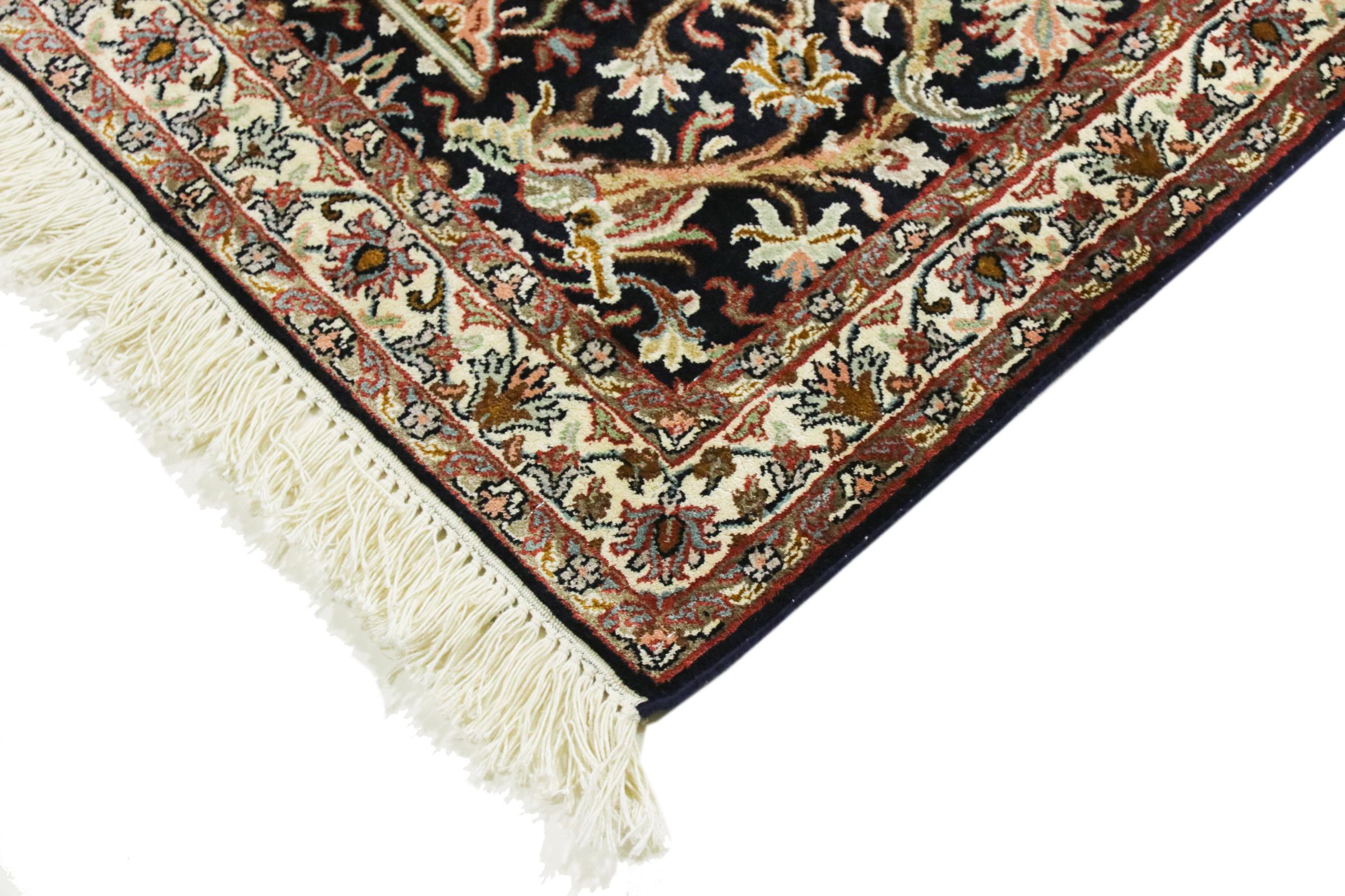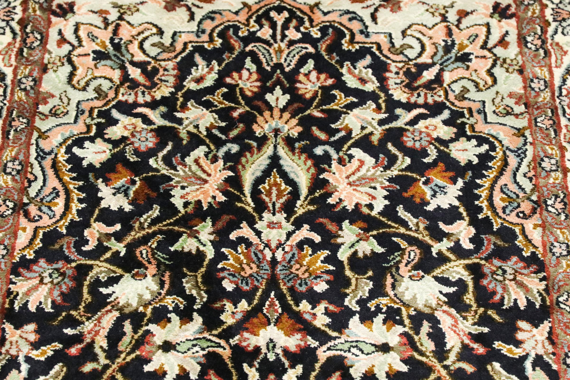 Dit handgeknoopte zijden tapijt uit Kasjmir weerspiegelt de vaardigheid van de Indiase tapijtwevers. Het is niet alleen gemaakt van pure zijde, maar de knoopdichtheid is zo fijn dat alleen zeer ervaren wevers een dergelijk werk kunnen maken. De fijne natuurlijke zijde is een fascinerend hoogtepunt. Het voelt niet alleen bijzonder zacht aan, maar laat ook de kleuren in de meest uiteenlopende facetten schitteren. Afhankelijk van de lichtinval komen compleet nieuwe details en kleuren aan het licht die nog jarenlang indruk zullen maken. Je kunt uren naar zo'n tapijt kijken en de tijd vergeten - een ervaring die niet in een foto is vast te leggen.