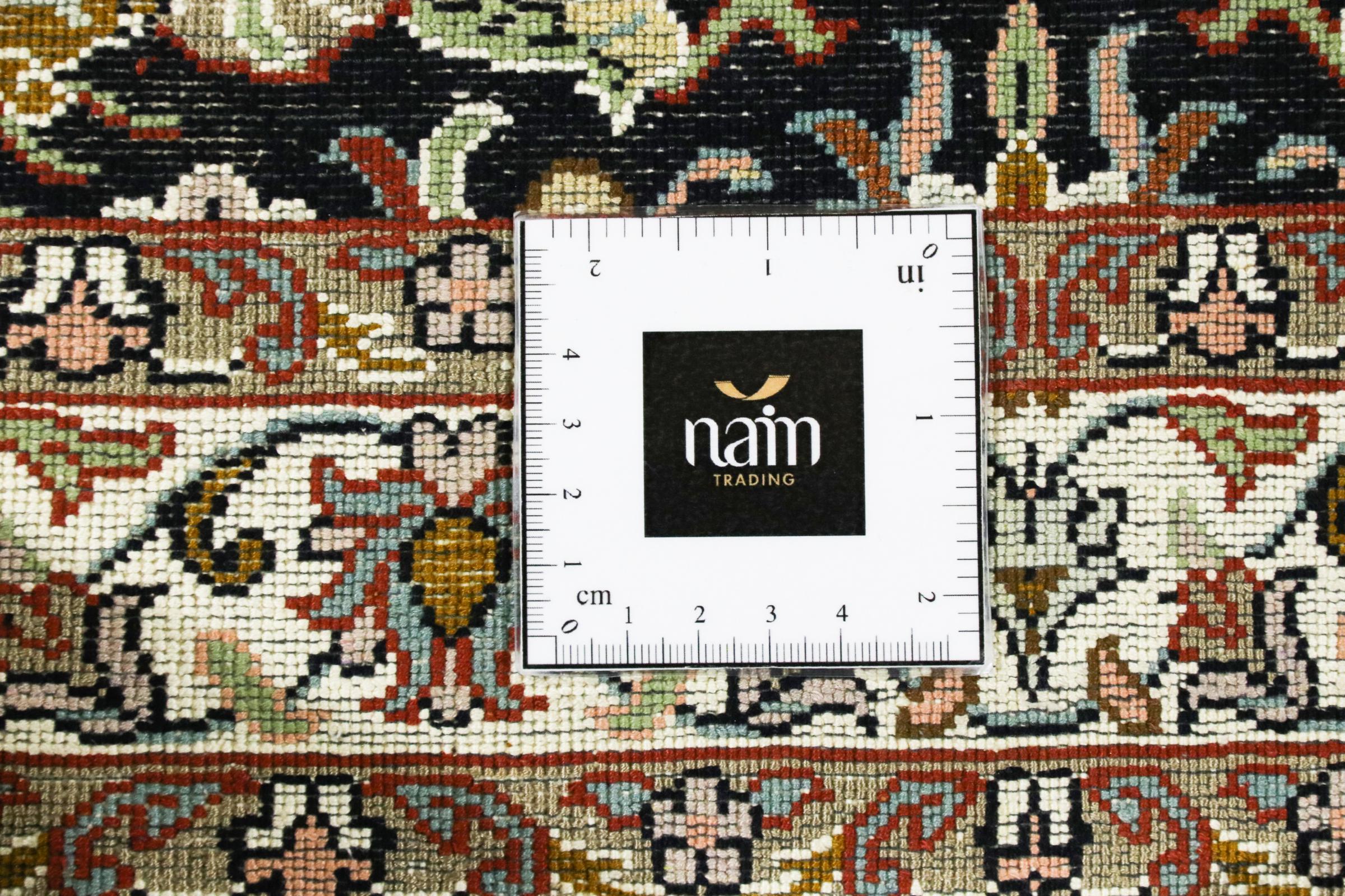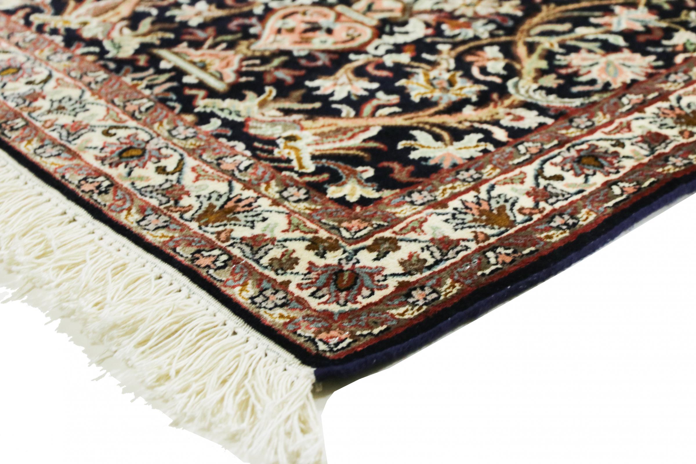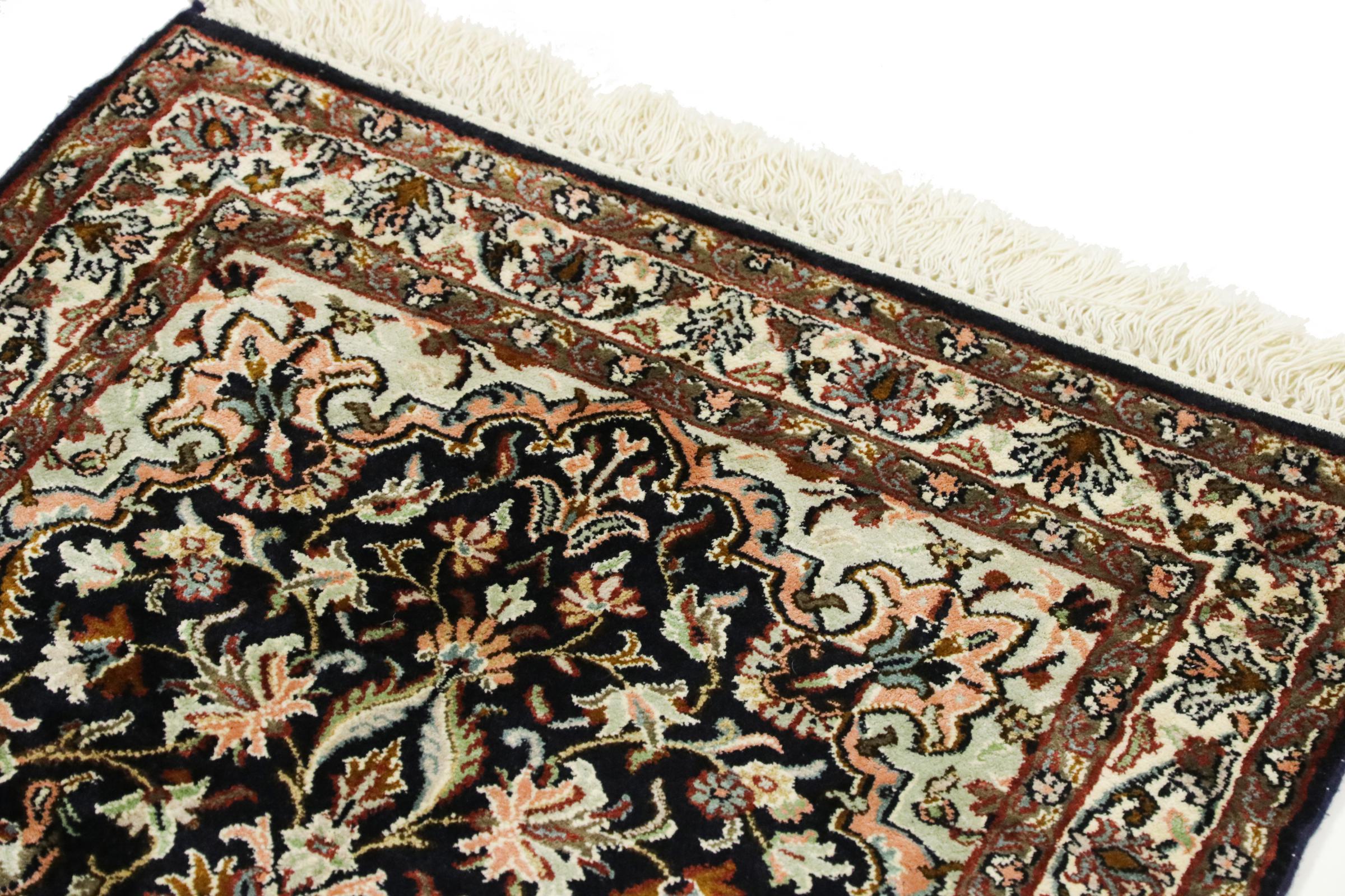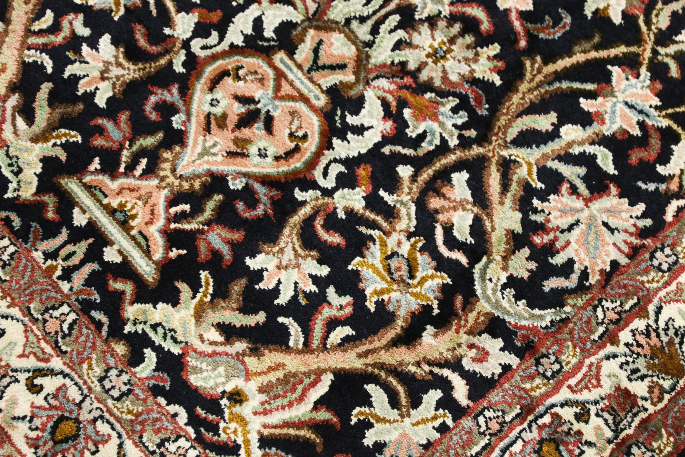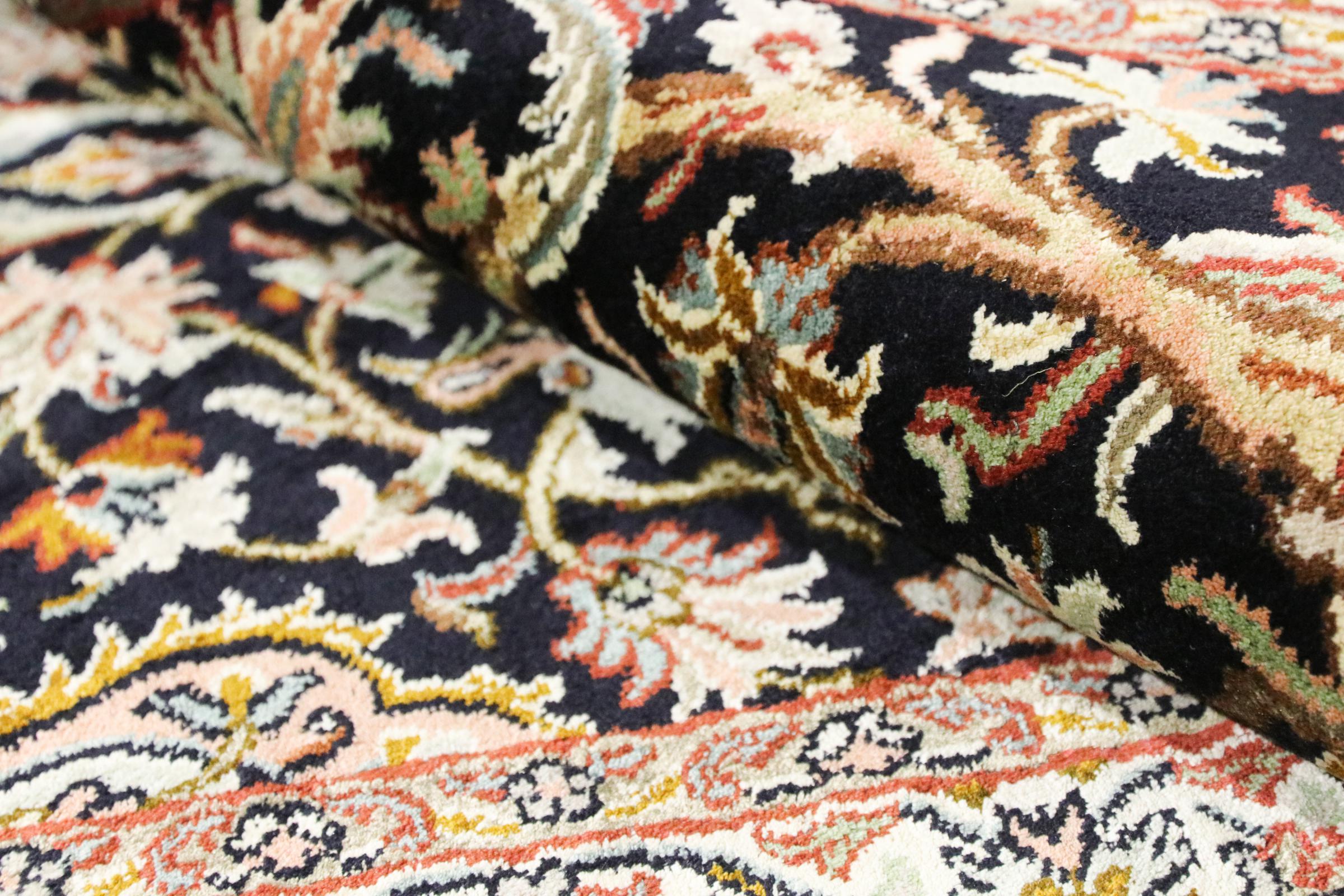 Dit handgeknoopte zijden tapijt uit Kasjmir weerspiegelt de vaardigheid van de Indiase tapijtwevers. Het is niet alleen gemaakt van pure zijde, maar de knoopdichtheid is zo fijn dat alleen zeer ervaren wevers een dergelijk werk kunnen maken. De fijne natuurlijke zijde is een fascinerend hoogtepunt. Het voelt niet alleen bijzonder zacht aan, maar laat ook de kleuren in de meest uiteenlopende facetten schitteren. Afhankelijk van de lichtinval komen compleet nieuwe details en kleuren aan het licht die nog jarenlang indruk zullen maken. Je kunt uren naar zo'n tapijt kijken en de tijd vergeten - een ervaring die niet in een foto is vast te leggen.