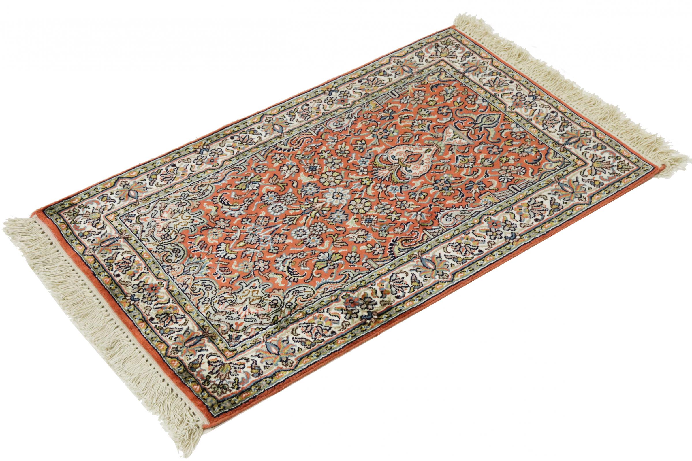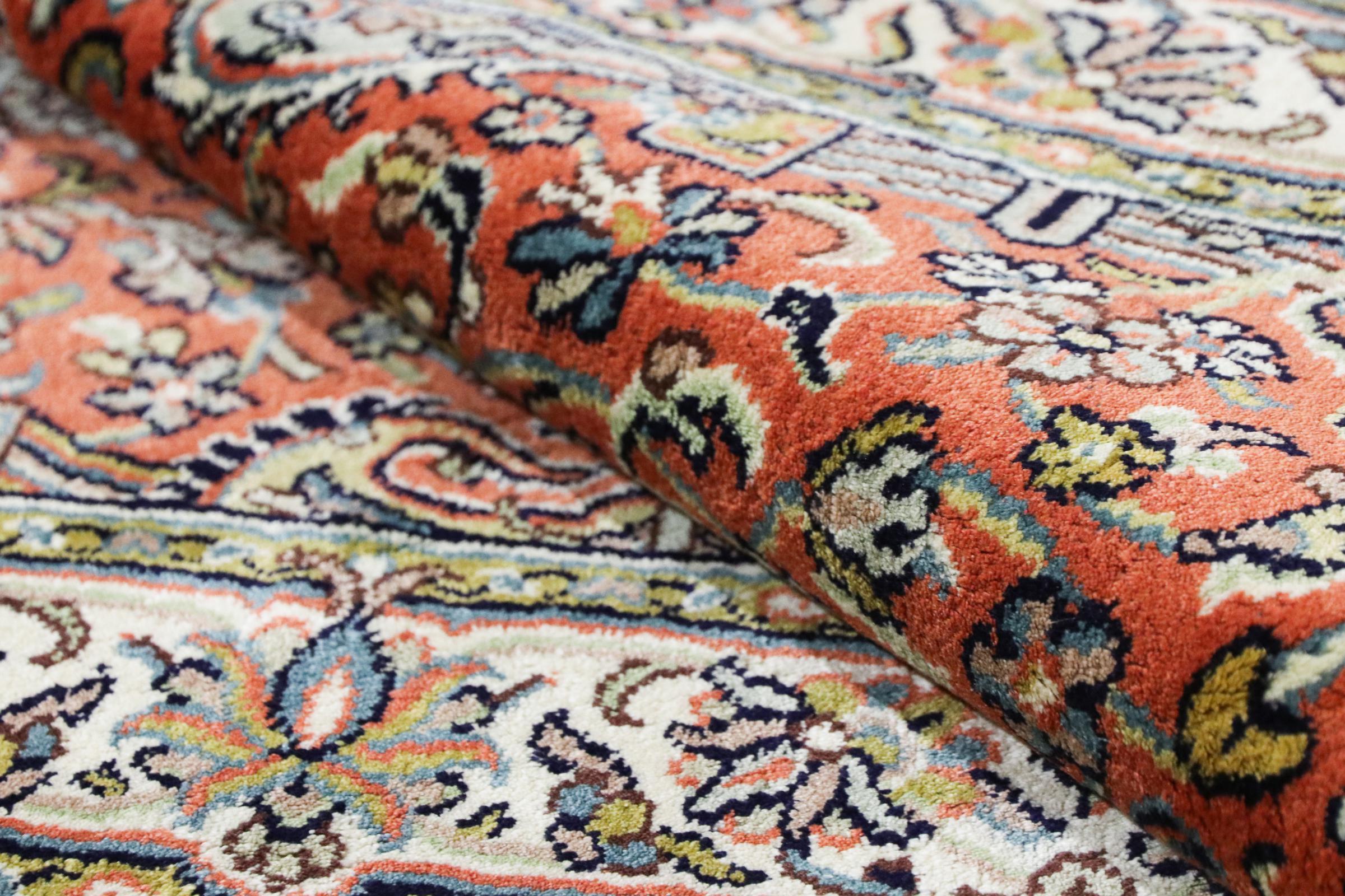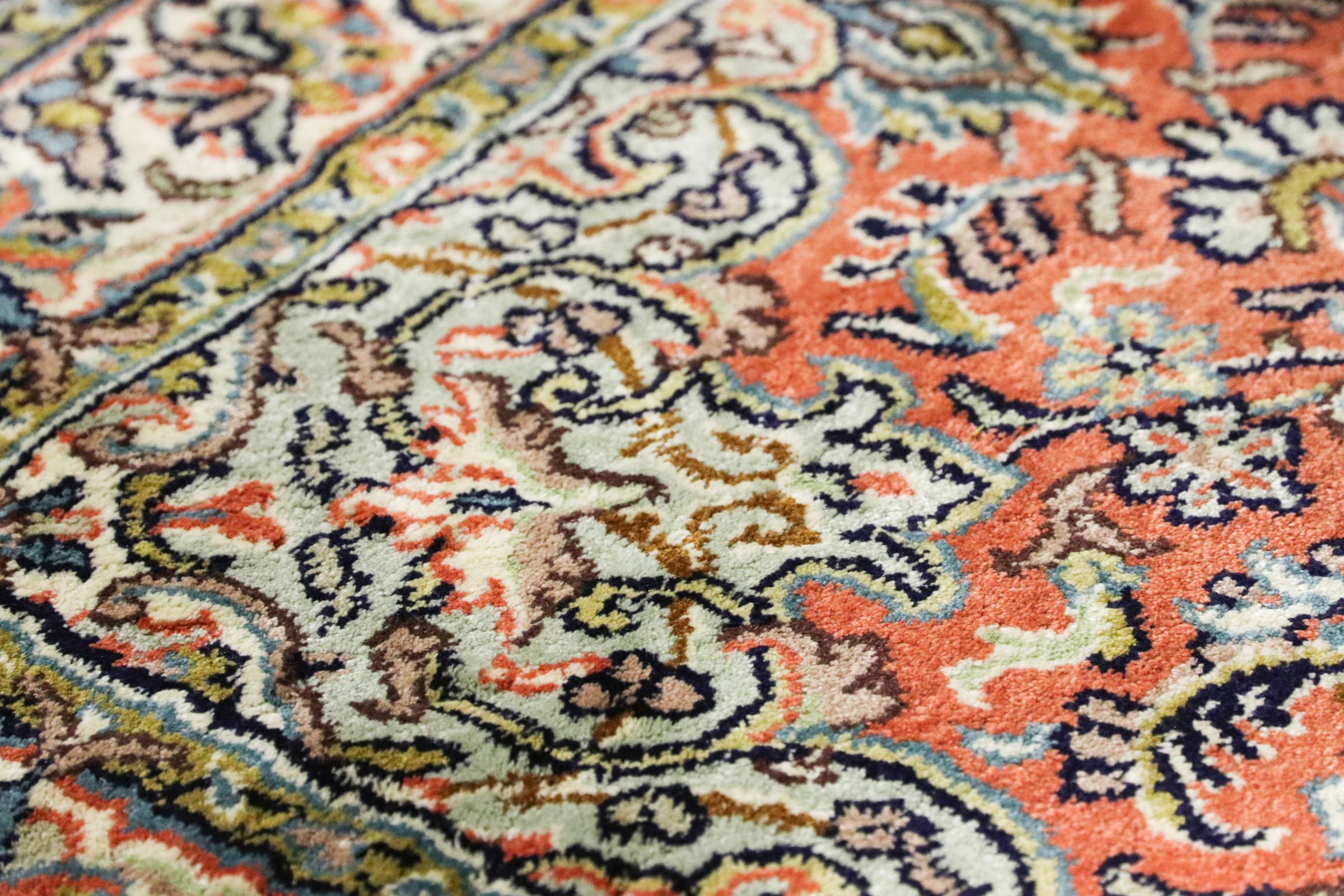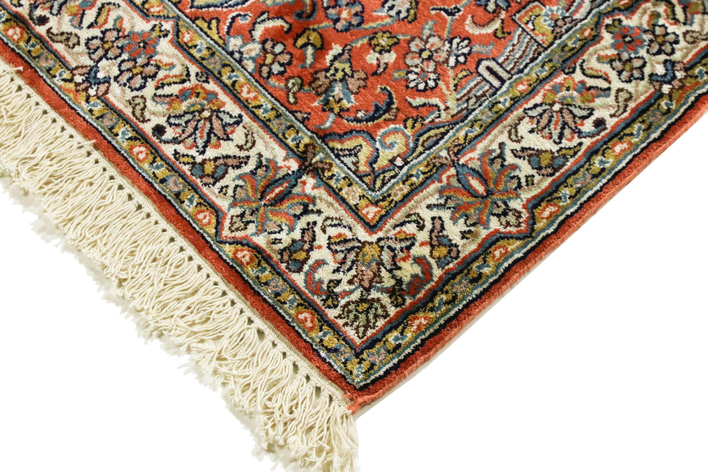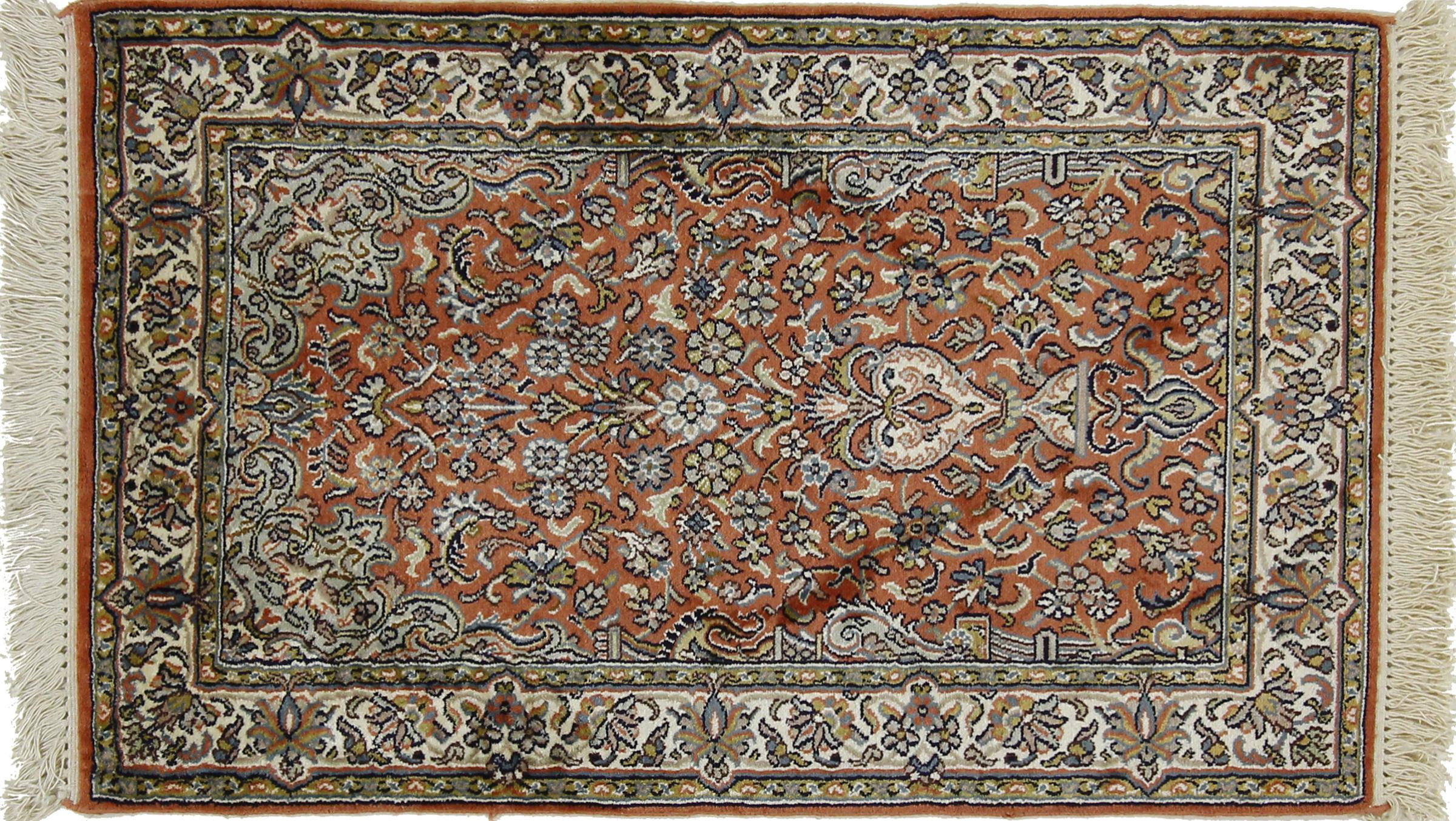 Dit handgeknoopte zijden tapijt uit Kasjmir weerspiegelt de vaardigheid van de Indiase tapijtwevers. Het is niet alleen gemaakt van pure zijde, maar de knoopdichtheid is zo fijn dat alleen zeer ervaren wevers een dergelijk werk kunnen maken. De fijne natuurlijke zijde is een fascinerend hoogtepunt. Het voelt niet alleen bijzonder zacht aan, maar laat ook de kleuren in de meest uiteenlopende facetten schitteren. Afhankelijk van de lichtinval komen compleet nieuwe details en kleuren aan het licht die nog jarenlang indruk zullen maken. Je kunt uren naar zo'n tapijt kijken en de tijd vergeten - een ervaring die niet in een foto is vast te leggen.