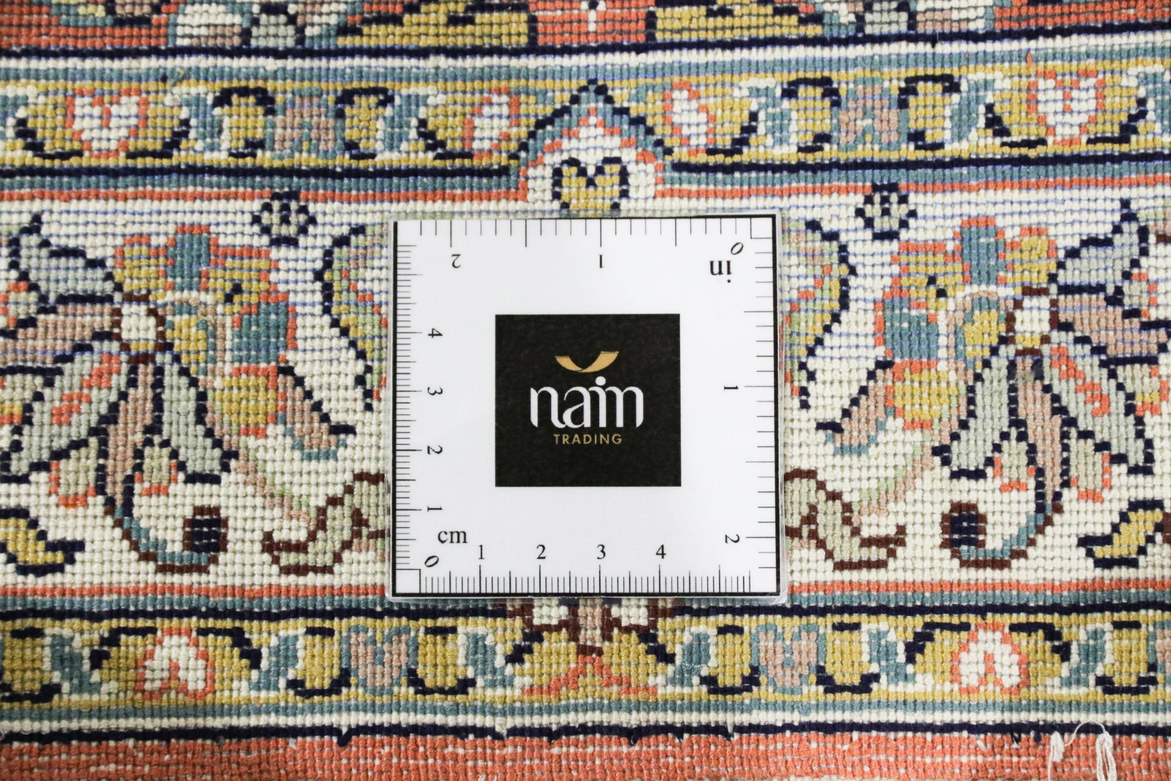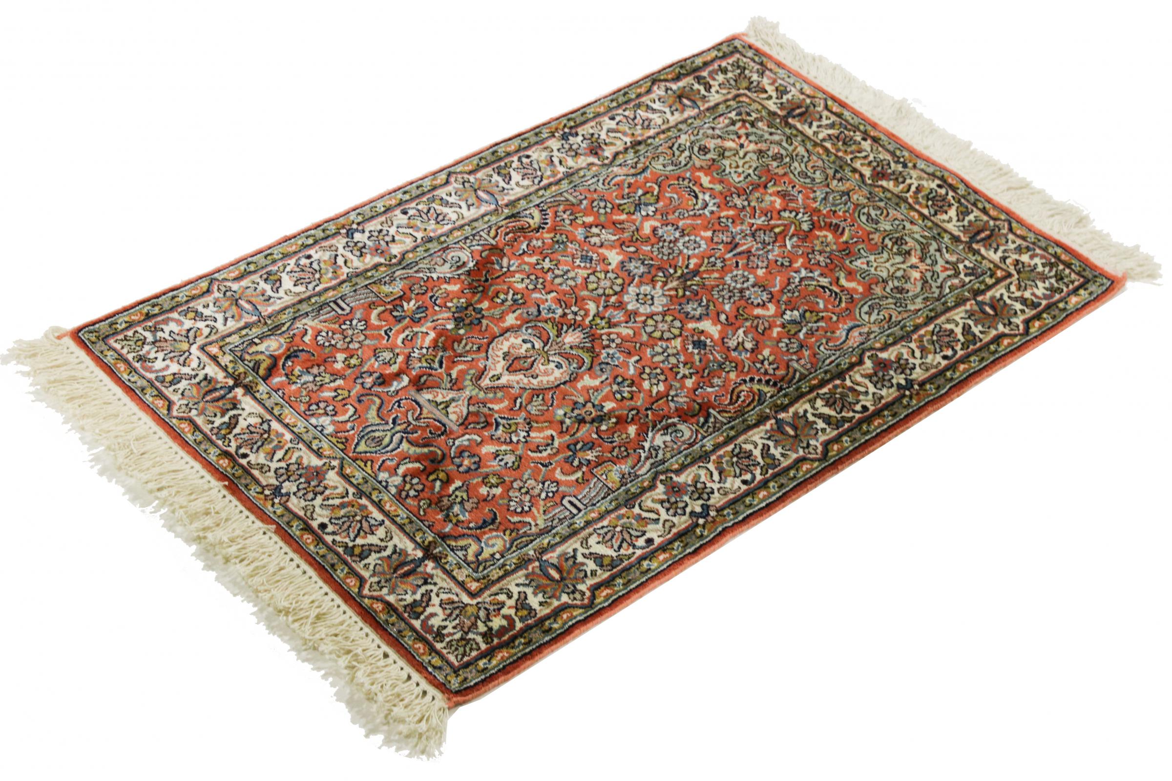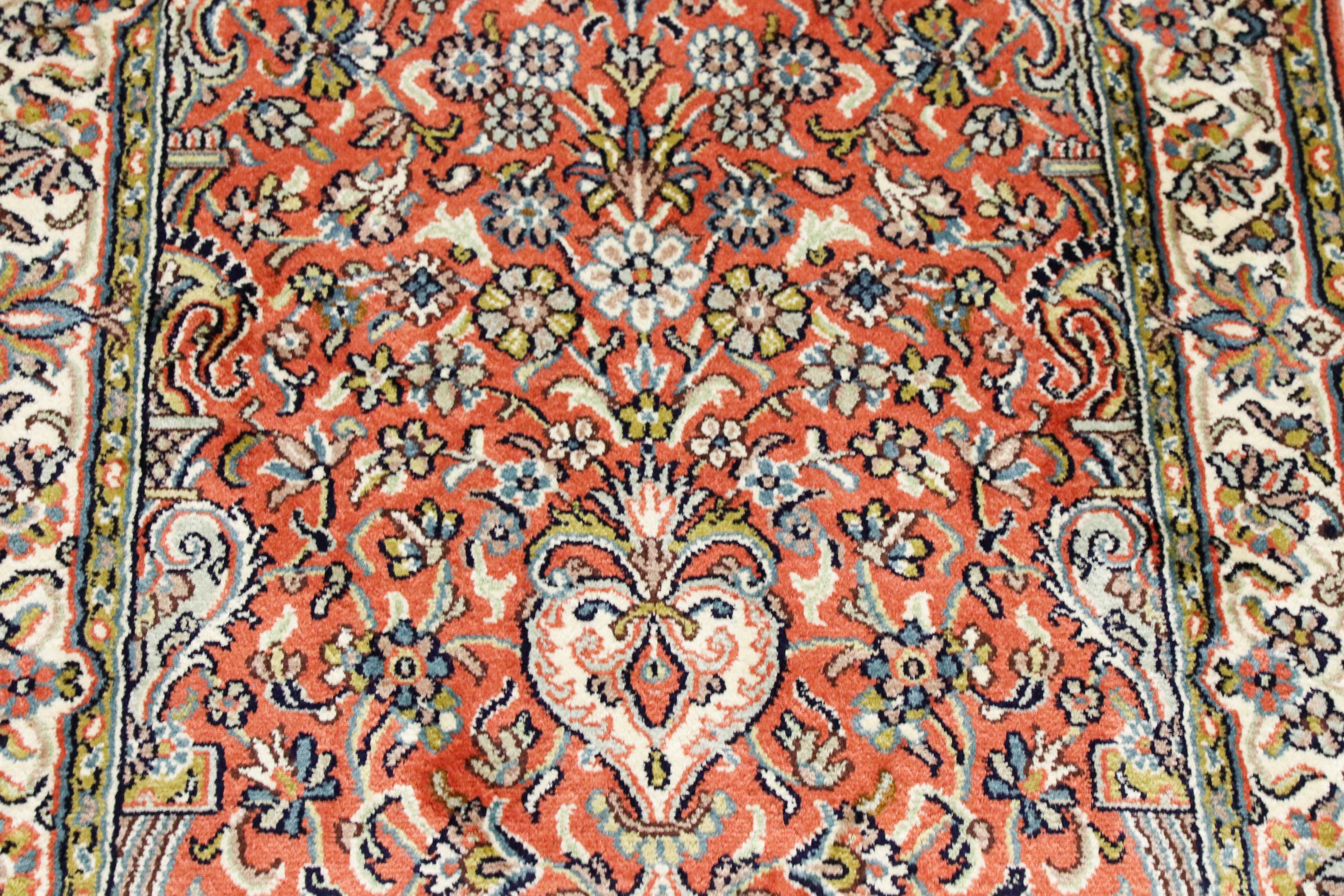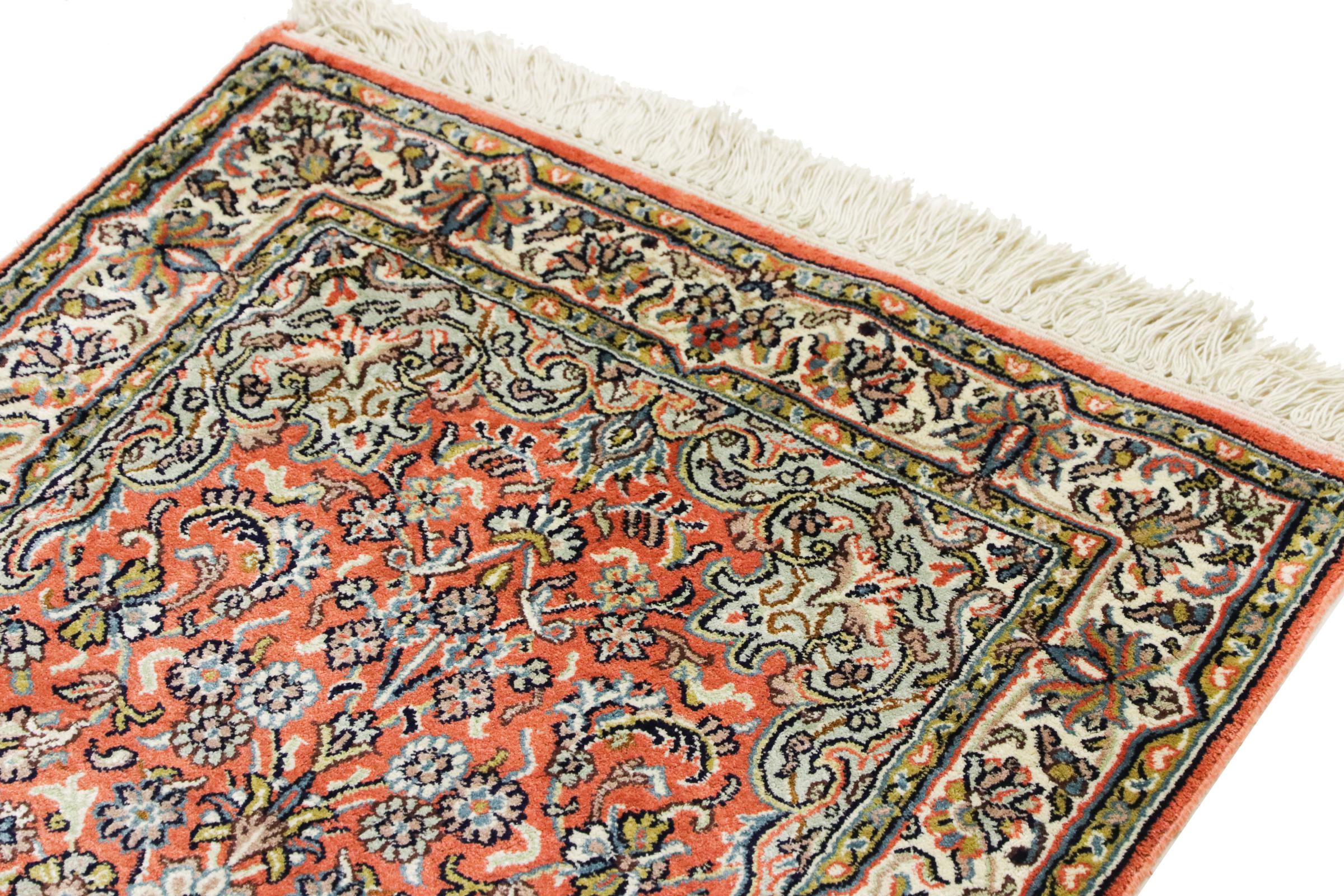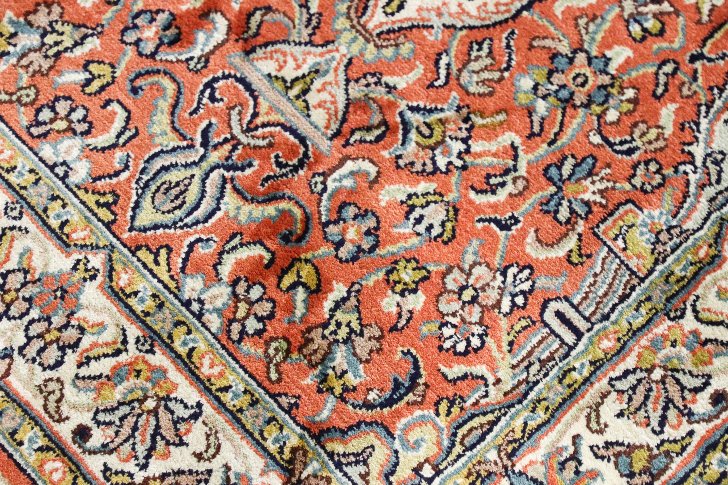 Dit handgeknoopte zijden tapijt uit Kasjmir weerspiegelt de vaardigheid van de Indiase tapijtwevers. Het is niet alleen gemaakt van pure zijde, maar de knoopdichtheid is zo fijn dat alleen zeer ervaren wevers een dergelijk werk kunnen maken. De fijne natuurlijke zijde is een fascinerend hoogtepunt. Het voelt niet alleen bijzonder zacht aan, maar laat ook de kleuren in de meest uiteenlopende facetten schitteren. Afhankelijk van de lichtinval komen compleet nieuwe details en kleuren aan het licht die nog jarenlang indruk zullen maken. Je kunt uren naar zo'n tapijt kijken en de tijd vergeten - een ervaring die niet in een foto is vast te leggen.