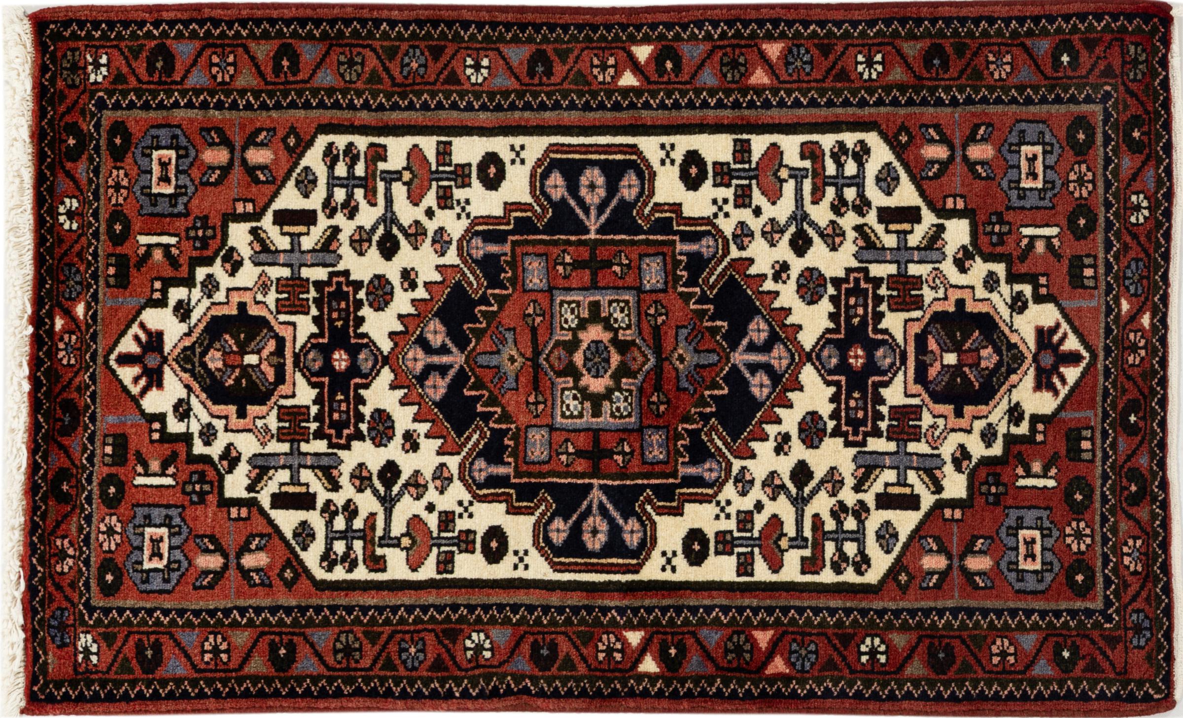 Tapijt ID: 29733200437516 Grootte: 124x77 cm Dikte: ap. 10 mm Knoopdichtheid: 128 000 - 160 000 / m² Verwerking: Handgeknoopte Pool: Wol Schering: Katoen Oorsprong: Perzië / Iran Leeftijd: 20-30 jaar (Nieuw) Gewicht: ap. 3 kg Op voorraad: Uniek - Nog maar 1 op voorraad