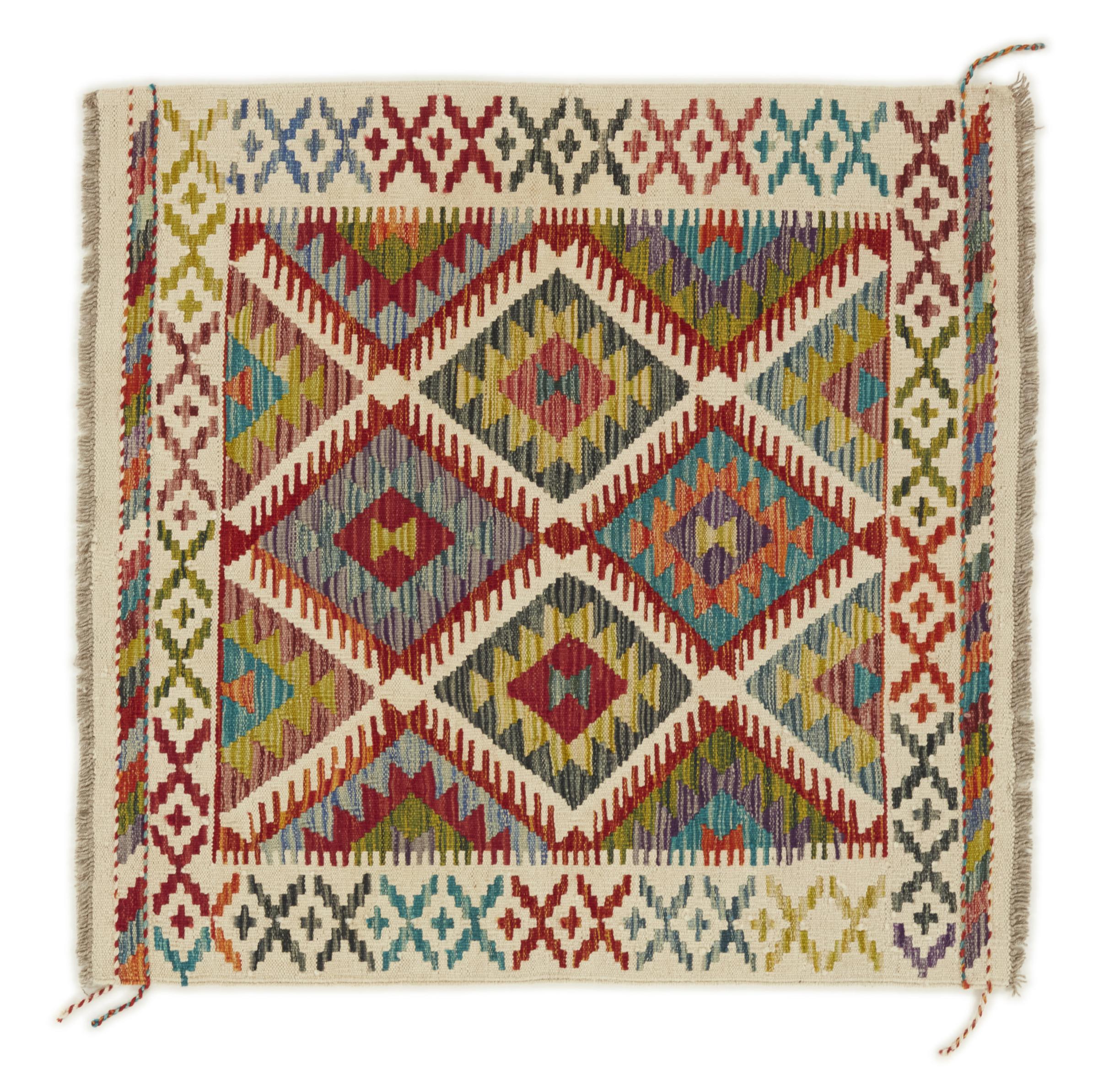 Tapijt ID: 299573004299497 Grootte: 105x103 cm Dikte: ap. 3 mm Verwerking: Handgeweven Pool: Hand gesponnen wol Schering: Wol Oorsprong: Afghanistan Leeftijd: Nieuw Gewicht: ap. 2 kg Op voorraad: Uniek - Nog maar 1 op voorraad
