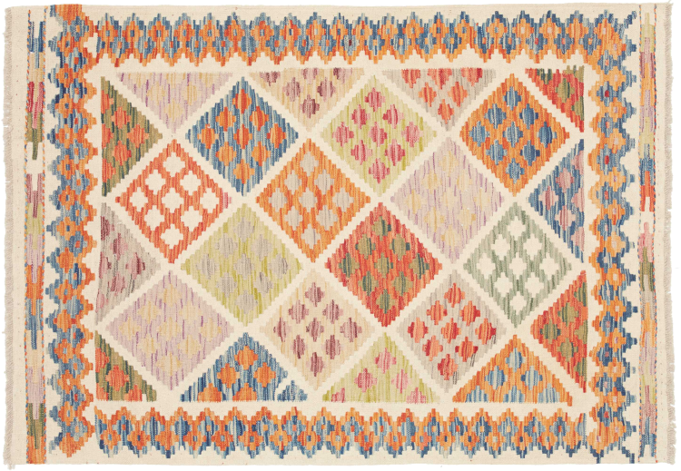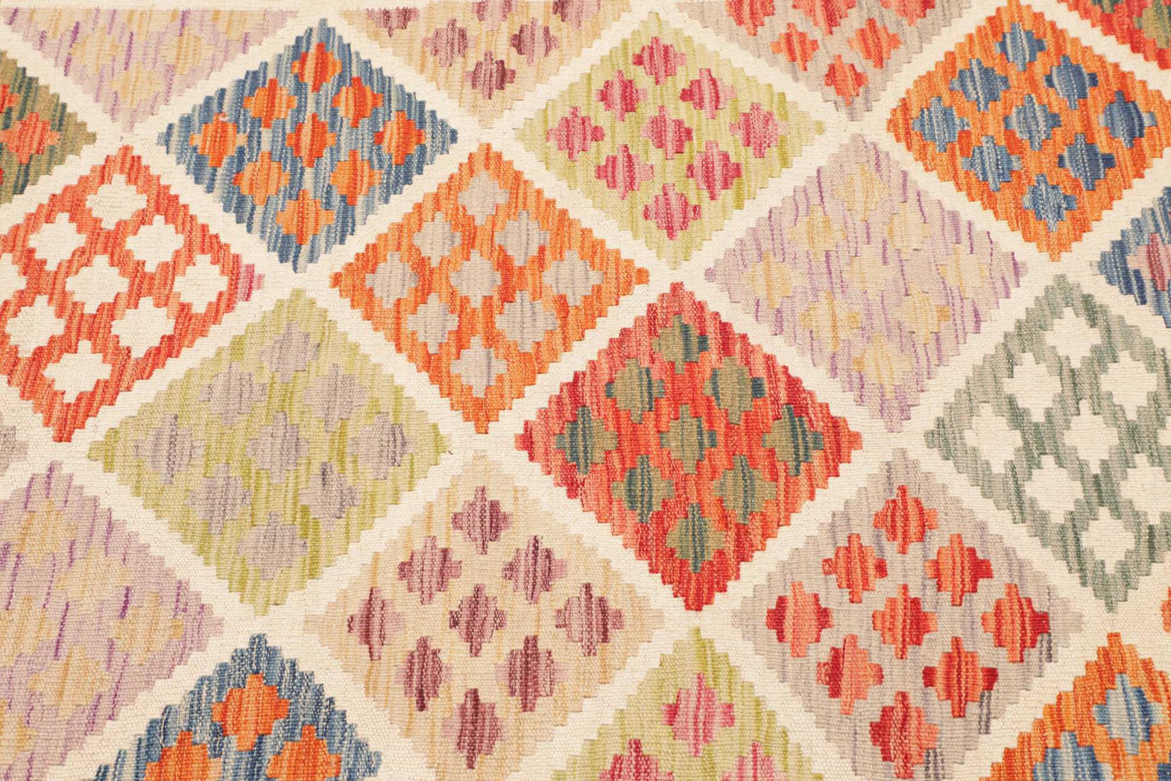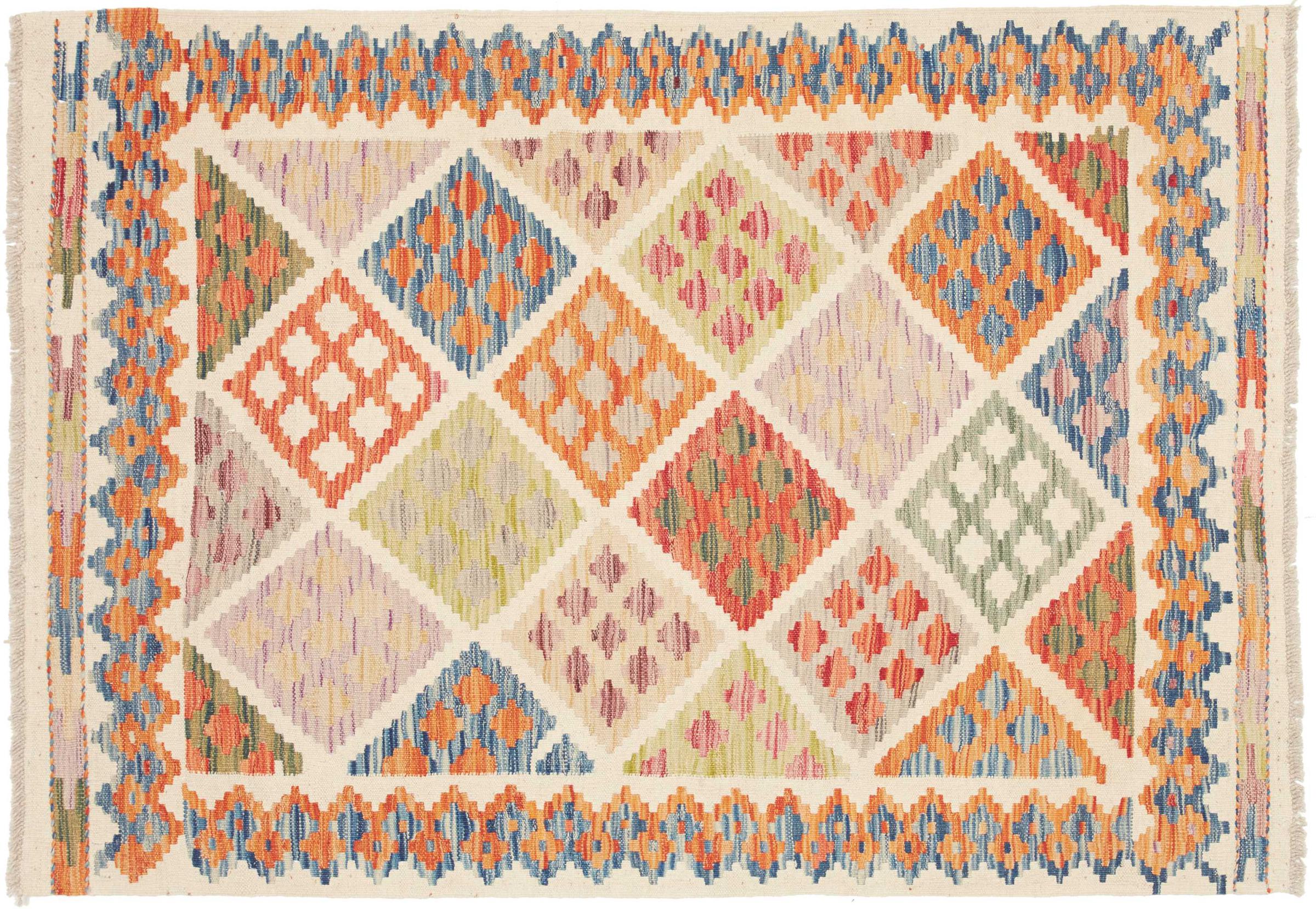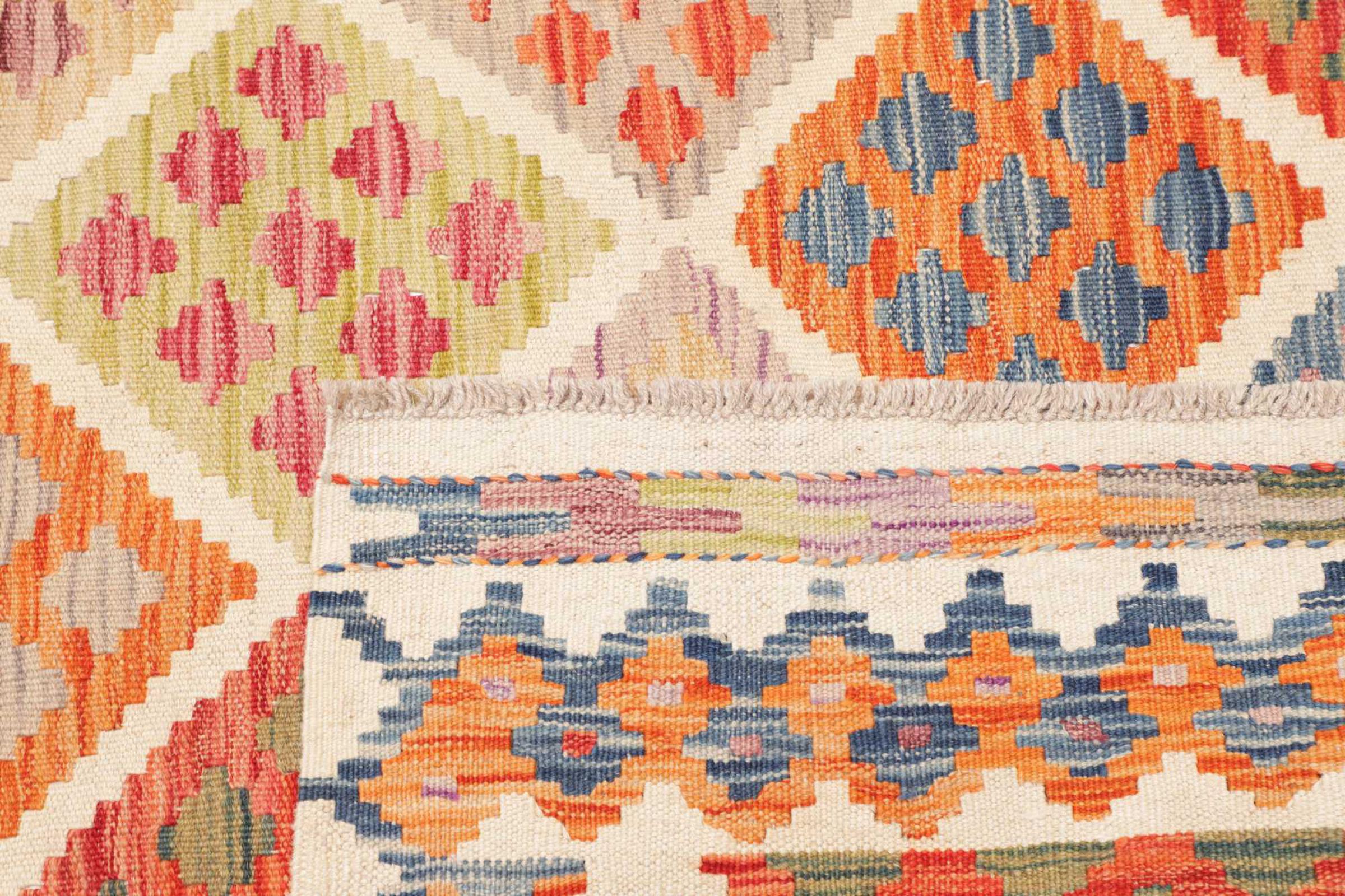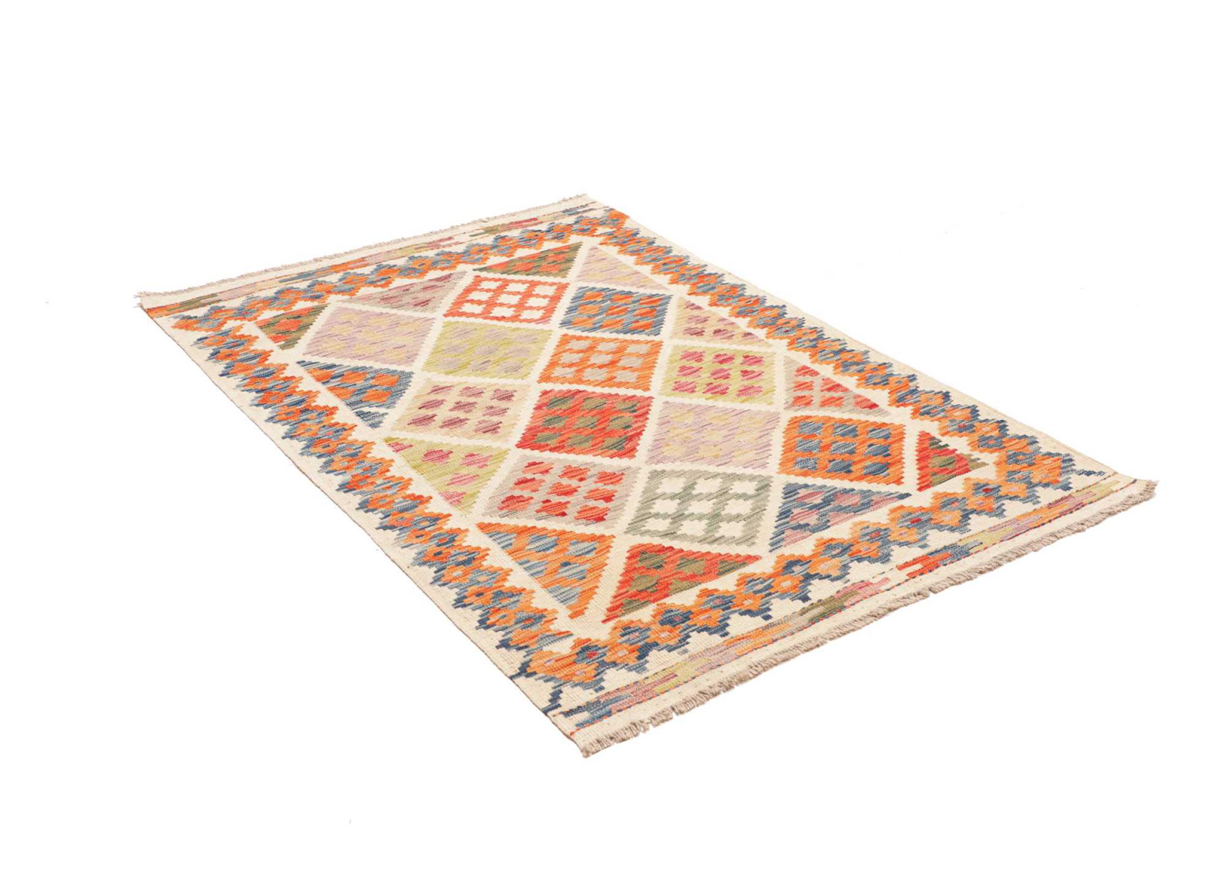 Deze handgeweven kilim Afghan is prachtig door de veelzijdige kleuren en het typische patroon. Het is handgeweven in Afghanistan van 100% schapenwol. Het is ongetwijfeld robuuster en duurzamer dan machinaal vervaardigde tapijten. Daarnaast heeft deze kelim een ​​heel eigen karakter. Een uniek stuk voor jou en je huis dat je nooit meer zult vinden.