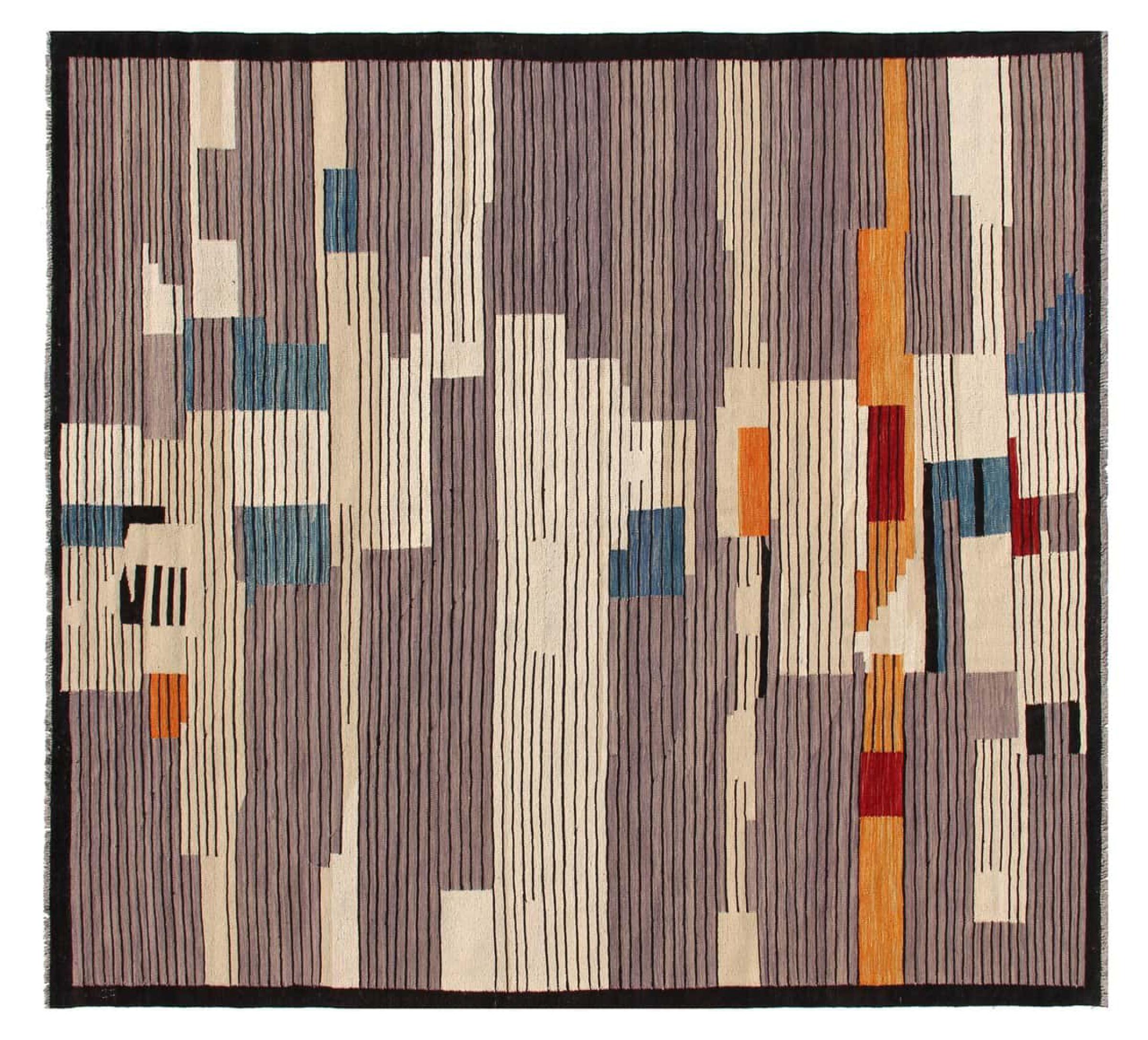 Dit tapijt is met de hand gemaakt op een weefgetouw als plat weefgetouw. Flatweave is de term die wordt gebruikt om tapijten zonder pool te beschrijven. Zoals de naam al belooft, zijn deze tapijten geweven en niet geknoopt. Dit resulteert in een vlak tapijt met een gestructureerd oppervlak. Platweefsels zijn niet zo zacht en meestal dunner dan geknoopte tapijten. Tegelijkertijd zijn ze veel minder complex te vervaardigen en kunnen ze meestal aan beide zijden (voor- en achterkant) worden gelegd. Hun patronen zijn meestal geometrisch, wat wordt bepaald door de stof.