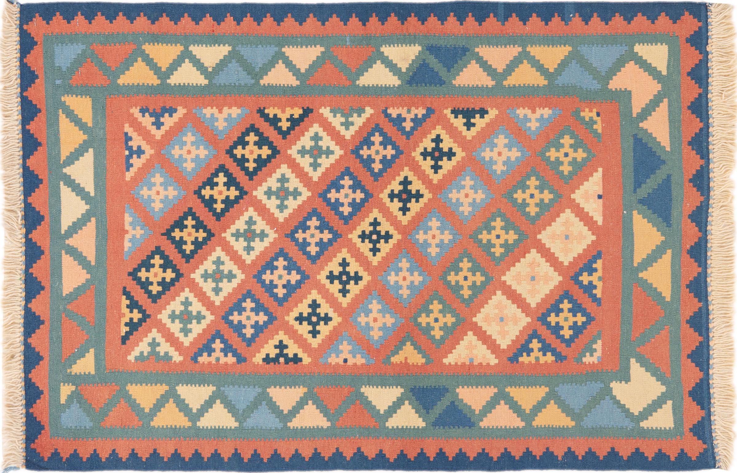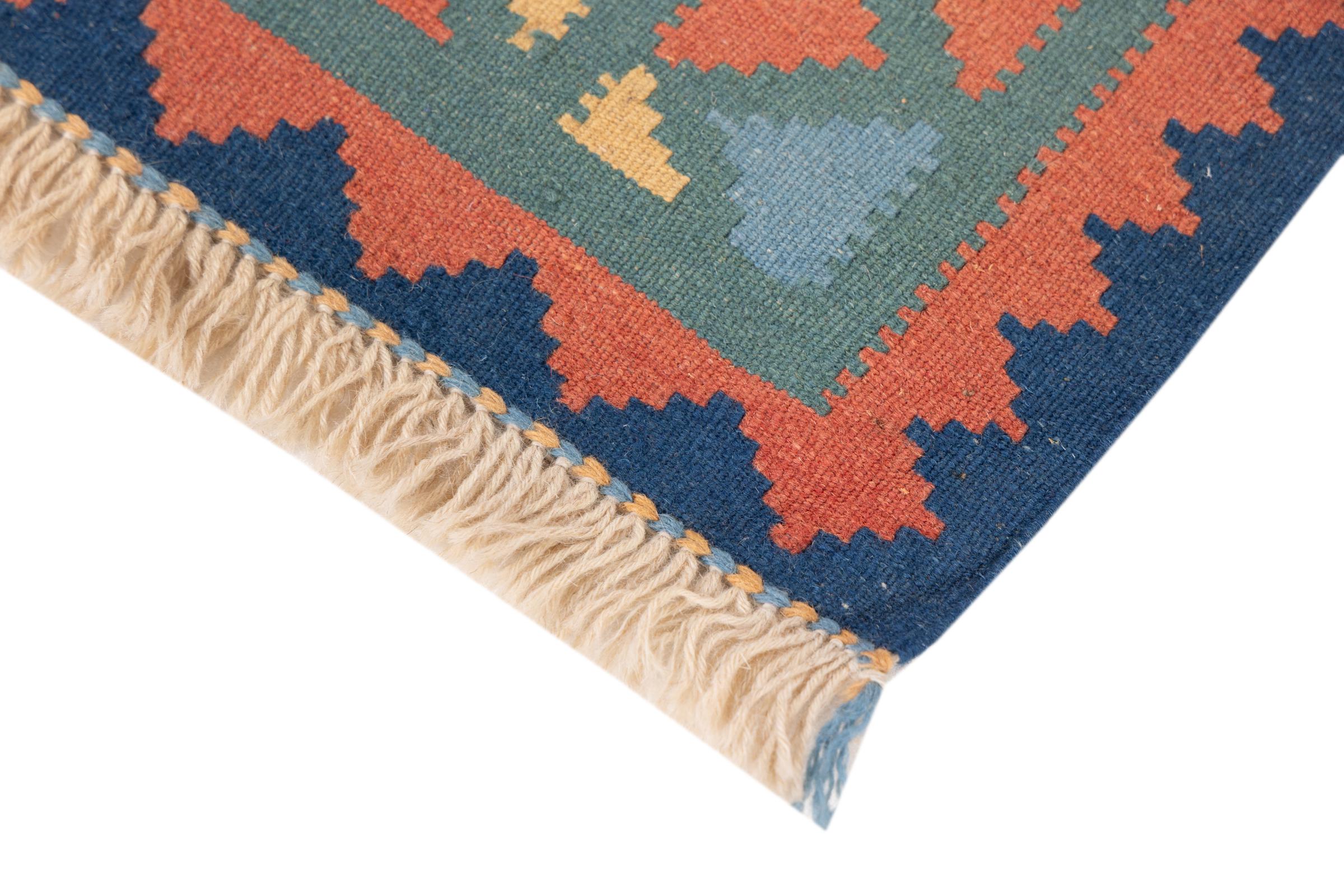 Dit tapijt is met de hand gemaakt op een weefgetouw als plat weefgetouw. Flatweave is de term die wordt gebruikt om tapijten zonder pool te beschrijven. Zoals de naam al belooft, zijn deze tapijten geweven en niet geknoopt. Dit resulteert in een vlak tapijt met een gestructureerd oppervlak. Platweefsels zijn niet zo zacht en meestal dunner dan geknoopte tapijten. Tegelijkertijd zijn ze veel minder complex te vervaardigen en kunnen ze meestal aan beide zijden (voor- en achterkant) worden gelegd. Hun patronen zijn meestal geometrisch, wat wordt bepaald door de stof.