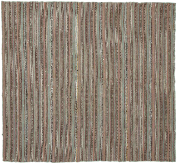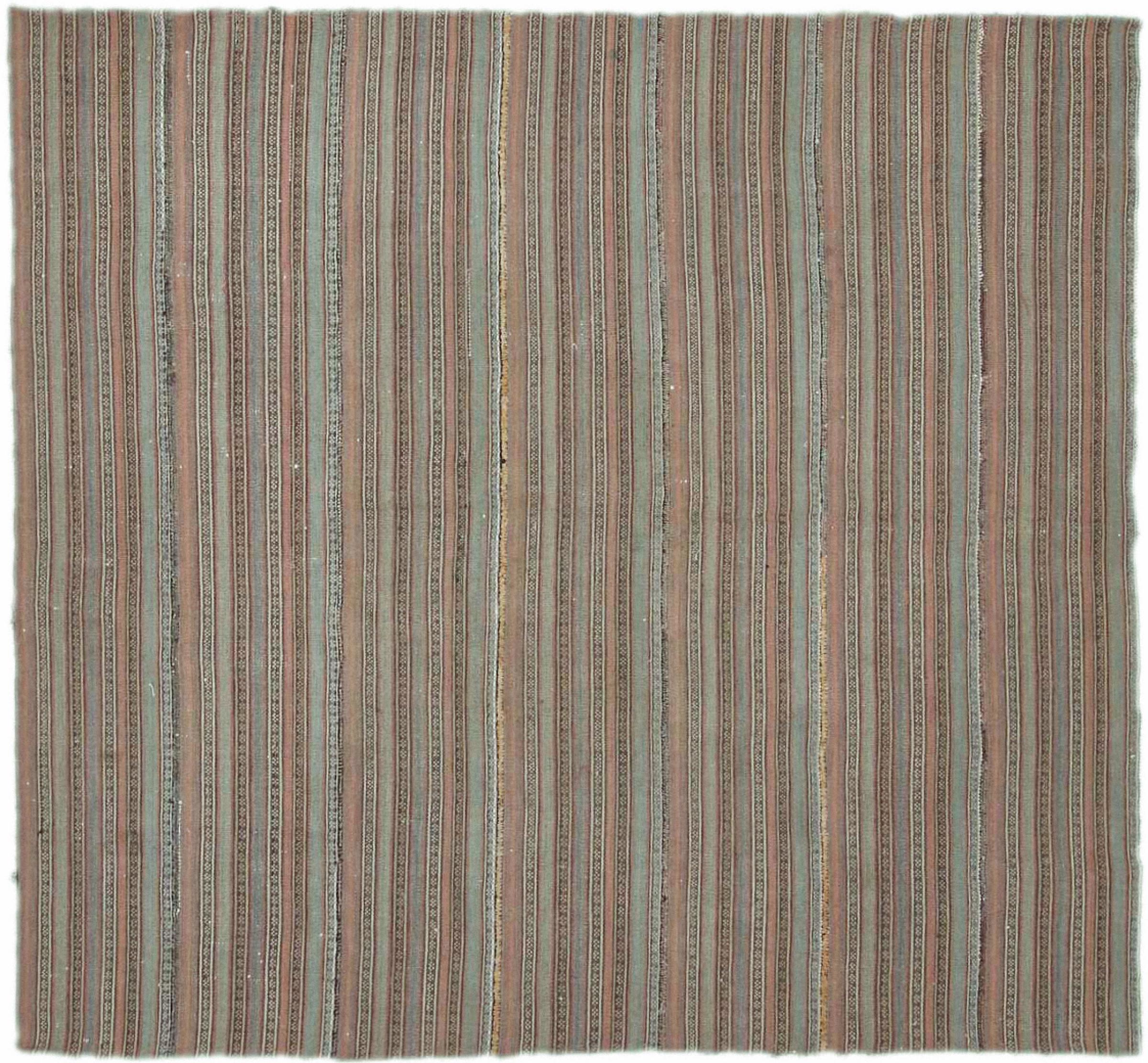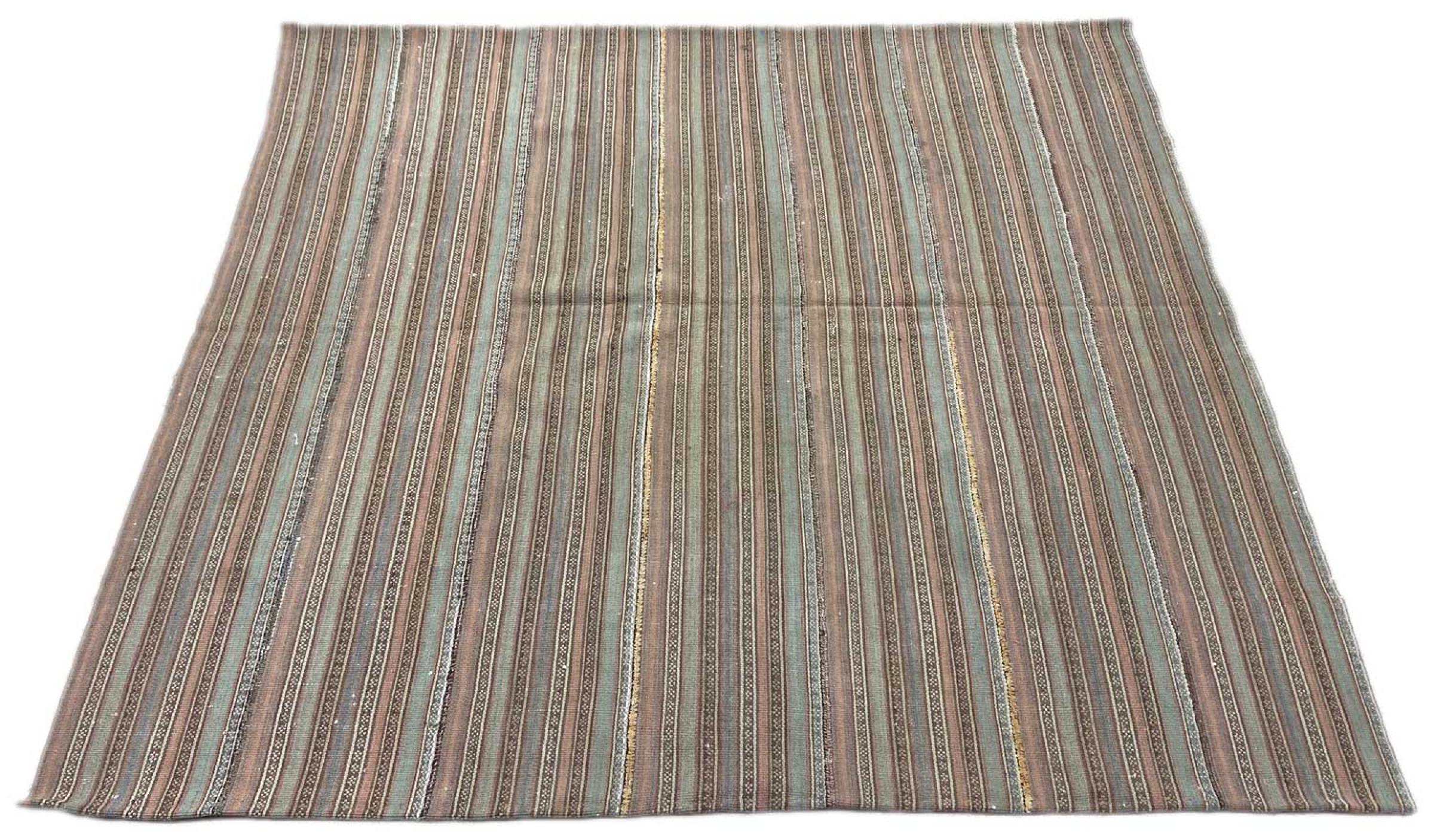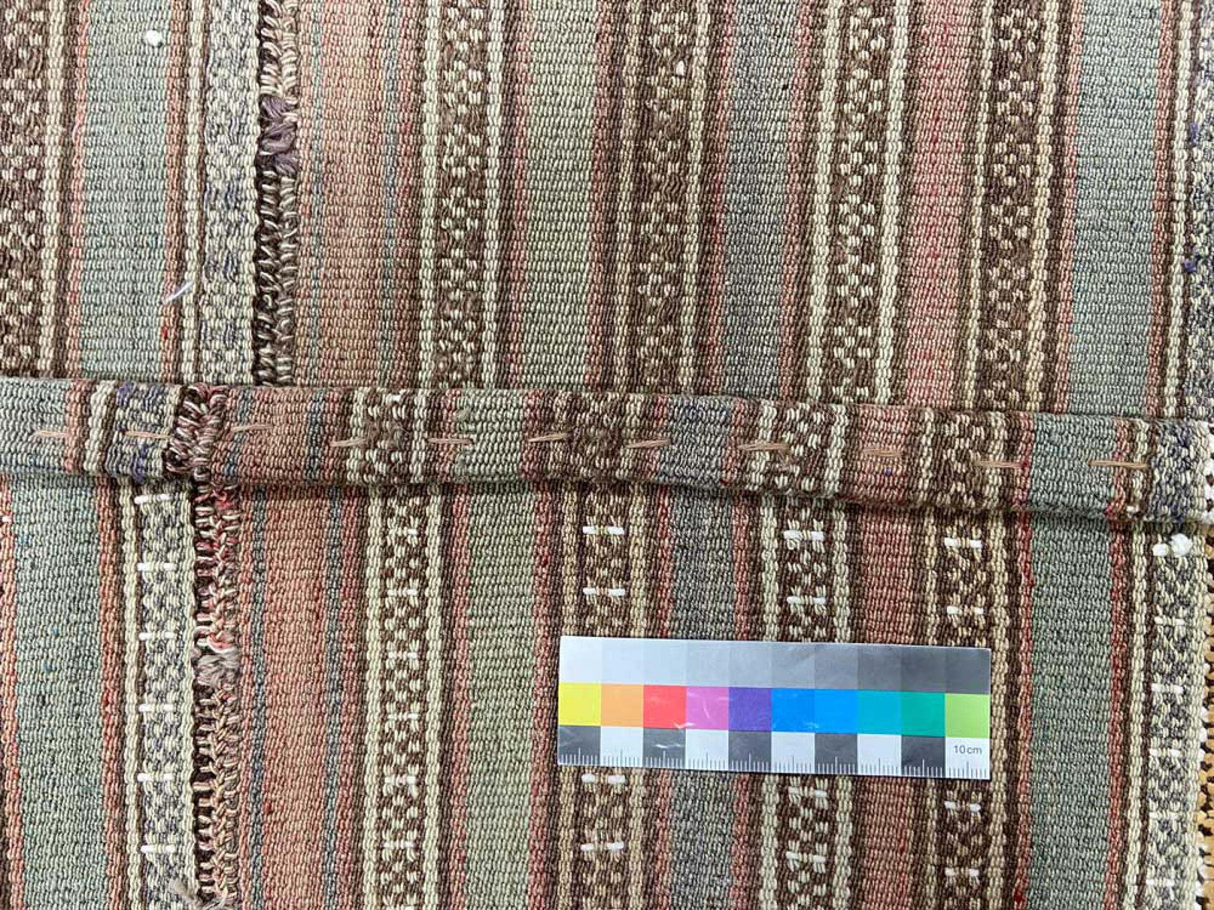 Dit tapijt is met de hand gemaakt op een weefgetouw als plat weefgetouw. Flatweave is de term die wordt gebruikt om tapijten zonder pool te beschrijven. Zoals de naam al belooft, zijn deze tapijten geweven en niet geknoopt. Dit resulteert in een vlak tapijt met een gestructureerd oppervlak. Platweefsels zijn niet zo zacht en meestal dunner dan geknoopte tapijten. Tegelijkertijd zijn ze veel minder complex te vervaardigen en kunnen ze meestal aan beide zijden (voor- en achterkant) worden gelegd. Hun patronen zijn meestal geometrisch, wat wordt bepaald door de stof.