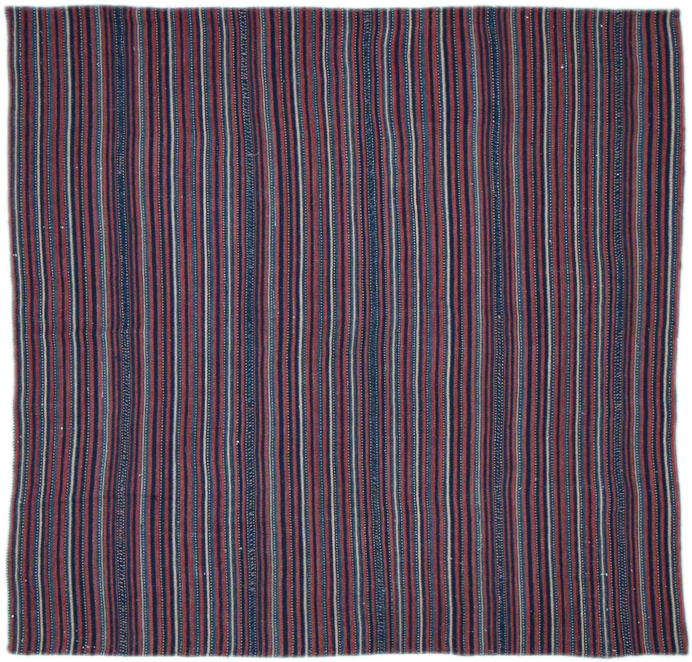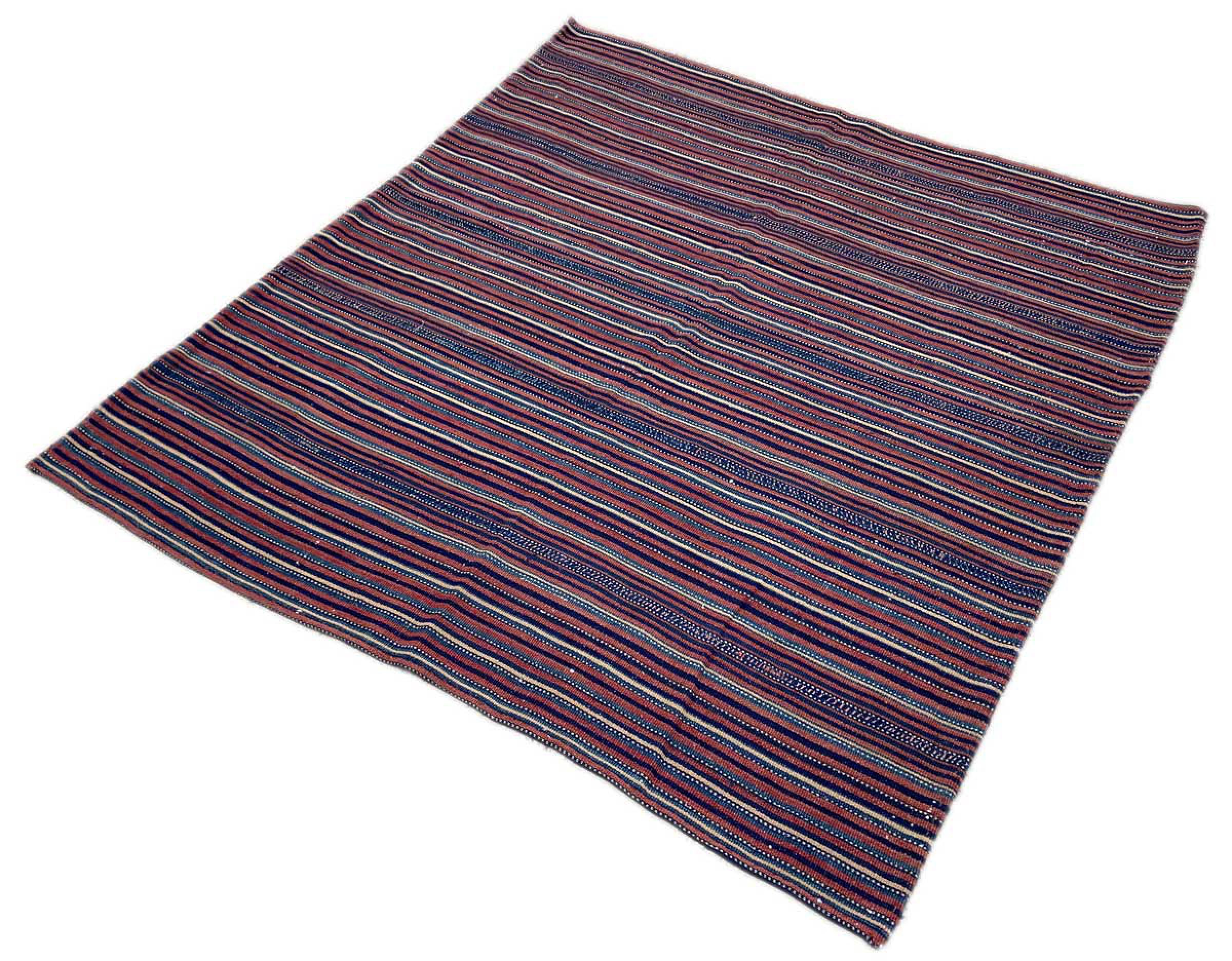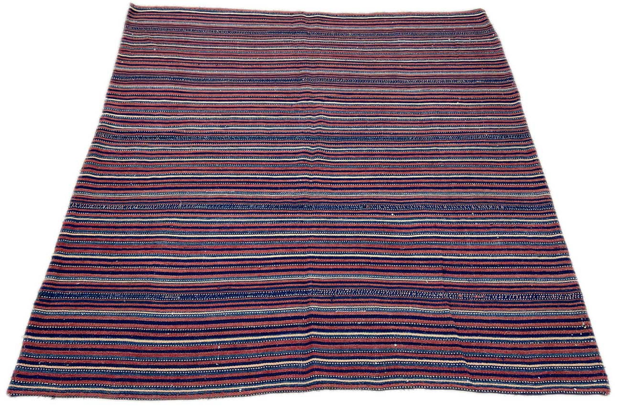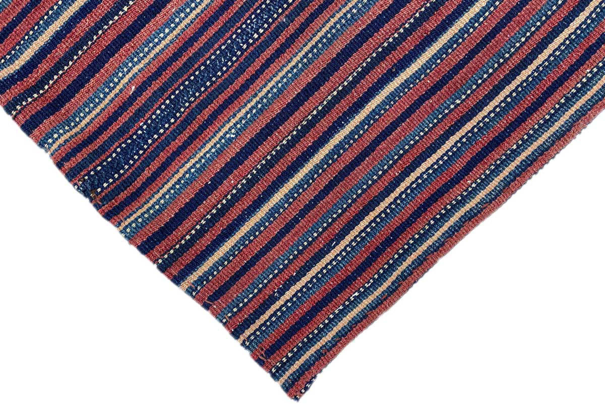 Dit tapijt is met de hand gemaakt op een weefgetouw als plat weefgetouw. Flatweave is de term die wordt gebruikt om tapijten zonder pool te beschrijven. Zoals de naam al belooft, zijn deze tapijten geweven en niet geknoopt. Dit resulteert in een vlak tapijt met een gestructureerd oppervlak. Platweefsels zijn niet zo zacht en meestal dunner dan geknoopte tapijten. Tegelijkertijd zijn ze veel minder complex te vervaardigen en kunnen ze meestal aan beide zijden (voor- en achterkant) worden gelegd. Hun patronen zijn meestal geometrisch, wat wordt bepaald door de stof.