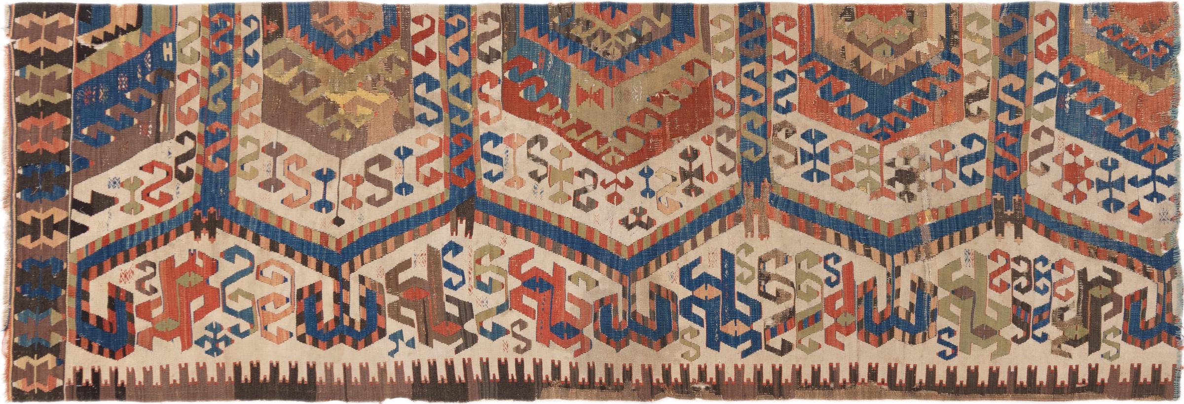 Dit tapijt is met de hand gemaakt op een weefgetouw als plat weefgetouw. Flatweave is de term die wordt gebruikt om tapijten zonder pool te beschrijven. Zoals de naam al belooft, zijn deze tapijten geweven en niet geknoopt. Dit resulteert in een vlak tapijt met een gestructureerd oppervlak. Platweefsels zijn niet zo zacht en meestal dunner dan geknoopte tapijten. Tegelijkertijd zijn ze veel minder complex te vervaardigen en kunnen ze meestal aan beide zijden (voor- en achterkant) worden gelegd. Hun patronen zijn meestal geometrisch, wat wordt bepaald door de stof.