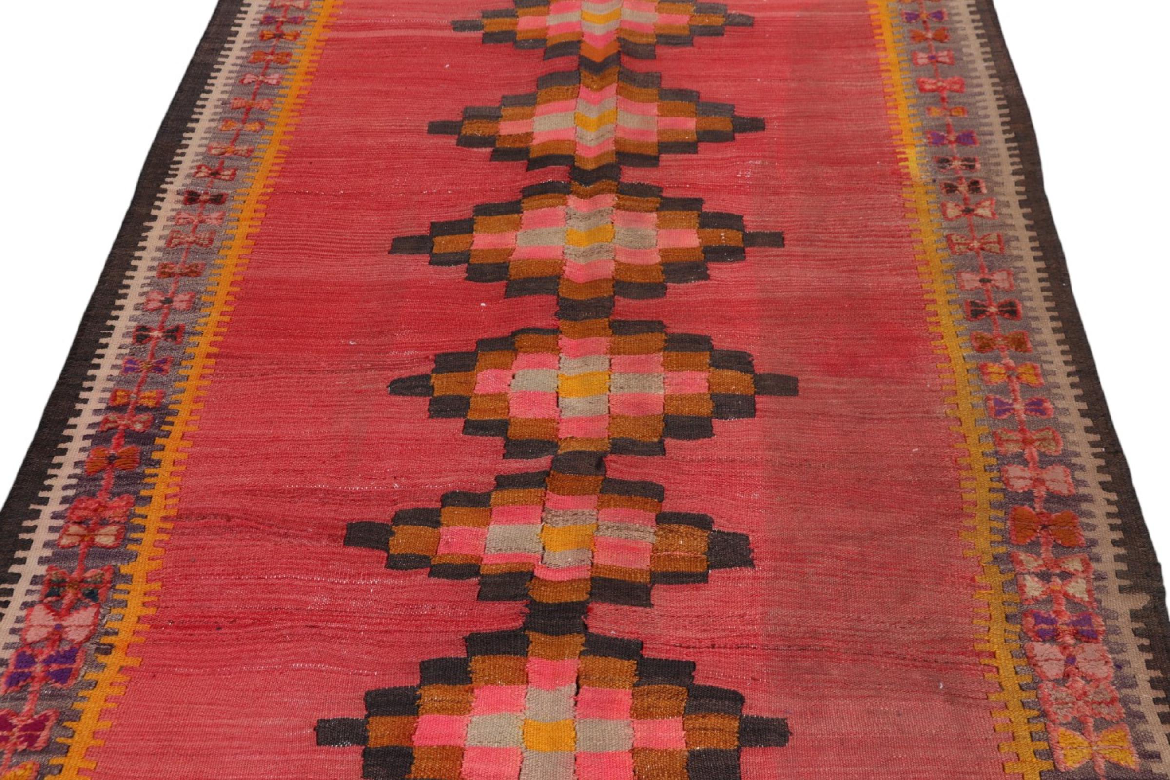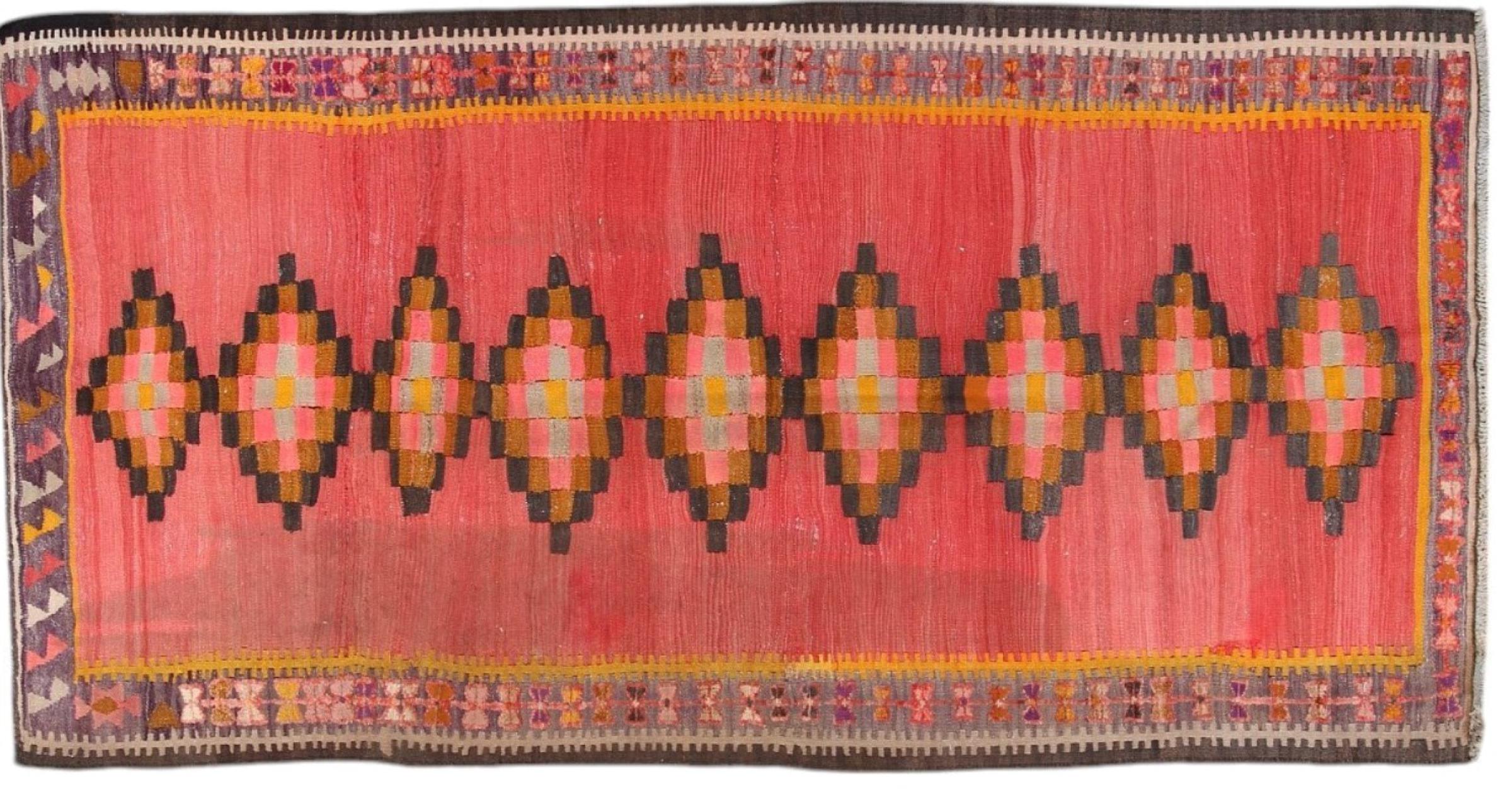 Dit tapijt is met de hand gemaakt op een weefgetouw als plat weefgetouw. Flatweave is de term die wordt gebruikt om tapijten zonder pool te beschrijven. Zoals de naam al belooft, zijn deze tapijten geweven en niet geknoopt. Dit resulteert in een vlak tapijt met een gestructureerd oppervlak. Platweefsels zijn niet zo zacht en meestal dunner dan geknoopte tapijten. Tegelijkertijd zijn ze veel minder complex te vervaardigen en kunnen ze meestal aan beide zijden (voor- en achterkant) worden gelegd. Hun patronen zijn meestal geometrisch, wat wordt bepaald door de stof.