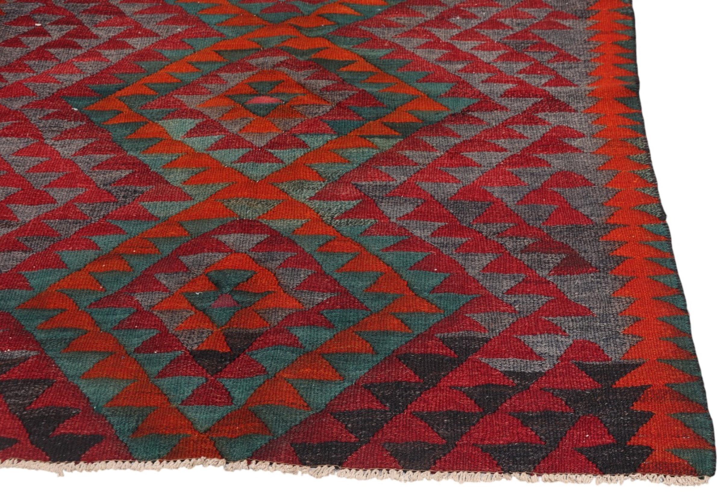 Dit tapijt is met de hand gemaakt op een weefgetouw als plat weefgetouw. Flatweave is de term die wordt gebruikt om tapijten zonder pool te beschrijven. Zoals de naam al belooft, zijn deze tapijten geweven en niet geknoopt. Dit resulteert in een vlak tapijt met een gestructureerd oppervlak. Platweefsels zijn niet zo zacht en meestal dunner dan geknoopte tapijten. Tegelijkertijd zijn ze veel minder complex te vervaardigen en kunnen ze meestal aan beide zijden (voor- en achterkant) worden gelegd. Hun patronen zijn meestal geometrisch, wat wordt bepaald door de stof.