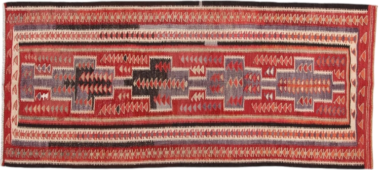 Dit tapijt is met de hand gemaakt op een weefgetouw als plat weefgetouw. Flatweave is de term die wordt gebruikt om tapijten zonder pool te beschrijven. Zoals de naam al belooft, zijn deze tapijten geweven en niet geknoopt. Dit resulteert in een vlak tapijt met een gestructureerd oppervlak. Platweefsels zijn niet zo zacht en meestal dunner dan geknoopte tapijten. Tegelijkertijd zijn ze veel minder complex te vervaardigen en kunnen ze meestal aan beide zijden (voor- en achterkant) worden gelegd. Hun patronen zijn meestal geometrisch, wat wordt bepaald door de stof.