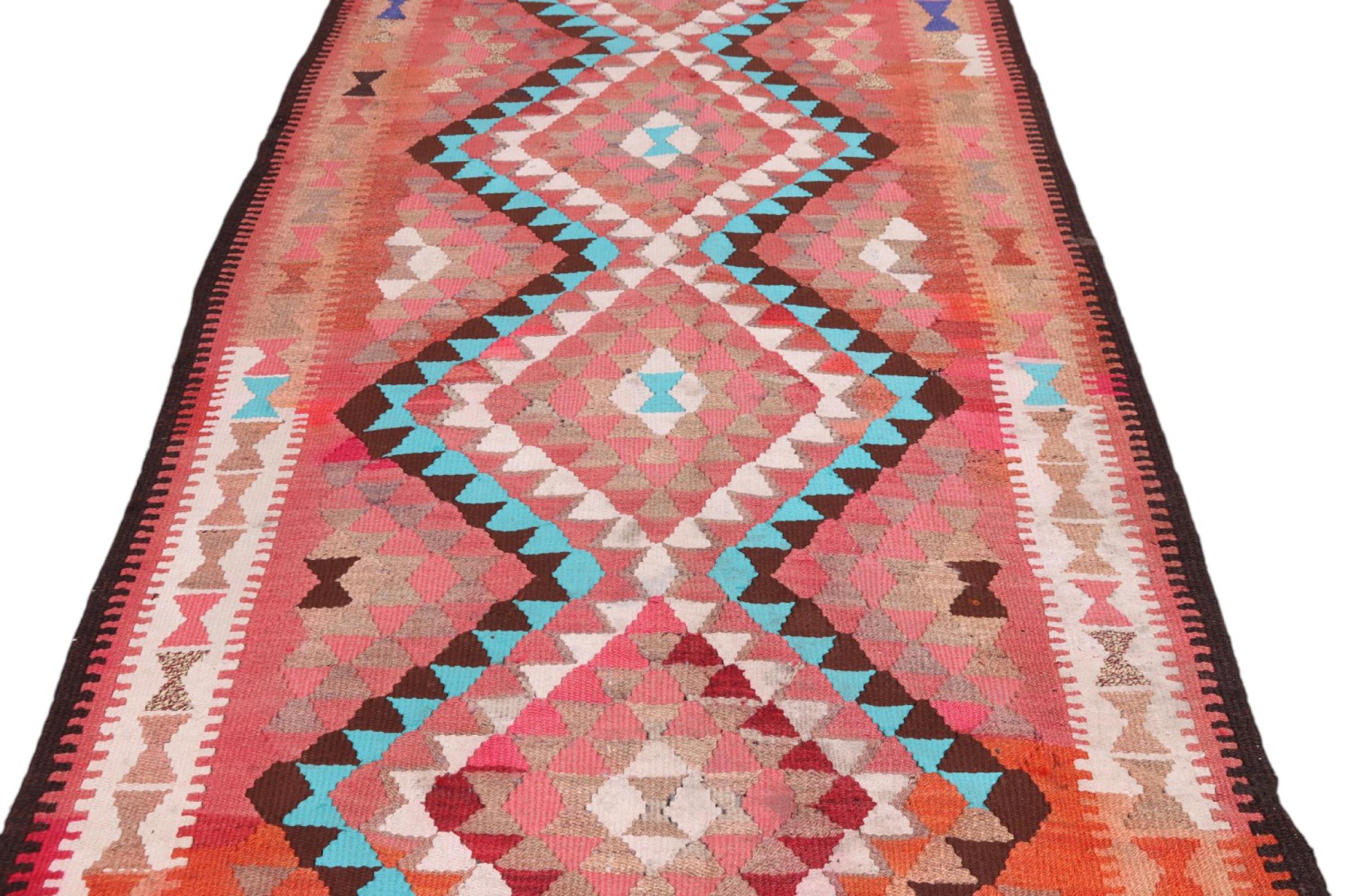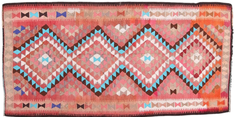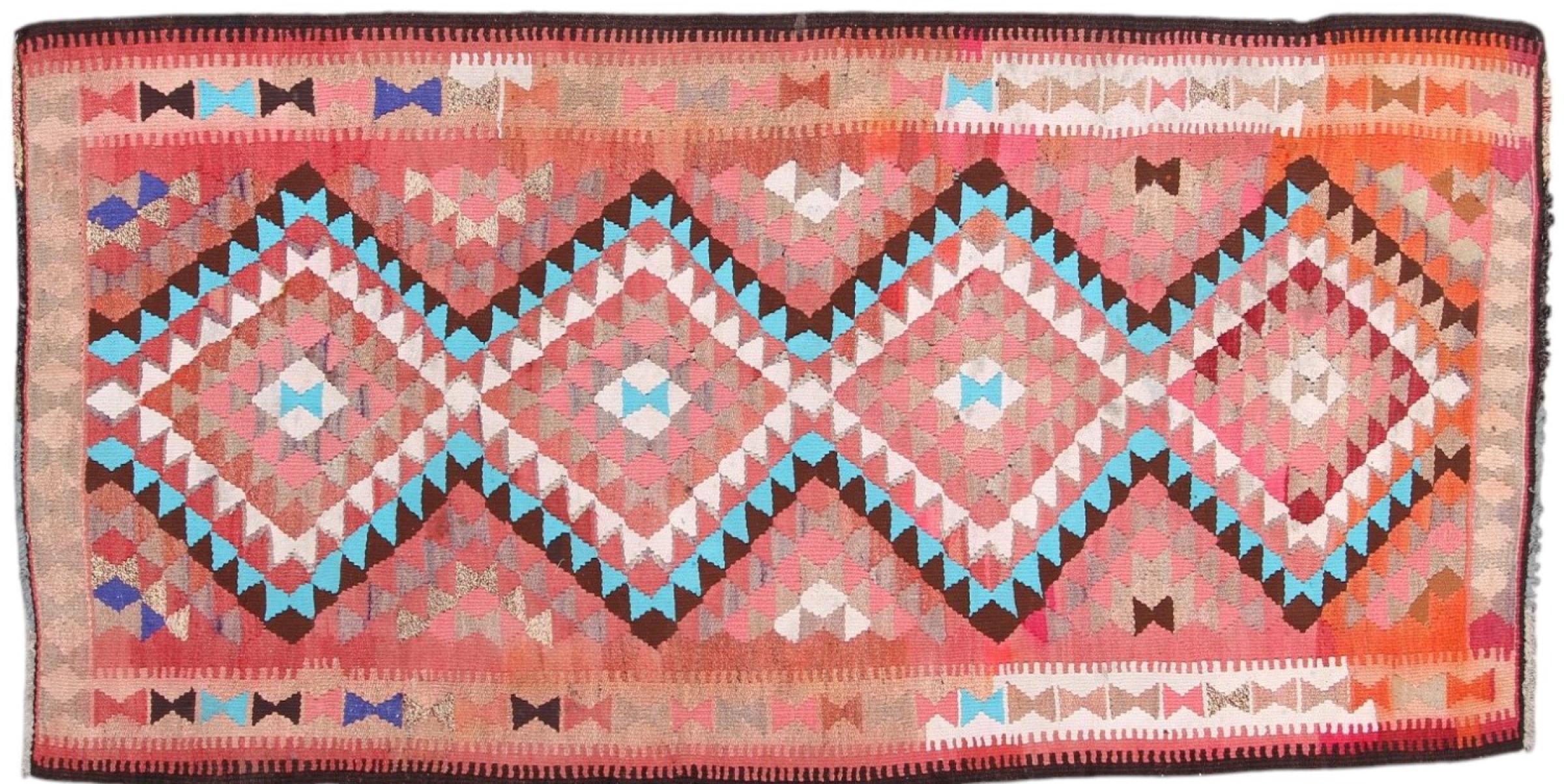 Dit tapijt is met de hand gemaakt op een weefgetouw als plat weefgetouw. Flatweave is de term die wordt gebruikt om tapijten zonder pool te beschrijven. Zoals de naam al belooft, zijn deze tapijten geweven en niet geknoopt. Dit resulteert in een vlak tapijt met een gestructureerd oppervlak. Platweefsels zijn niet zo zacht en meestal dunner dan geknoopte tapijten. Tegelijkertijd zijn ze veel minder complex te vervaardigen en kunnen ze meestal aan beide zijden (voor- en achterkant) worden gelegd. Hun patronen zijn meestal geometrisch, wat wordt bepaald door de stof.