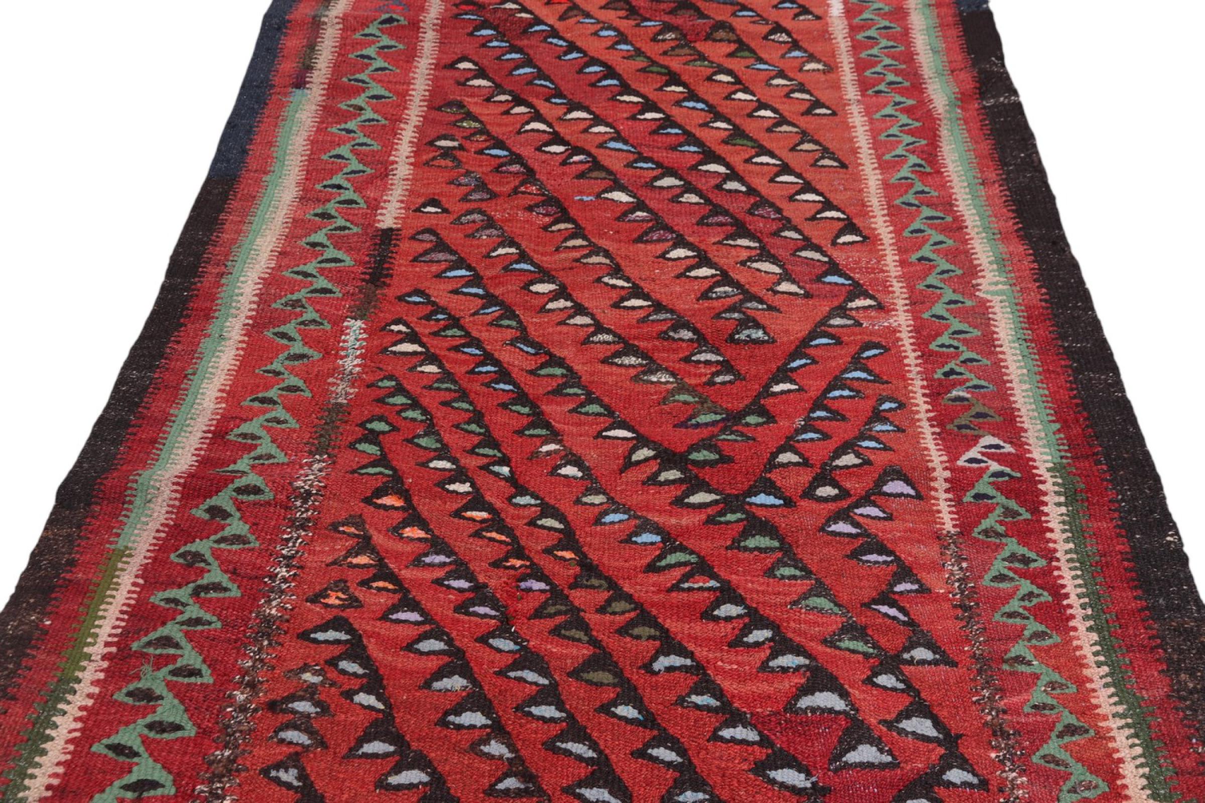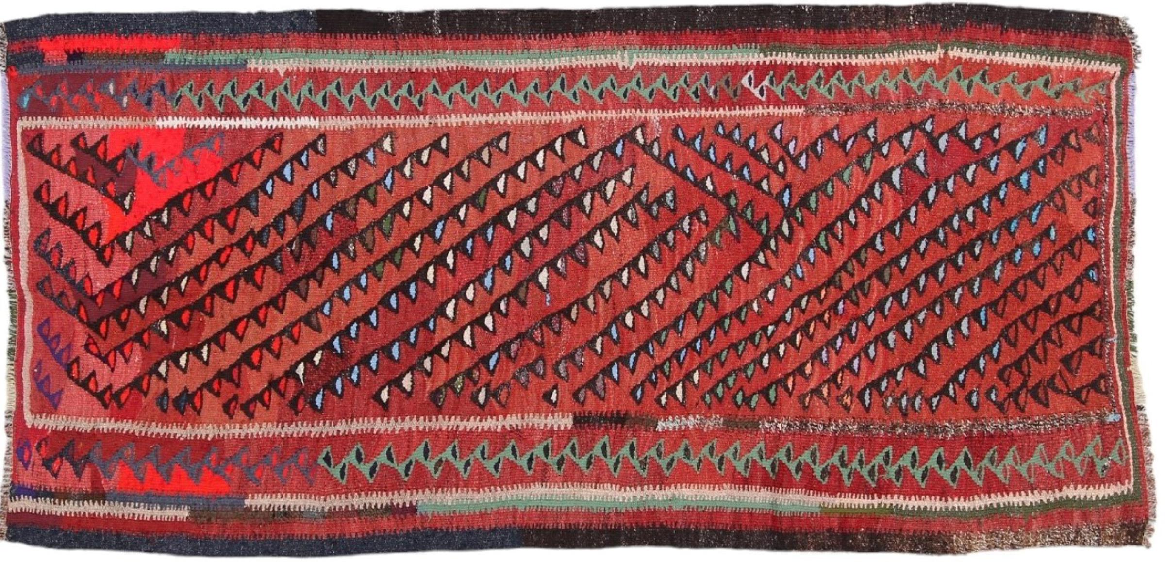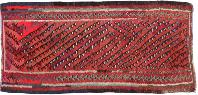 Dit tapijt is met de hand gemaakt op een weefgetouw als plat weefgetouw. Flatweave is de term die wordt gebruikt om tapijten zonder pool te beschrijven. Zoals de naam al belooft, zijn deze tapijten geweven en niet geknoopt. Dit resulteert in een vlak tapijt met een gestructureerd oppervlak. Platweefsels zijn niet zo zacht en meestal dunner dan geknoopte tapijten. Tegelijkertijd zijn ze veel minder complex te vervaardigen en kunnen ze meestal aan beide zijden (voor- en achterkant) worden gelegd. Hun patronen zijn meestal geometrisch, wat wordt bepaald door de stof.