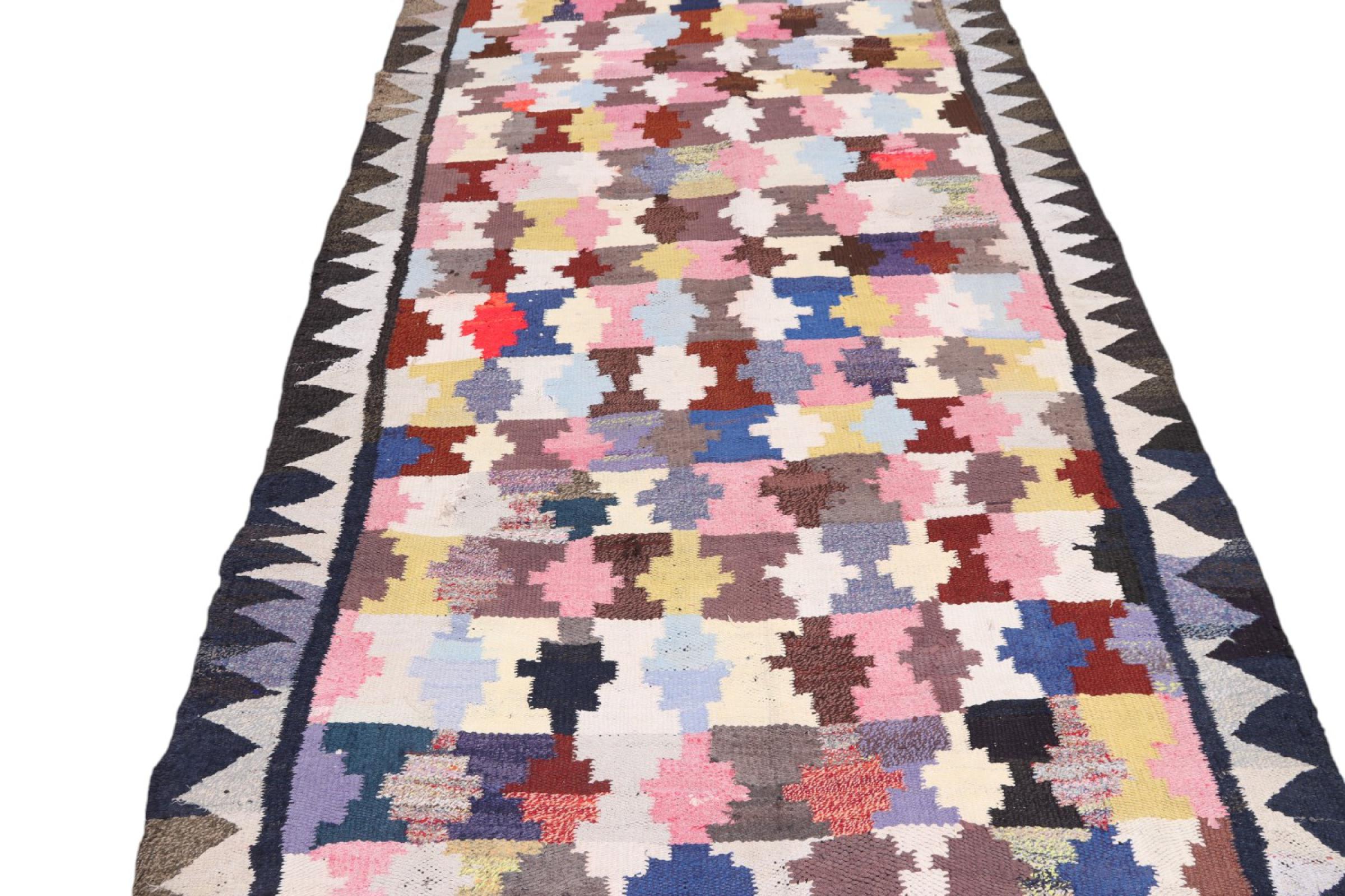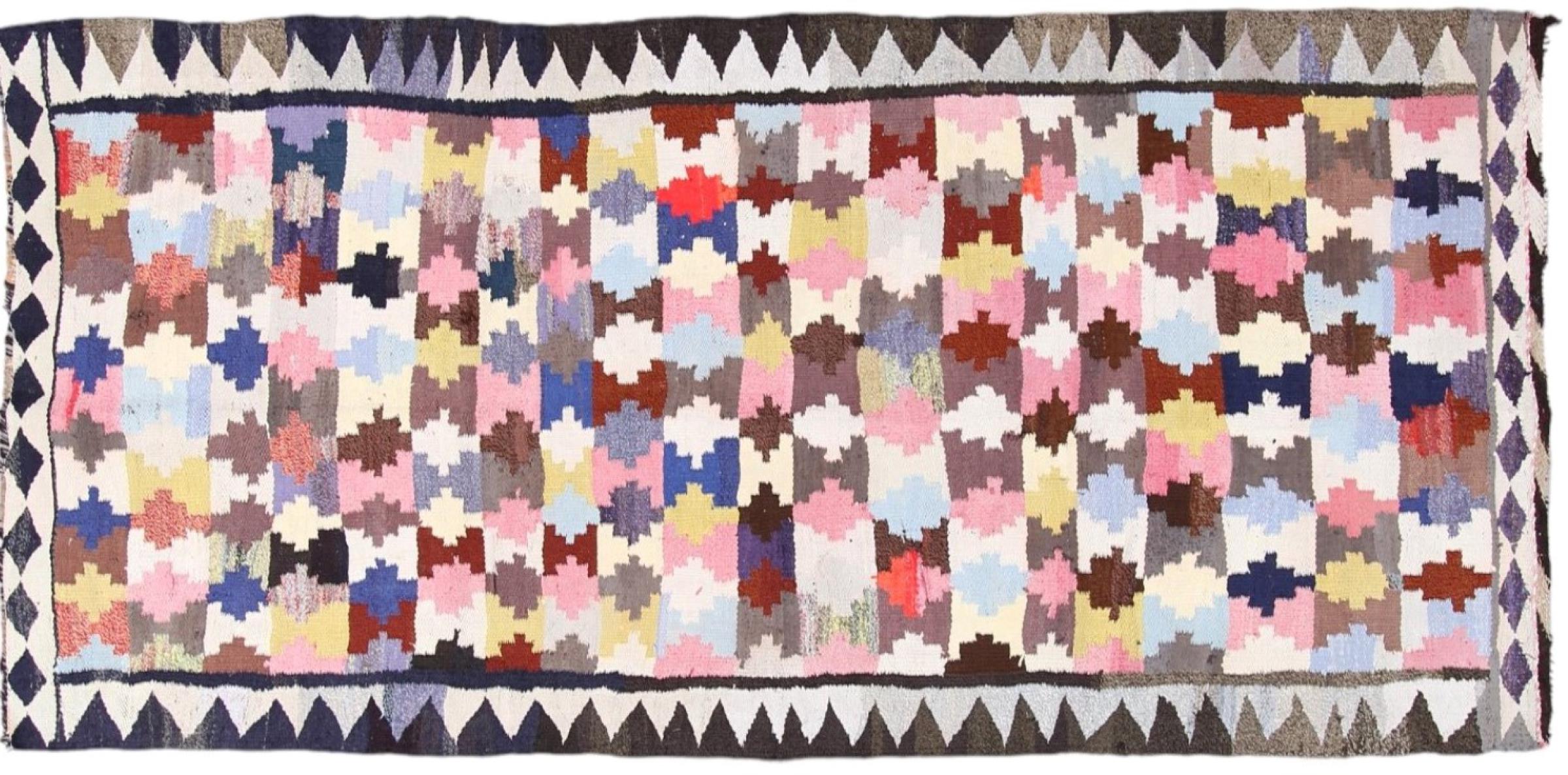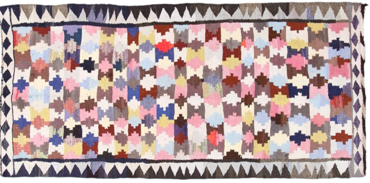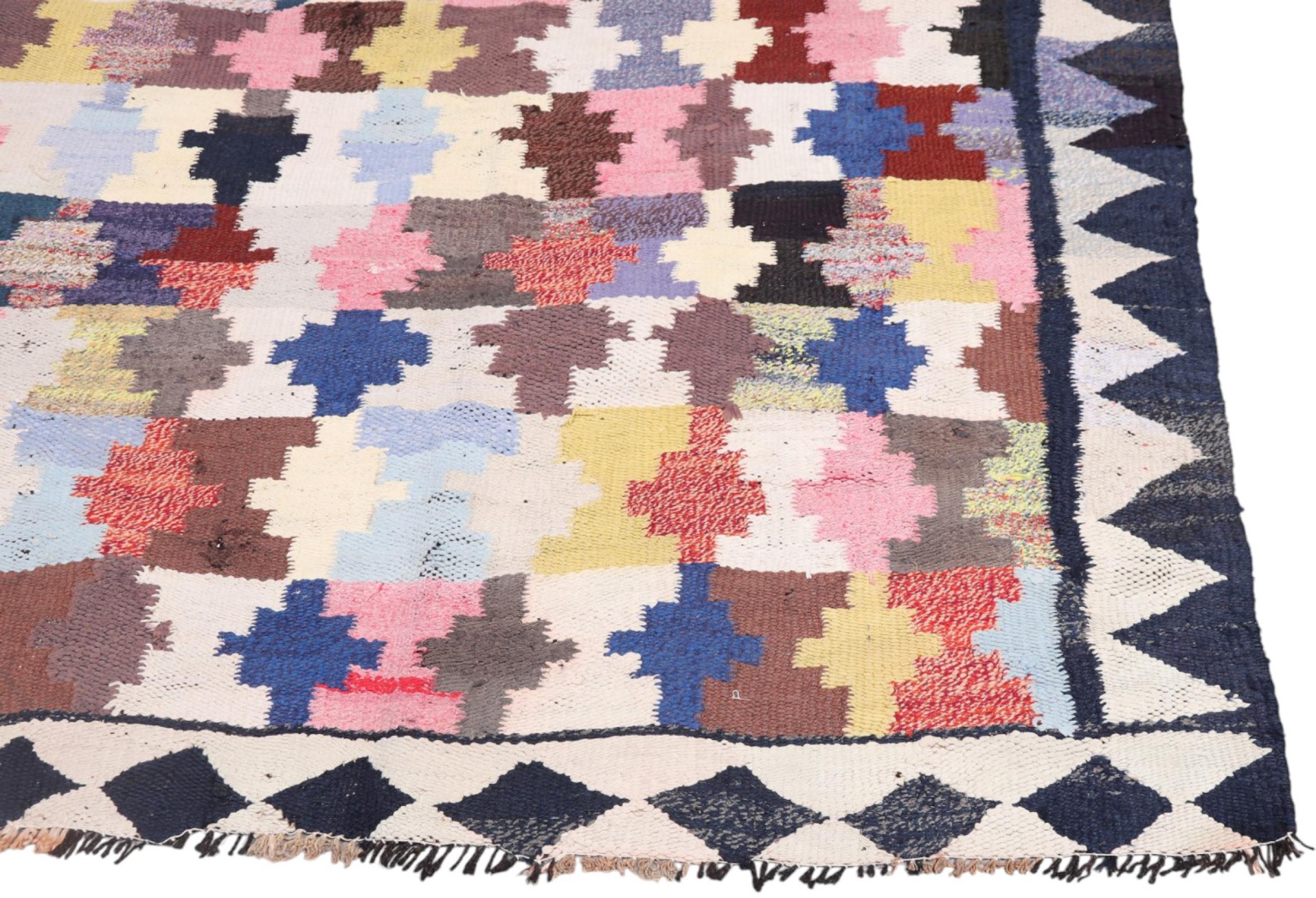 Dit tapijt is met de hand gemaakt op een weefgetouw als plat weefgetouw. Flatweave is de term die wordt gebruikt om tapijten zonder pool te beschrijven. Zoals de naam al belooft, zijn deze tapijten geweven en niet geknoopt. Dit resulteert in een vlak tapijt met een gestructureerd oppervlak. Platweefsels zijn niet zo zacht en meestal dunner dan geknoopte tapijten. Tegelijkertijd zijn ze veel minder complex te vervaardigen en kunnen ze meestal aan beide zijden (voor- en achterkant) worden gelegd. Hun patronen zijn meestal geometrisch, wat wordt bepaald door de stof.