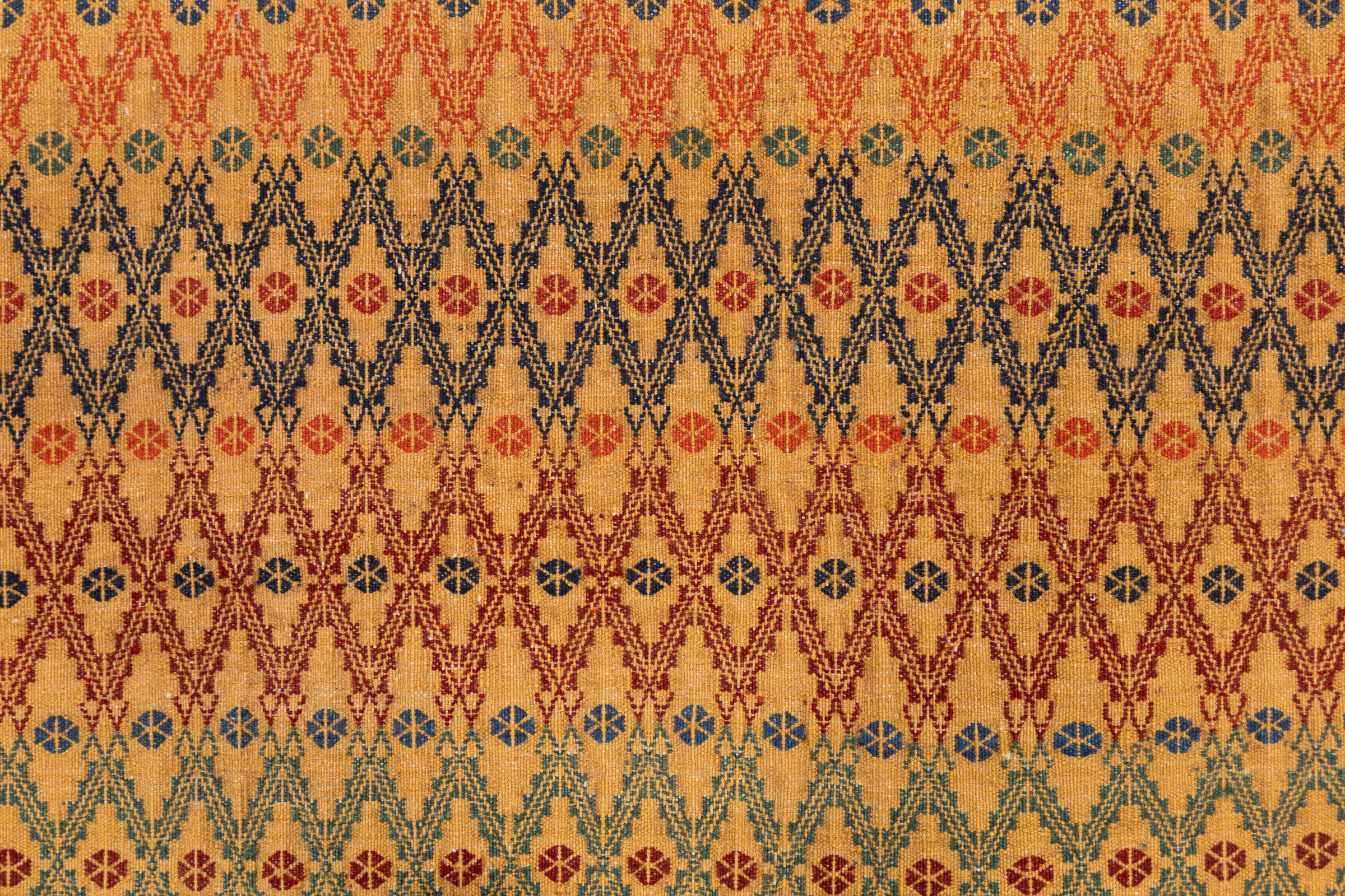 Dit tapijt is met de hand gemaakt op een weefgetouw als plat weefgetouw. Flatweave is de term die wordt gebruikt om tapijten zonder pool te beschrijven. Zoals de naam al belooft, zijn deze tapijten geweven en niet geknoopt. Dit resulteert in een vlak tapijt met een gestructureerd oppervlak. Platweefsels zijn niet zo zacht en meestal dunner dan geknoopte tapijten. Tegelijkertijd zijn ze veel minder complex te vervaardigen en kunnen ze meestal aan beide zijden (voor- en achterkant) worden gelegd. Hun patronen zijn meestal geometrisch, wat wordt bepaald door de stof.