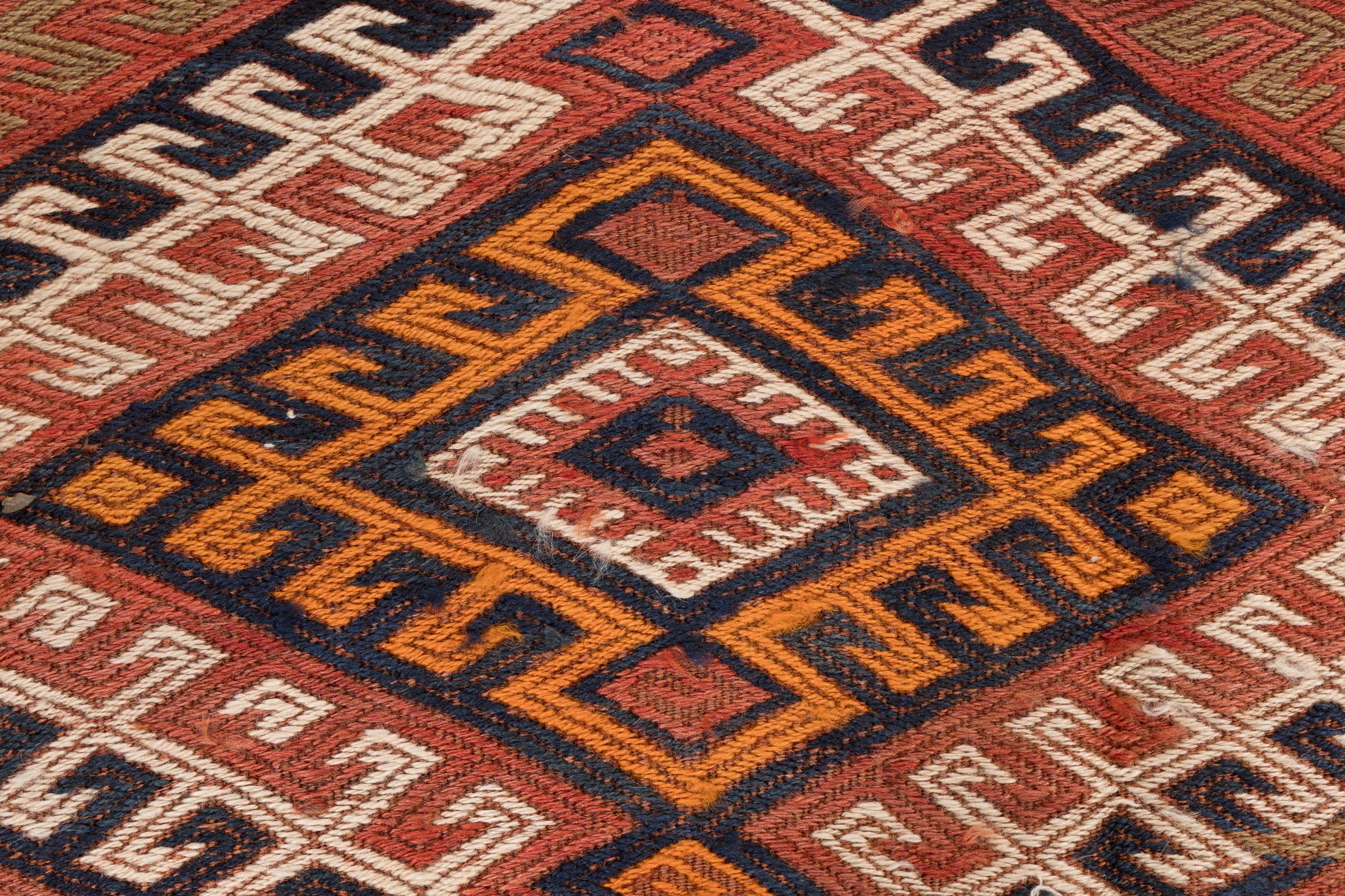 Dit tapijt is met de hand gemaakt op een weefgetouw als plat weefgetouw. Flatweave is de term die wordt gebruikt om tapijten zonder pool te beschrijven. Zoals de naam al belooft, zijn deze tapijten geweven en niet geknoopt. Dit resulteert in een vlak tapijt met een gestructureerd oppervlak. Platweefsels zijn niet zo zacht en meestal dunner dan geknoopte tapijten. Tegelijkertijd zijn ze veel minder complex te vervaardigen en kunnen ze meestal aan beide zijden (voor- en achterkant) worden gelegd. Hun patronen zijn meestal geometrisch, wat wordt bepaald door de stof.
