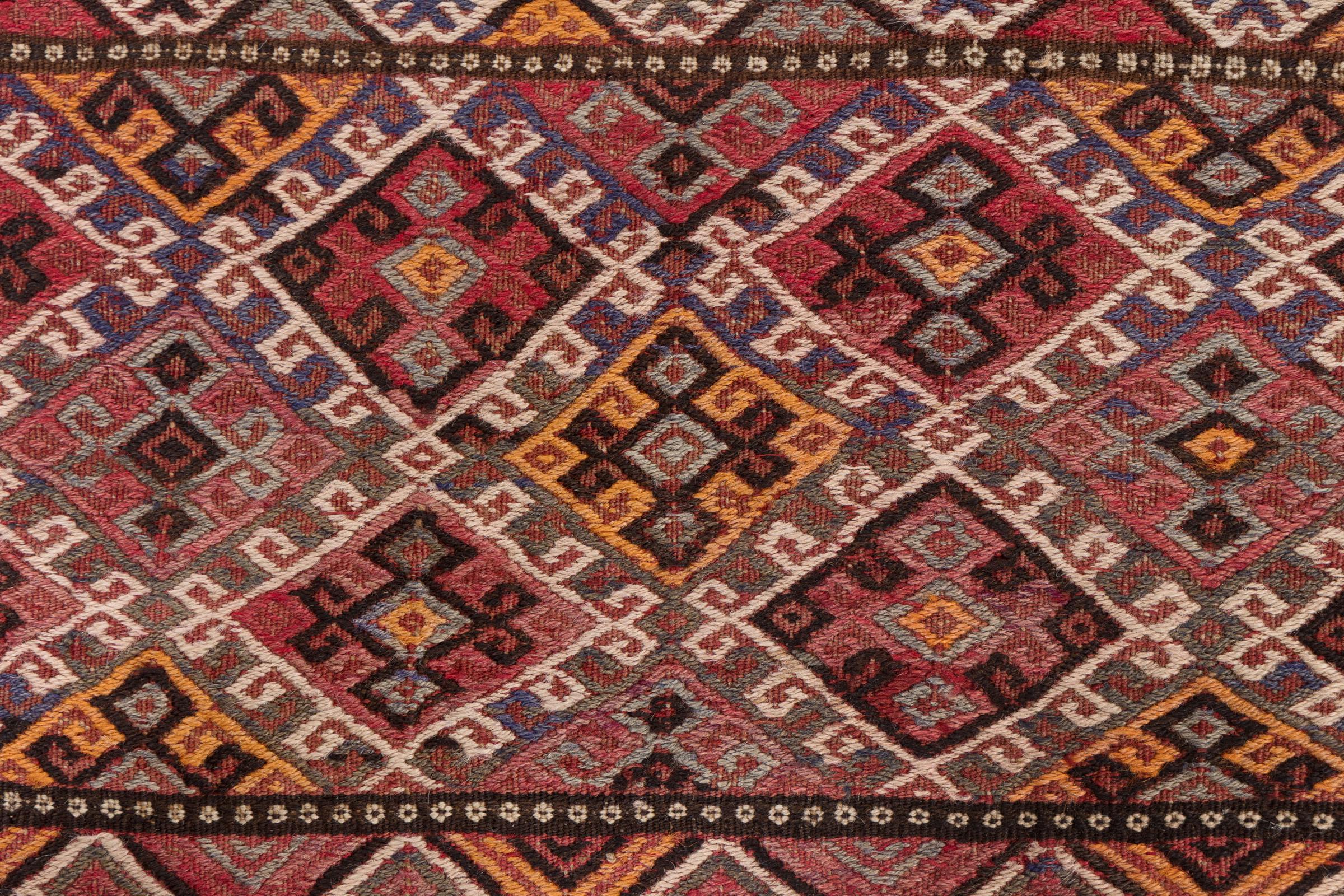 Dit tapijt is met de hand gemaakt op een weefgetouw als plat weefgetouw. Flatweave is de term die wordt gebruikt om tapijten zonder pool te beschrijven. Zoals de naam al belooft, zijn deze tapijten geweven en niet geknoopt. Dit resulteert in een vlak tapijt met een gestructureerd oppervlak. Platweefsels zijn niet zo zacht en meestal dunner dan geknoopte tapijten. Tegelijkertijd zijn ze veel minder complex te vervaardigen en kunnen ze meestal aan beide zijden (voor- en achterkant) worden gelegd. Hun patronen zijn meestal geometrisch, wat wordt bepaald door de stof.