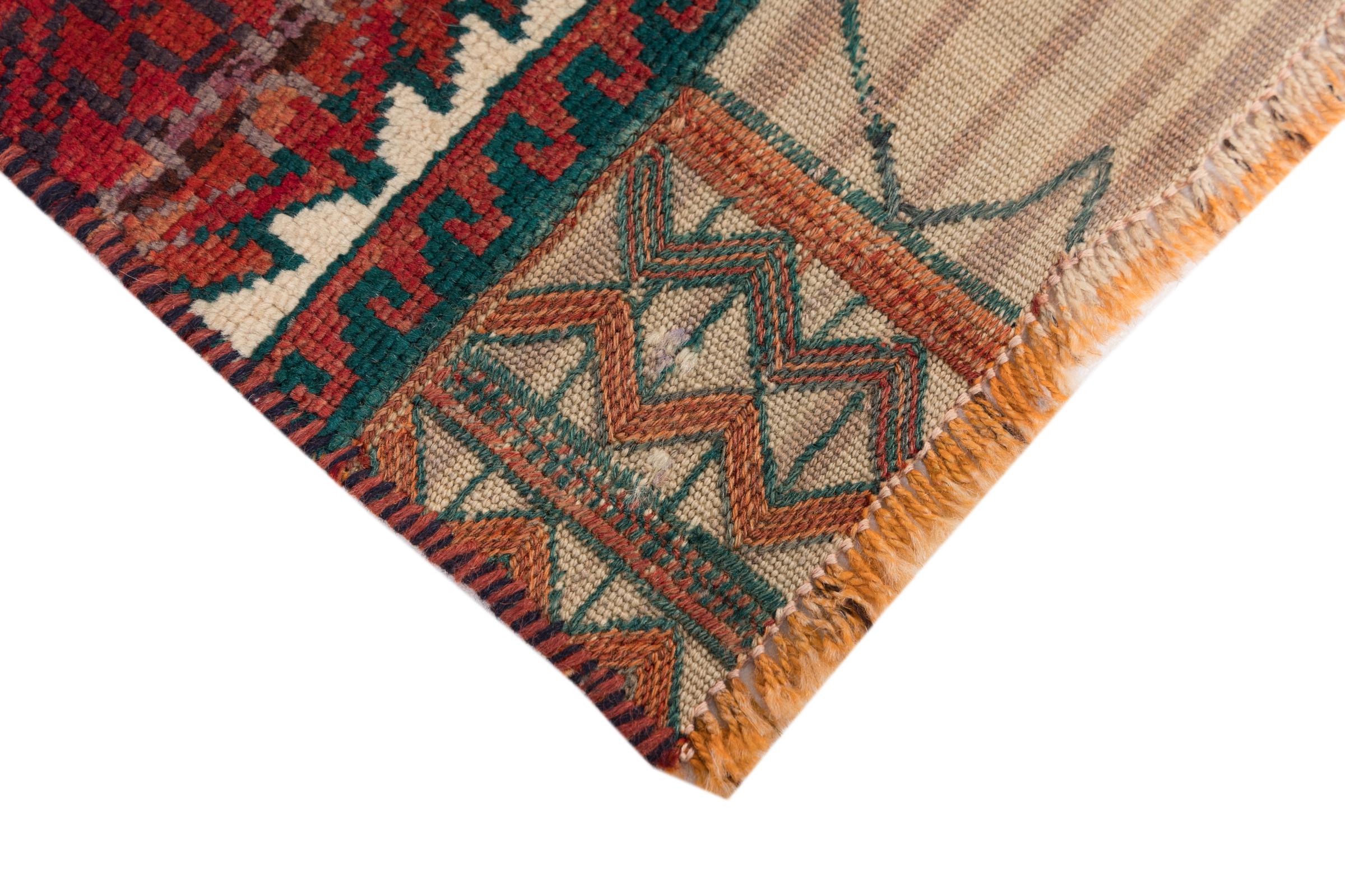 Dit tapijt is met de hand gemaakt op een weefgetouw als plat weefgetouw. Flatweave is de term die wordt gebruikt om tapijten zonder pool te beschrijven. Zoals de naam al belooft, zijn deze tapijten geweven en niet geknoopt. Dit resulteert in een vlak tapijt met een gestructureerd oppervlak. Platweefsels zijn niet zo zacht en meestal dunner dan geknoopte tapijten. Tegelijkertijd zijn ze veel minder complex te vervaardigen en kunnen ze meestal aan beide zijden (voor- en achterkant) worden gelegd. Hun patronen zijn meestal geometrisch, wat wordt bepaald door de stof.