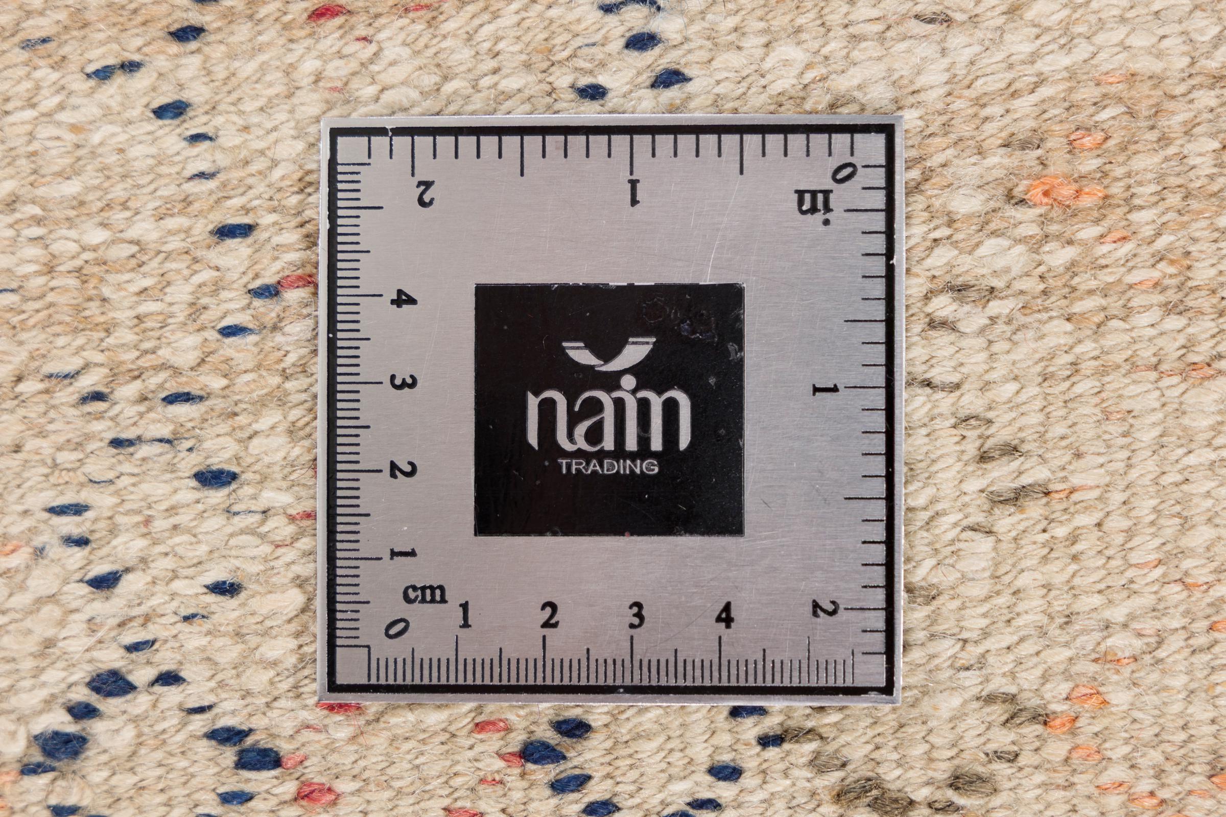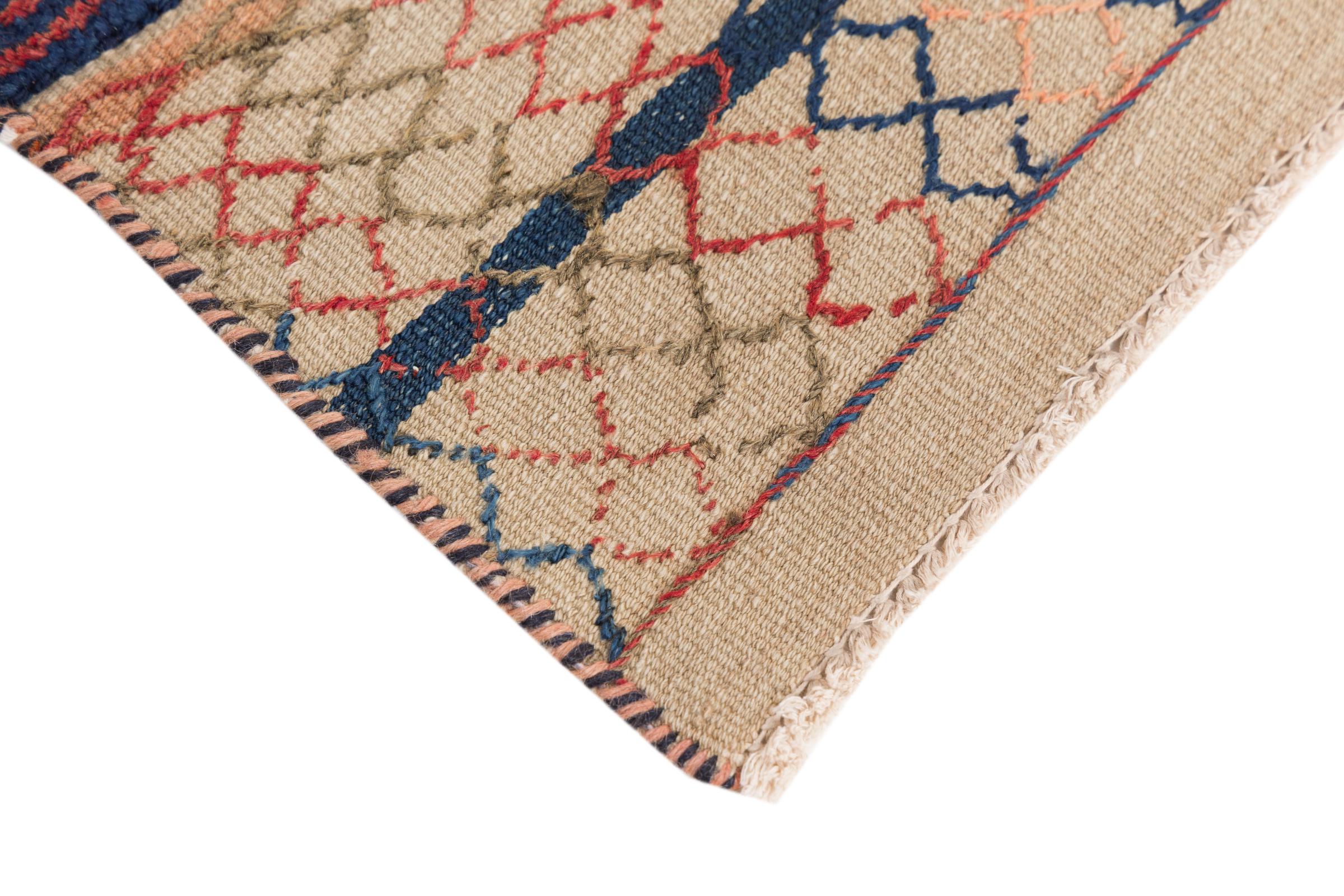 Dit tapijt is met de hand gemaakt op een weefgetouw als plat weefgetouw. Flatweave is de term die wordt gebruikt om tapijten zonder pool te beschrijven. Zoals de naam al belooft, zijn deze tapijten geweven en niet geknoopt. Dit resulteert in een vlak tapijt met een gestructureerd oppervlak. Platweefsels zijn niet zo zacht en meestal dunner dan geknoopte tapijten. Tegelijkertijd zijn ze veel minder complex te vervaardigen en kunnen ze meestal aan beide zijden (voor- en achterkant) worden gelegd. Hun patronen zijn meestal geometrisch, wat wordt bepaald door de stof.