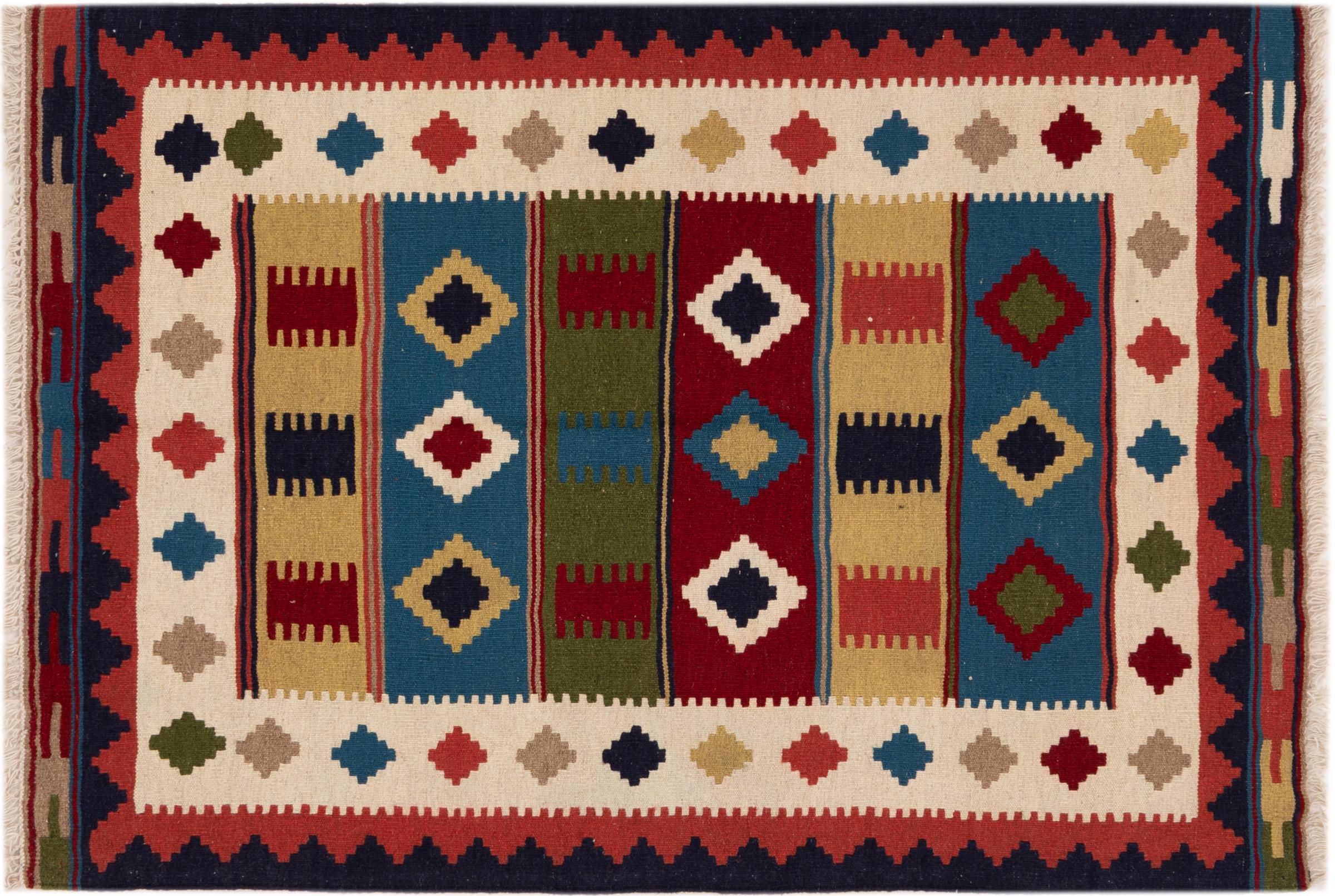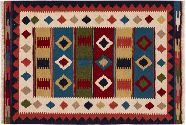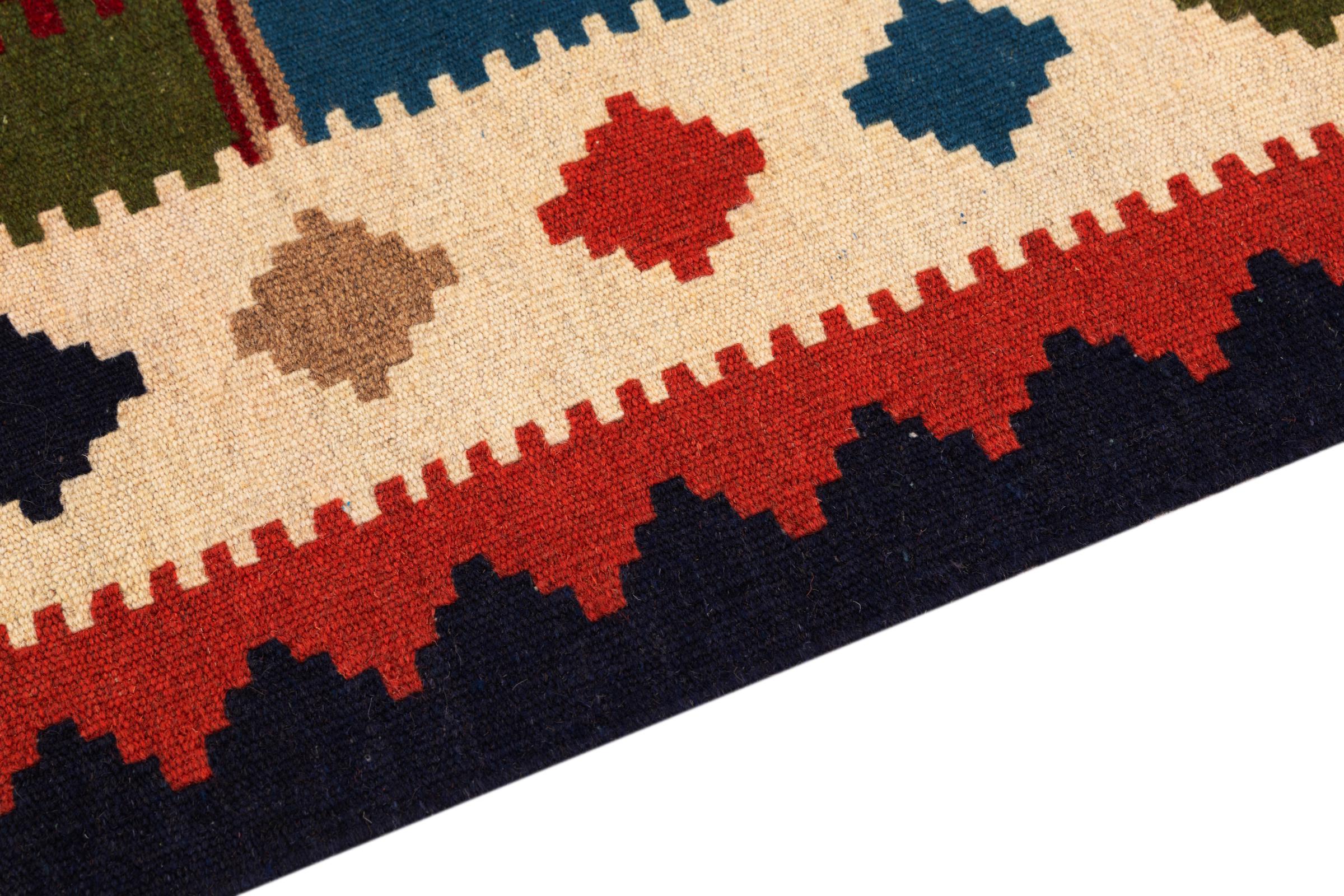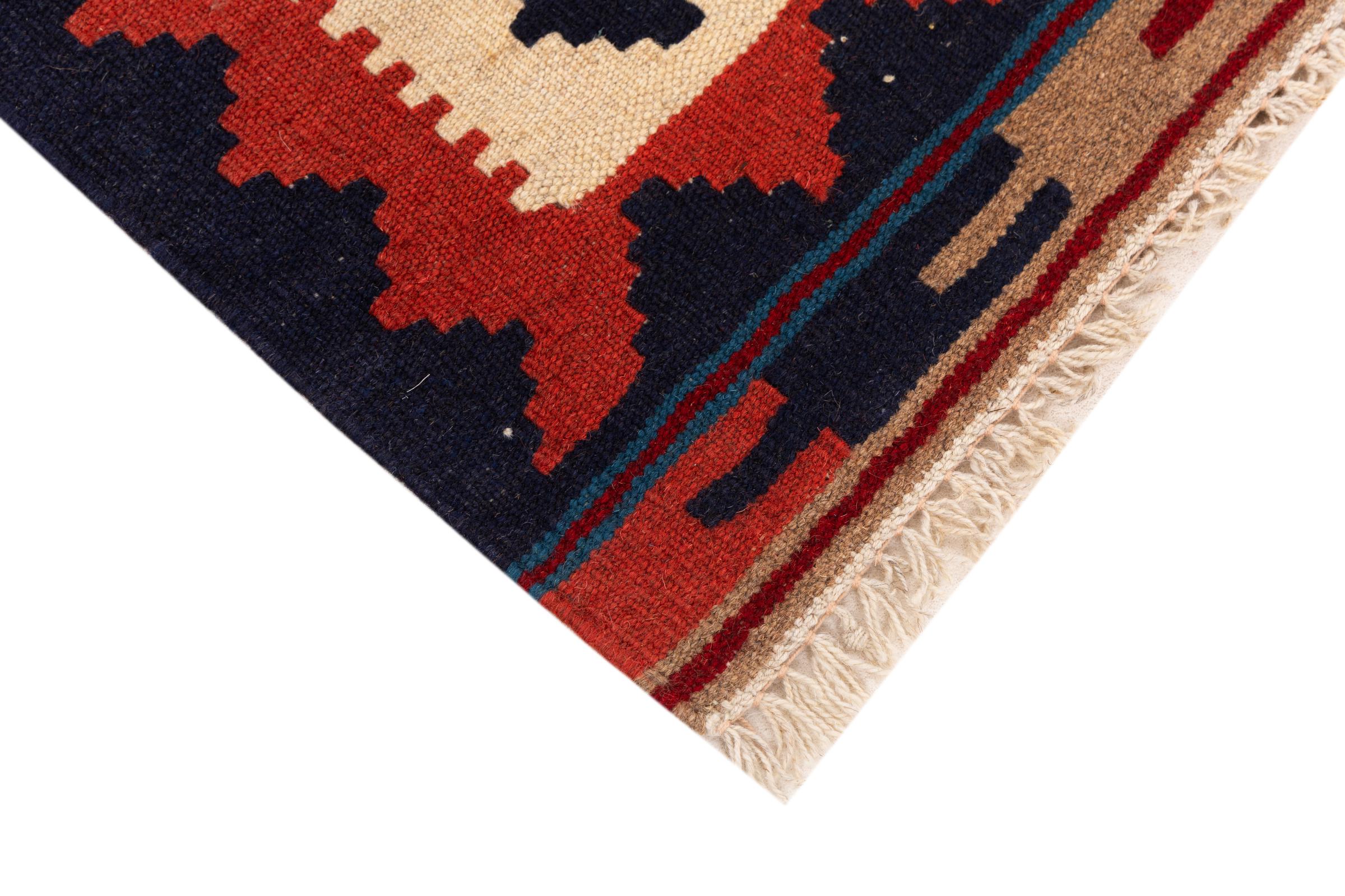 Dit tapijt is met de hand gemaakt op een weefgetouw als plat weefgetouw. Flatweave is de term die wordt gebruikt om tapijten zonder pool te beschrijven. Zoals de naam al belooft, zijn deze tapijten geweven en niet geknoopt. Dit resulteert in een vlak tapijt met een gestructureerd oppervlak. Platweefsels zijn niet zo zacht en meestal dunner dan geknoopte tapijten. Tegelijkertijd zijn ze veel minder complex te vervaardigen en kunnen ze meestal aan beide zijden (voor- en achterkant) worden gelegd. Hun patronen zijn meestal geometrisch, wat wordt bepaald door de stof.