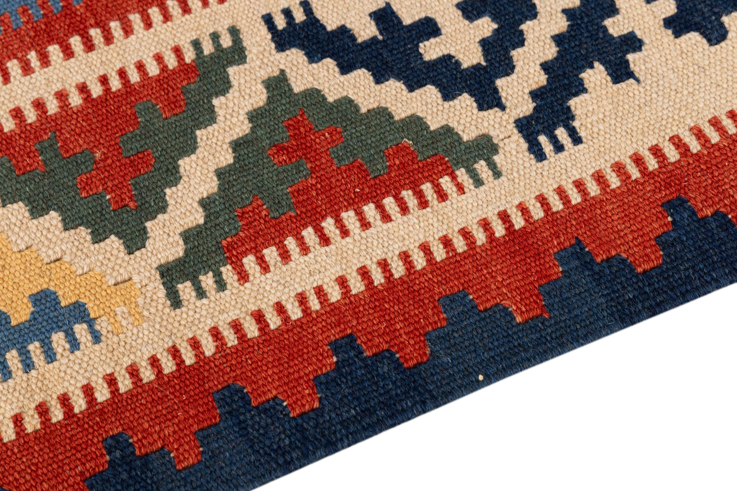 Dit tapijt is met de hand gemaakt op een weefgetouw als plat weefgetouw. Flatweave is de term die wordt gebruikt om tapijten zonder pool te beschrijven. Zoals de naam al belooft, zijn deze tapijten geweven en niet geknoopt. Dit resulteert in een vlak tapijt met een gestructureerd oppervlak. Platweefsels zijn niet zo zacht en meestal dunner dan geknoopte tapijten. Tegelijkertijd zijn ze veel minder complex te vervaardigen en kunnen ze meestal aan beide zijden (voor- en achterkant) worden gelegd. Hun patronen zijn meestal geometrisch, wat wordt bepaald door de stof.