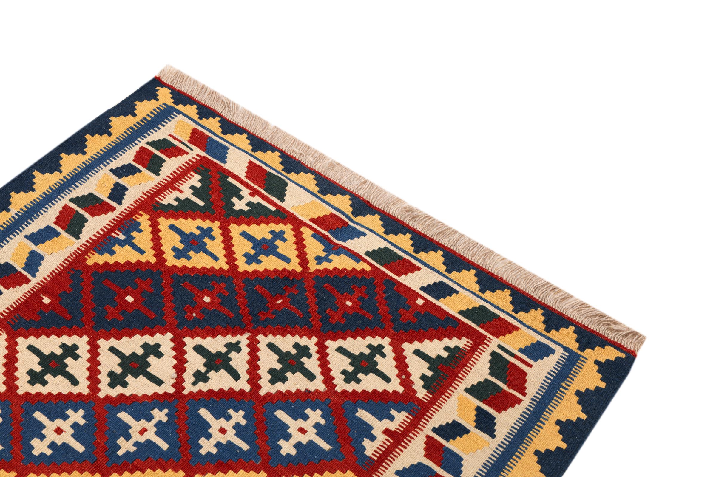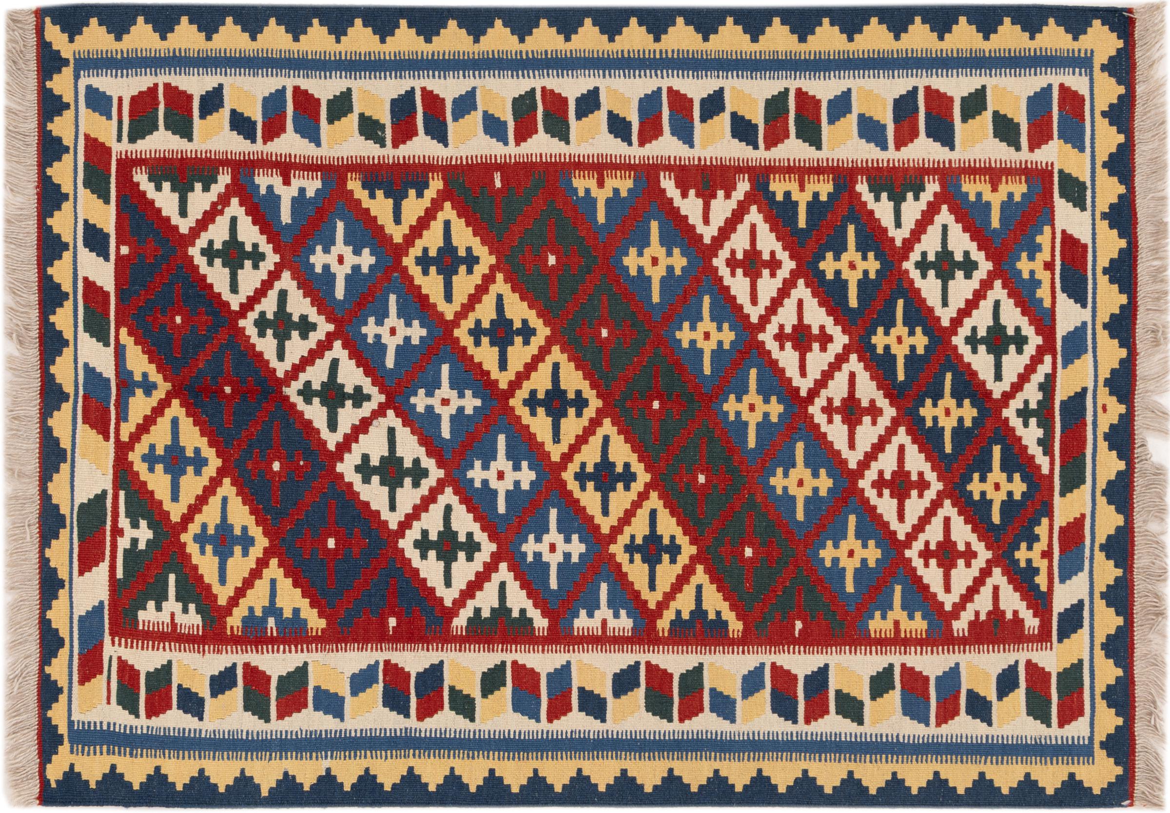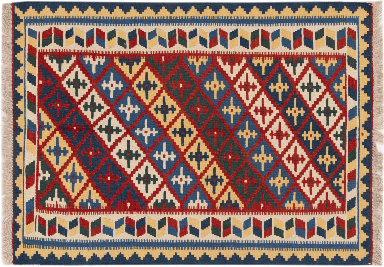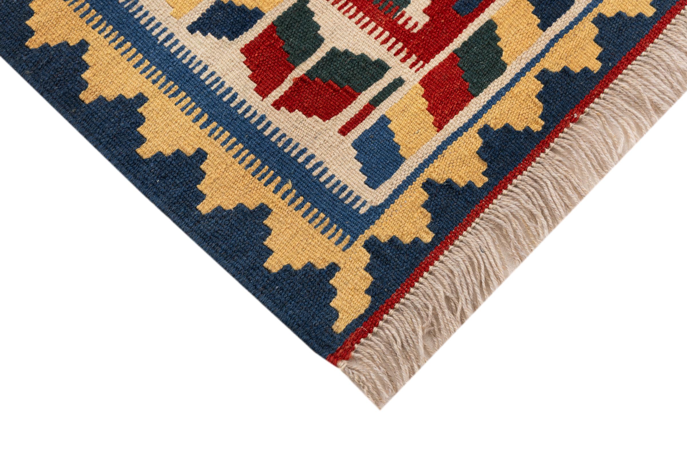 Dit tapijt is met de hand gemaakt op een weefgetouw als plat weefgetouw. Flatweave is de term die wordt gebruikt om tapijten zonder pool te beschrijven. Zoals de naam al belooft, zijn deze tapijten geweven en niet geknoopt. Dit resulteert in een vlak tapijt met een gestructureerd oppervlak. Platweefsels zijn niet zo zacht en meestal dunner dan geknoopte tapijten. Tegelijkertijd zijn ze veel minder complex te vervaardigen en kunnen ze meestal aan beide zijden (voor- en achterkant) worden gelegd. Hun patronen zijn meestal geometrisch, wat wordt bepaald door de stof.