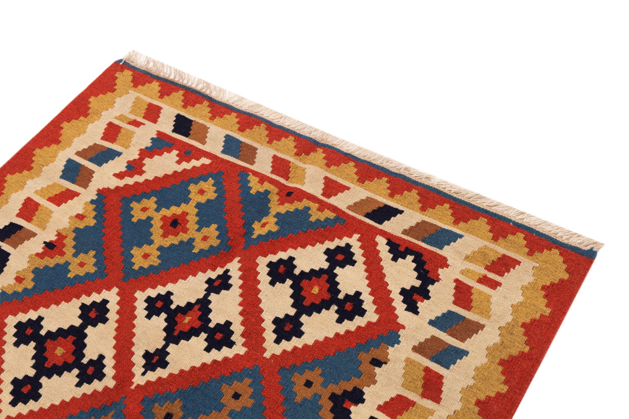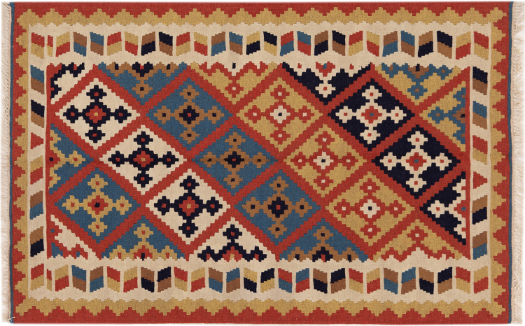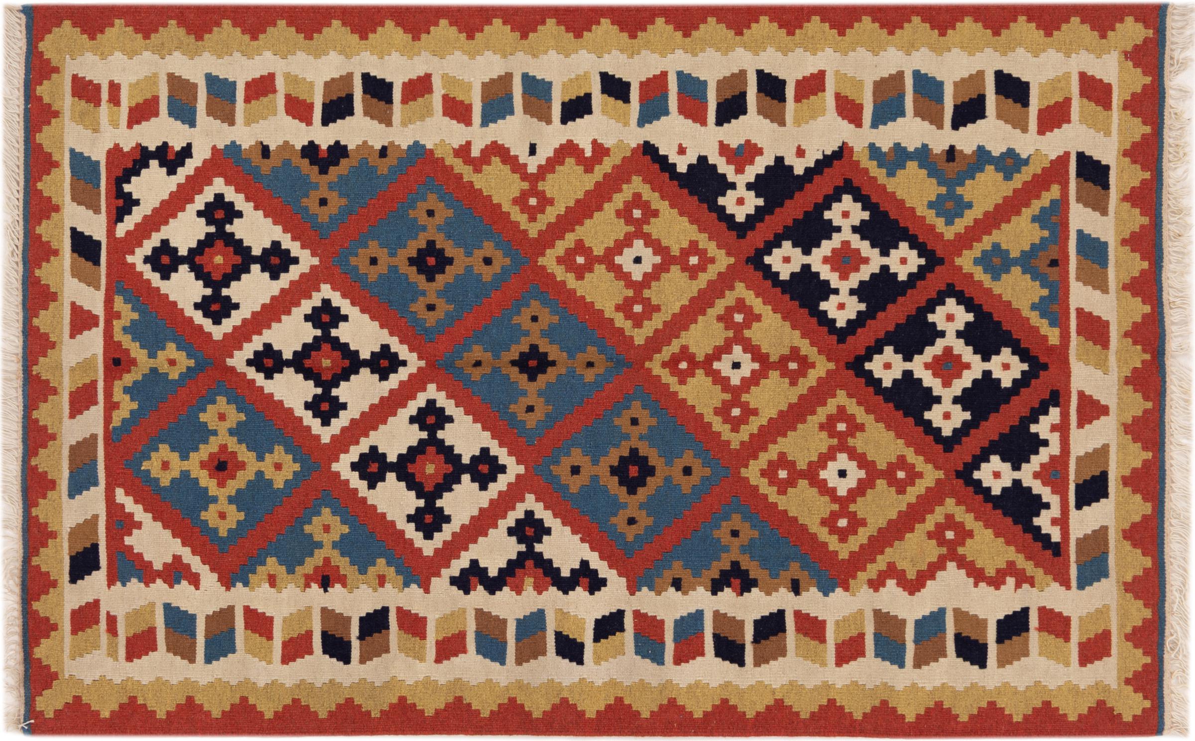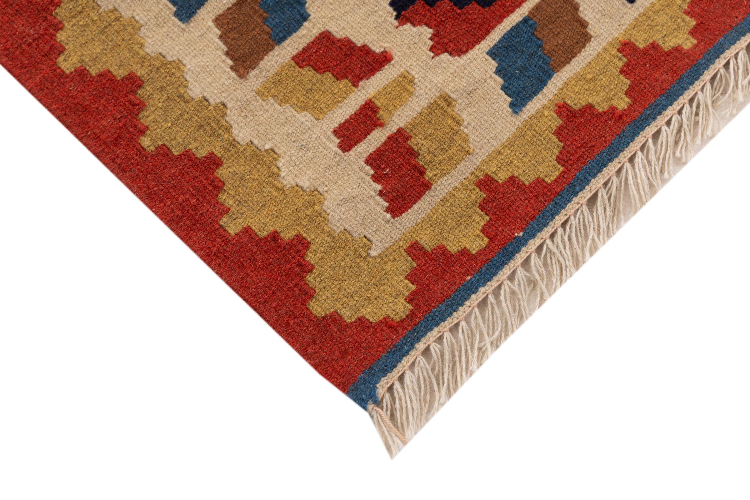 Dit tapijt is met de hand gemaakt op een weefgetouw als plat weefgetouw. Flatweave is de term die wordt gebruikt om tapijten zonder pool te beschrijven. Zoals de naam al belooft, zijn deze tapijten geweven en niet geknoopt. Dit resulteert in een vlak tapijt met een gestructureerd oppervlak. Platweefsels zijn niet zo zacht en meestal dunner dan geknoopte tapijten. Tegelijkertijd zijn ze veel minder complex te vervaardigen en kunnen ze meestal aan beide zijden (voor- en achterkant) worden gelegd. Hun patronen zijn meestal geometrisch, wat wordt bepaald door de stof.