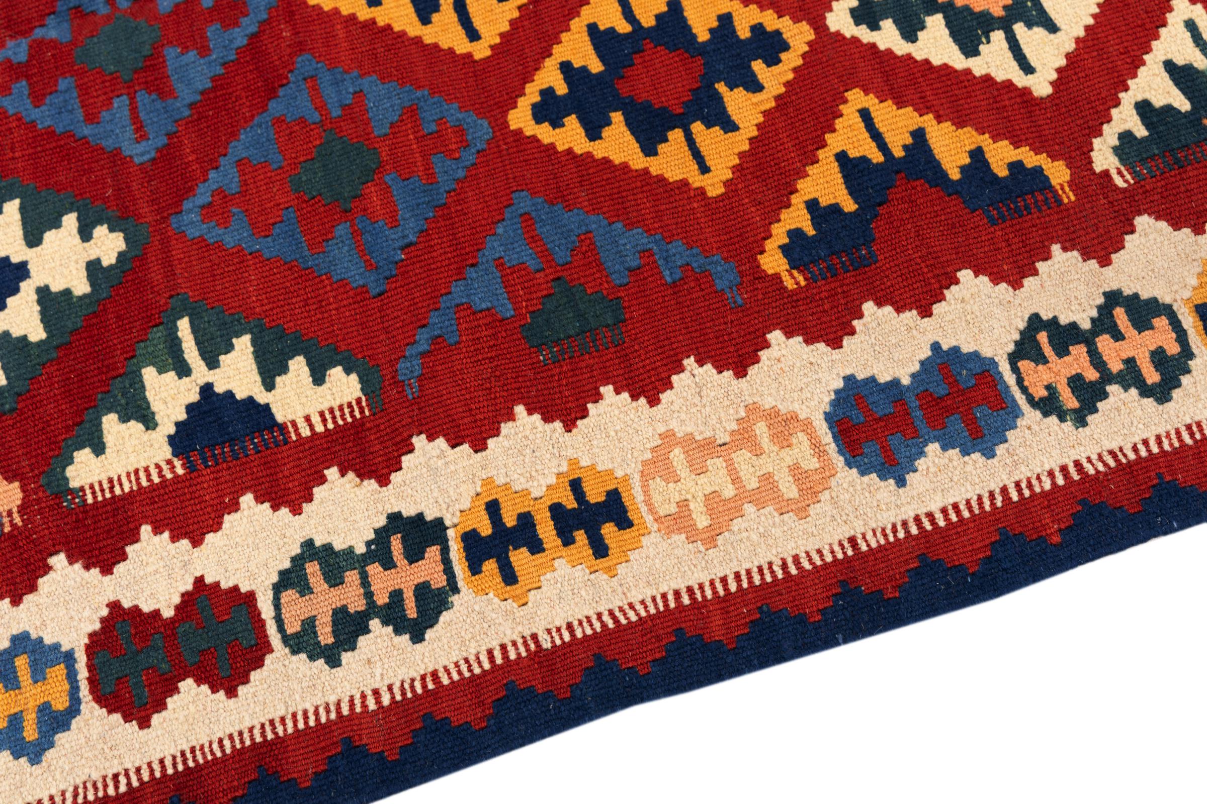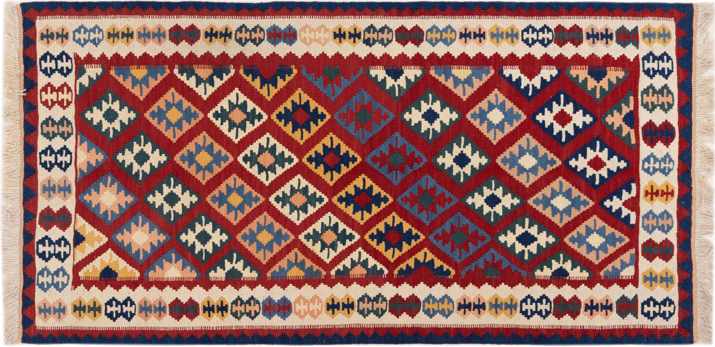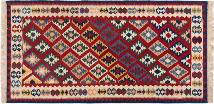 Dit tapijt is met de hand gemaakt op een weefgetouw als plat weefgetouw. Flatweave is de term die wordt gebruikt om tapijten zonder pool te beschrijven. Zoals de naam al belooft, zijn deze tapijten geweven en niet geknoopt. Dit resulteert in een vlak tapijt met een gestructureerd oppervlak. Platweefsels zijn niet zo zacht en meestal dunner dan geknoopte tapijten. Tegelijkertijd zijn ze veel minder complex te vervaardigen en kunnen ze meestal aan beide zijden (voor- en achterkant) worden gelegd. Hun patronen zijn meestal geometrisch, wat wordt bepaald door de stof.