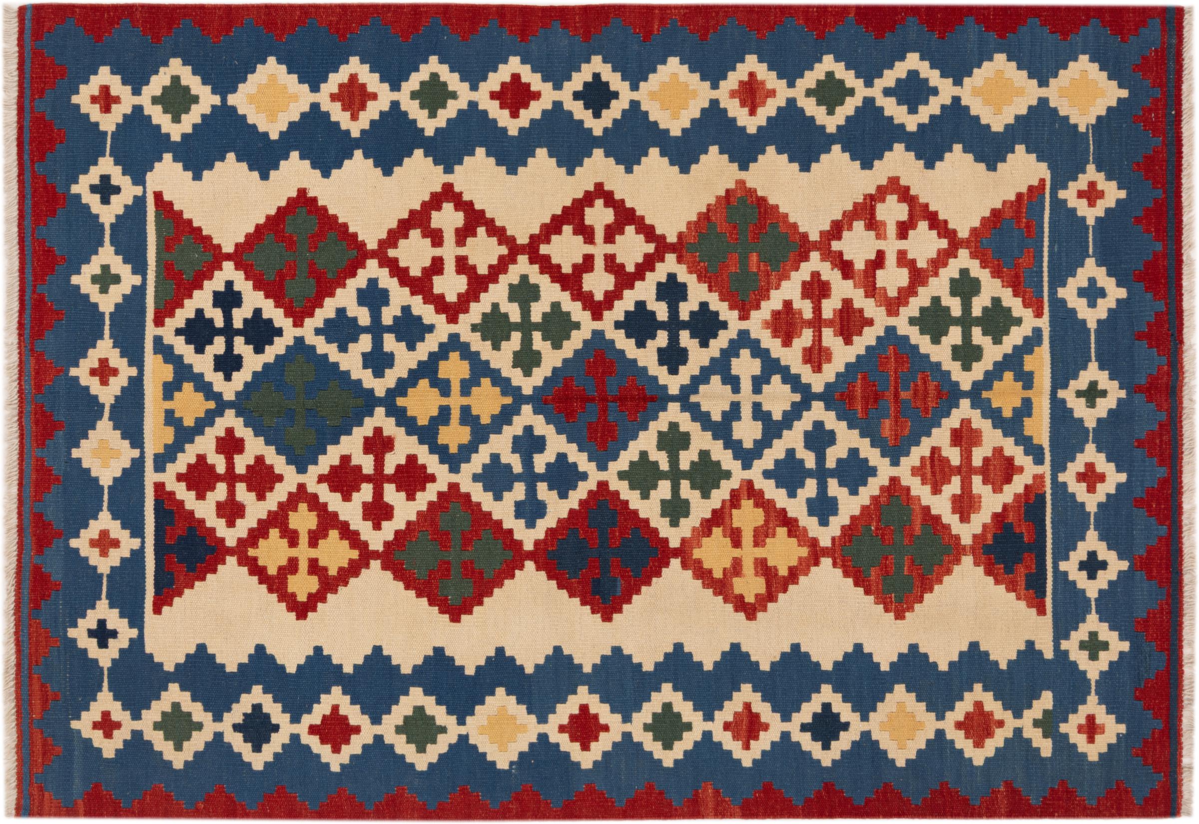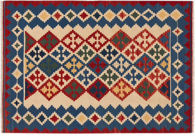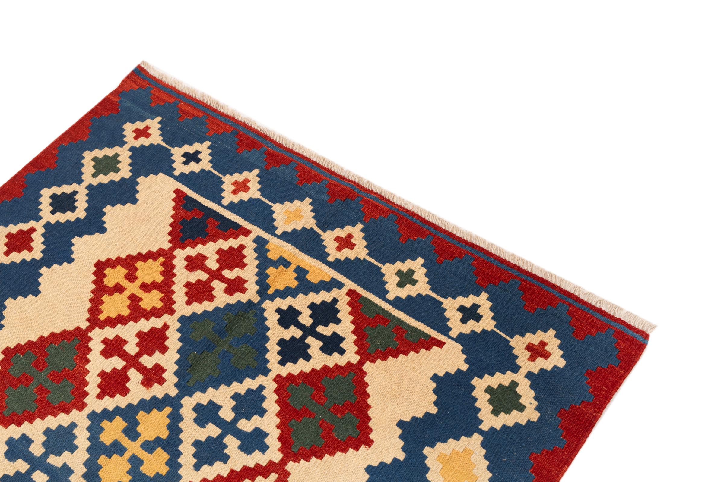 Dit tapijt is met de hand gemaakt op een weefgetouw als plat weefgetouw. Flatweave is de term die wordt gebruikt om tapijten zonder pool te beschrijven. Zoals de naam al belooft, zijn deze tapijten geweven en niet geknoopt. Dit resulteert in een vlak tapijt met een gestructureerd oppervlak. Platweefsels zijn niet zo zacht en meestal dunner dan geknoopte tapijten. Tegelijkertijd zijn ze veel minder complex te vervaardigen en kunnen ze meestal aan beide zijden (voor- en achterkant) worden gelegd. Hun patronen zijn meestal geometrisch, wat wordt bepaald door de stof.