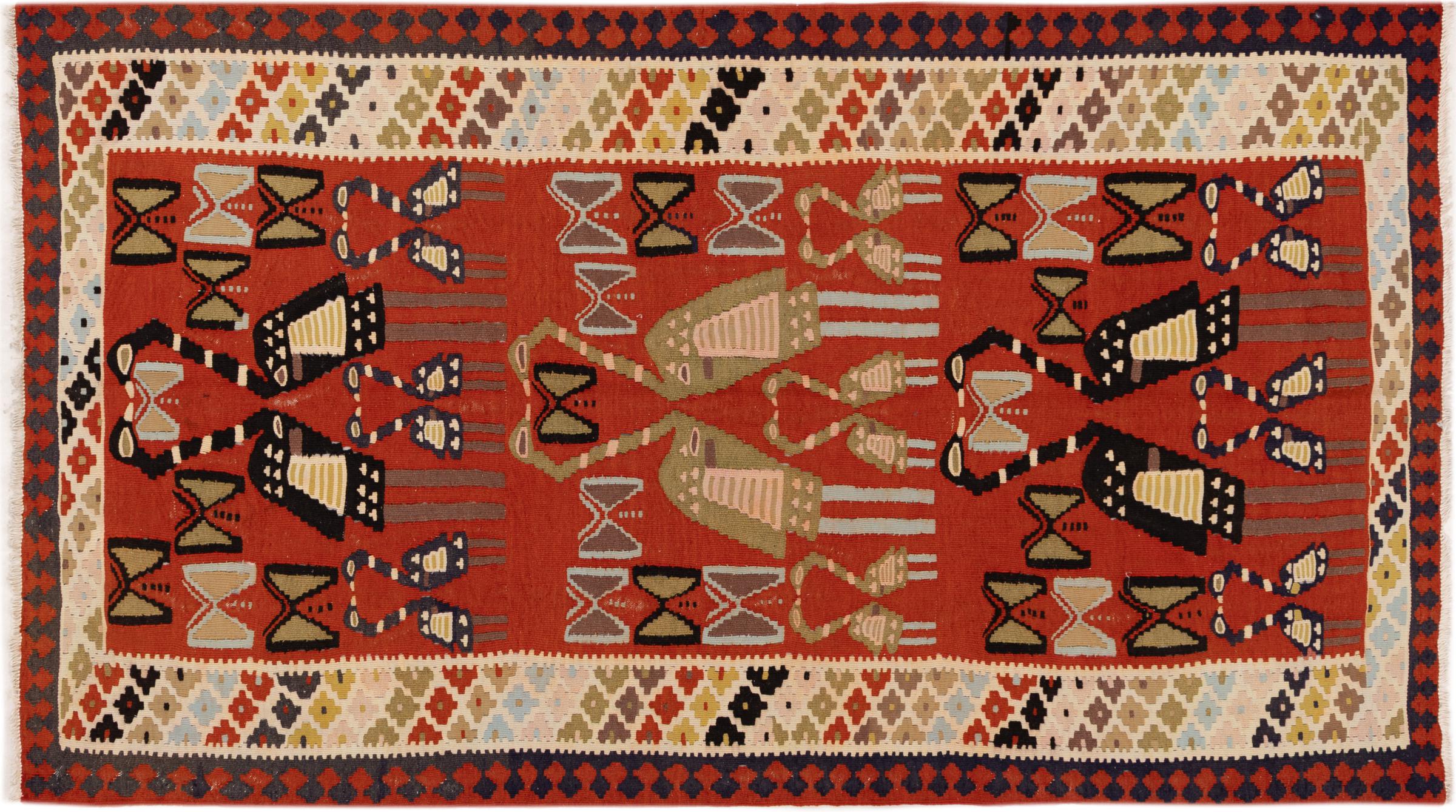 Dit tapijt is met de hand gemaakt op een weefgetouw als plat weefgetouw. Flatweave is de term die wordt gebruikt om tapijten zonder pool te beschrijven. Zoals de naam al belooft, zijn deze tapijten geweven en niet geknoopt. Dit resulteert in een vlak tapijt met een gestructureerd oppervlak. Platweefsels zijn niet zo zacht en meestal dunner dan geknoopte tapijten. Tegelijkertijd zijn ze veel minder complex te vervaardigen en kunnen ze meestal aan beide zijden (voor- en achterkant) worden gelegd. Hun patronen zijn meestal geometrisch, wat wordt bepaald door de stof.