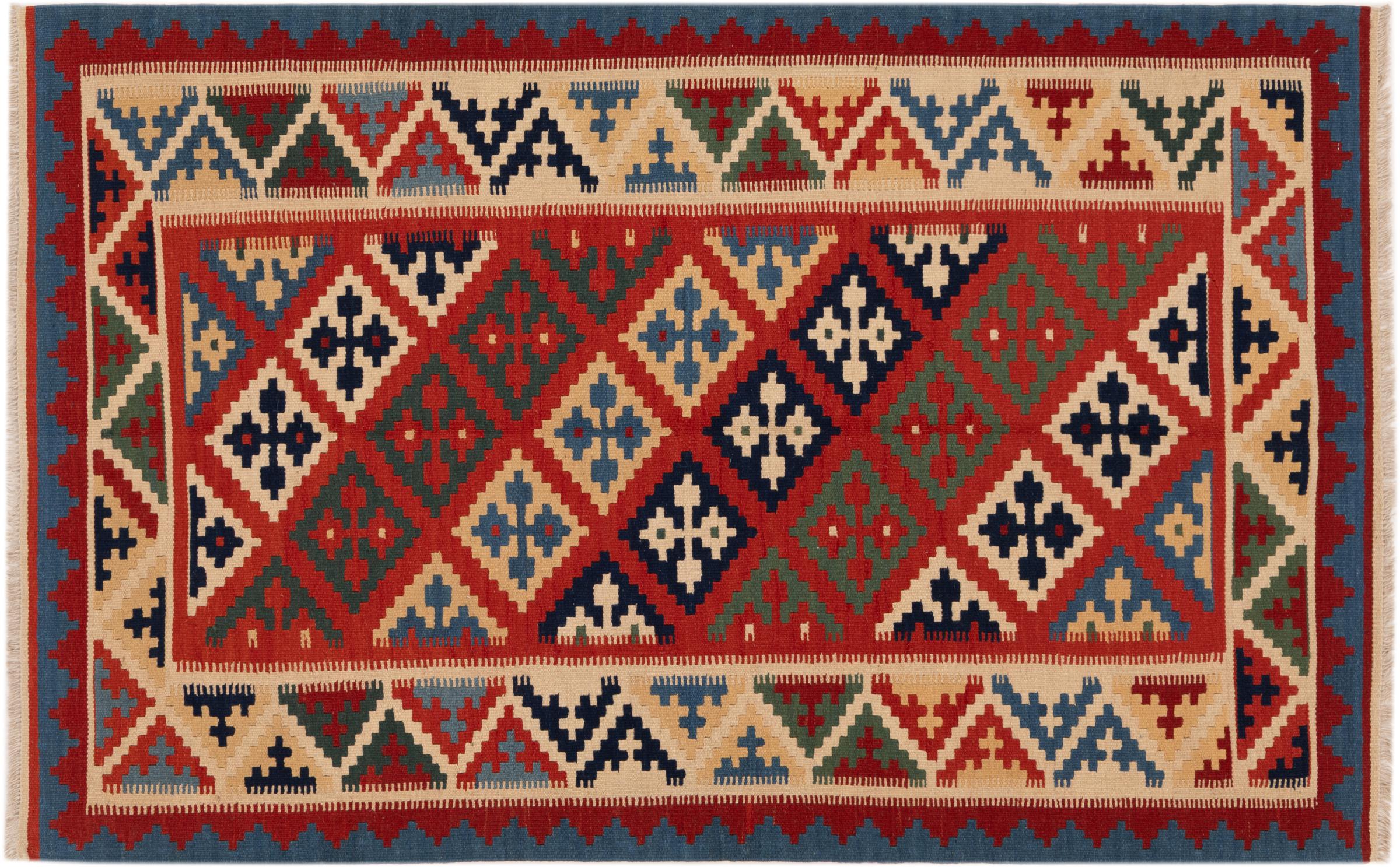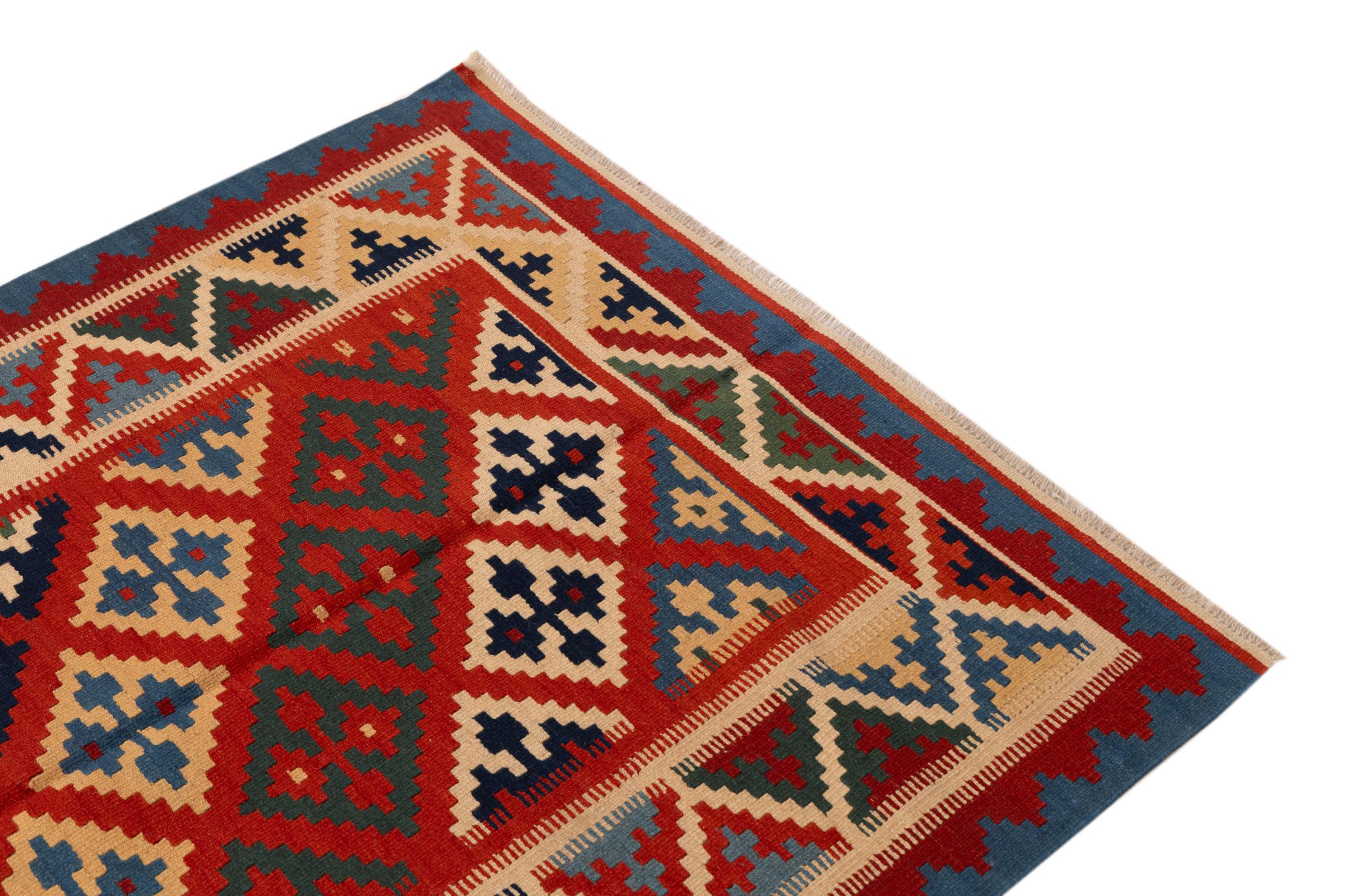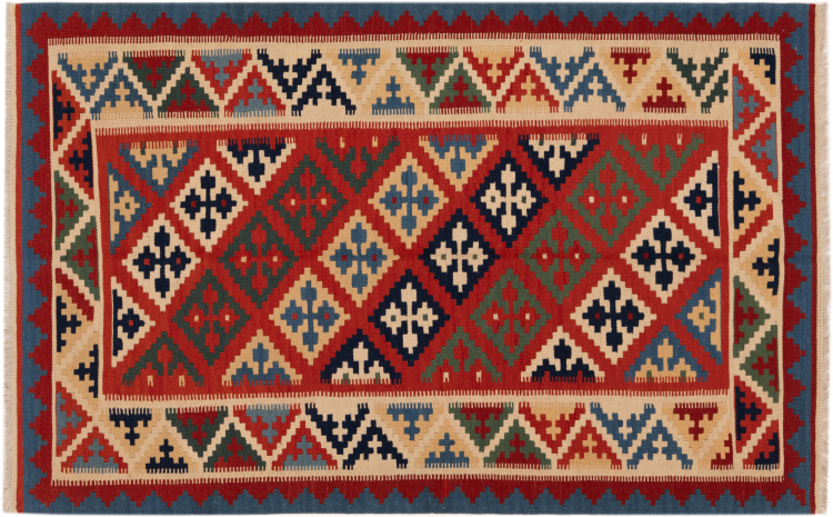 Dit tapijt is met de hand gemaakt op een weefgetouw als plat weefgetouw. Flatweave is de term die wordt gebruikt om tapijten zonder pool te beschrijven. Zoals de naam al belooft, zijn deze tapijten geweven en niet geknoopt. Dit resulteert in een vlak tapijt met een gestructureerd oppervlak. Platweefsels zijn niet zo zacht en meestal dunner dan geknoopte tapijten. Tegelijkertijd zijn ze veel minder complex te vervaardigen en kunnen ze meestal aan beide zijden (voor- en achterkant) worden gelegd. Hun patronen zijn meestal geometrisch, wat wordt bepaald door de stof.