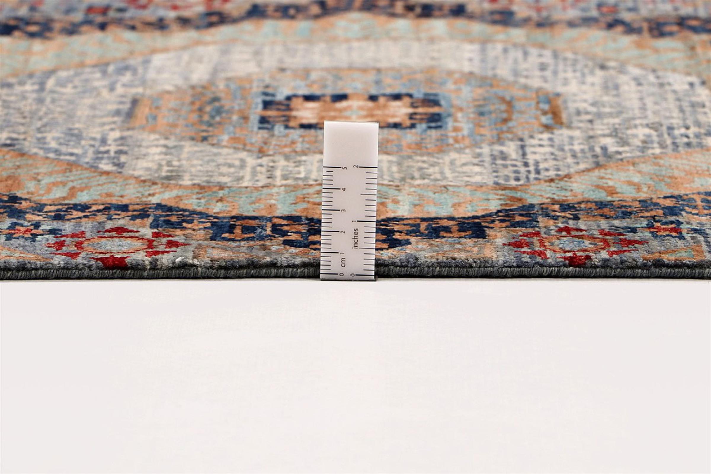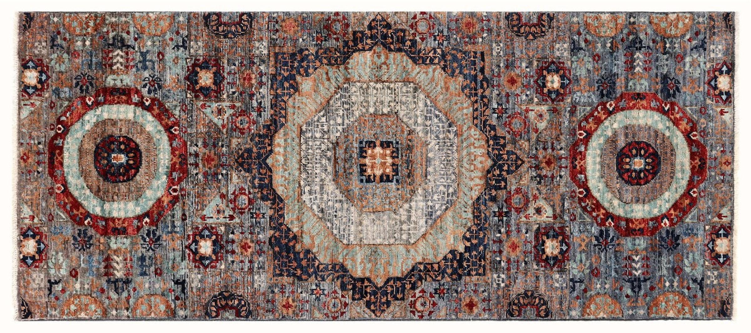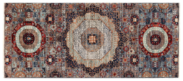 Deze Mamluk is met de hand geknoopt en maakt indruk met zijn opwindende elegantie. Het ontwerp is extravagant en uniek, maar niet erg bekend. De kleuren van het oosterse tapijt zijn modieus gecombineerd en de unieke motieven brengen gegarandeerd leven en bewondering in uw kamer.