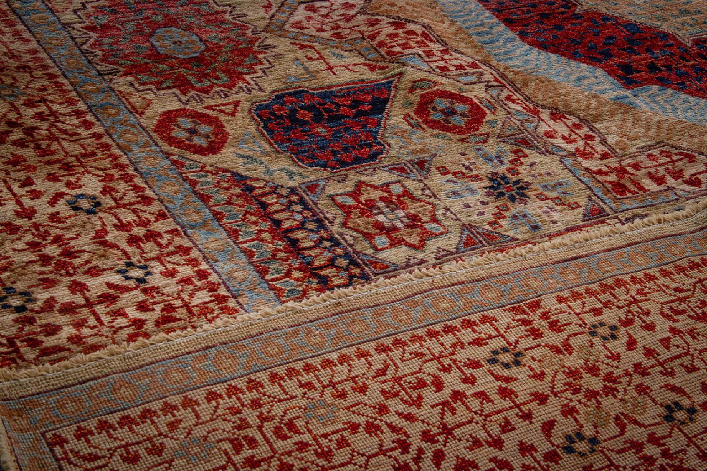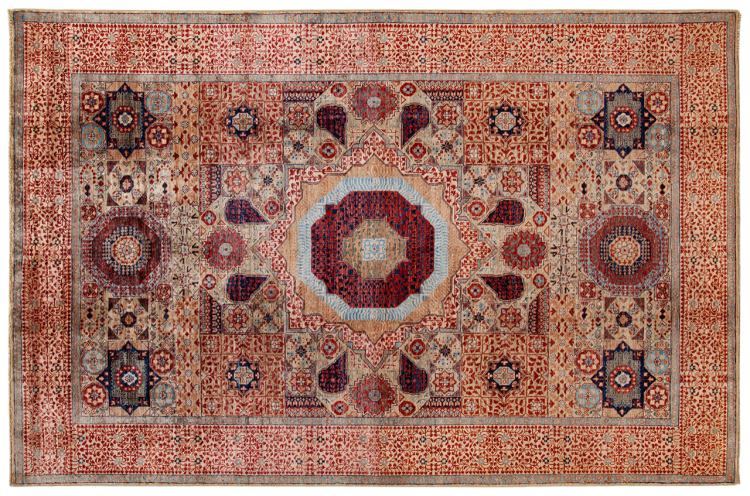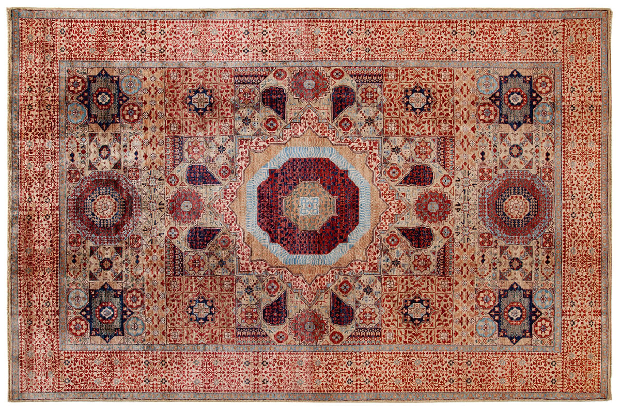 Deze Mamluk is met de hand geknoopt en maakt indruk met zijn opwindende elegantie. Het ontwerp is extravagant en uniek, maar niet erg bekend. De kleuren van het oosterse tapijt zijn modieus gecombineerd en de unieke motieven brengen gegarandeerd leven en bewondering in uw kamer.