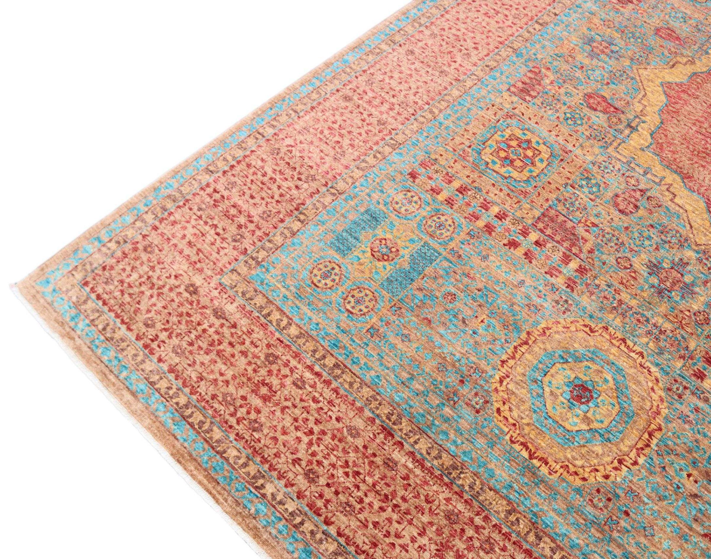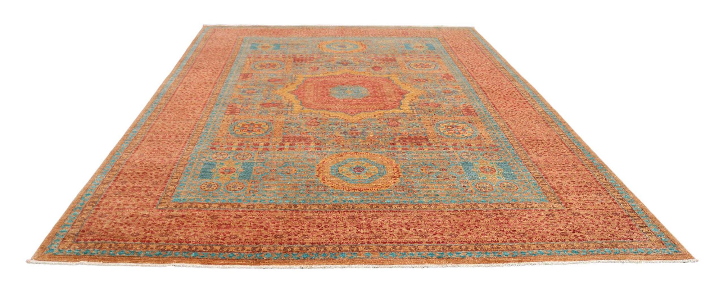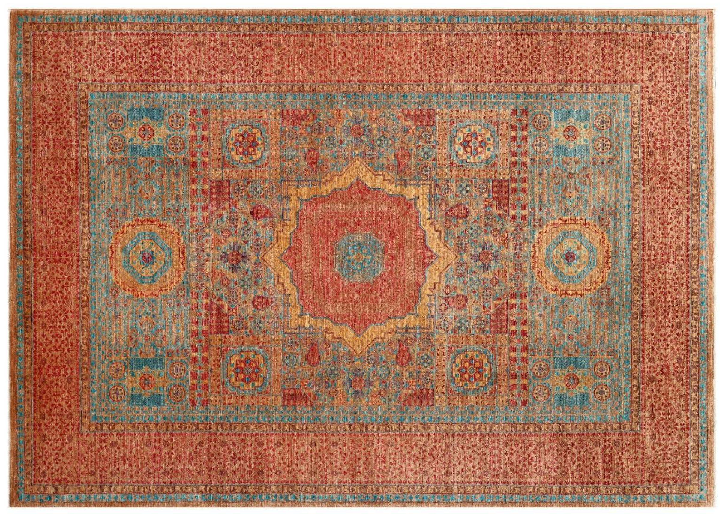 Deze Mamluk is met de hand geknoopt en maakt indruk met zijn opwindende elegantie. Het ontwerp is extravagant en uniek, maar niet erg bekend. De kleuren van het oosterse tapijt zijn modieus gecombineerd en de unieke motieven brengen gegarandeerd leven en bewondering in uw kamer.
