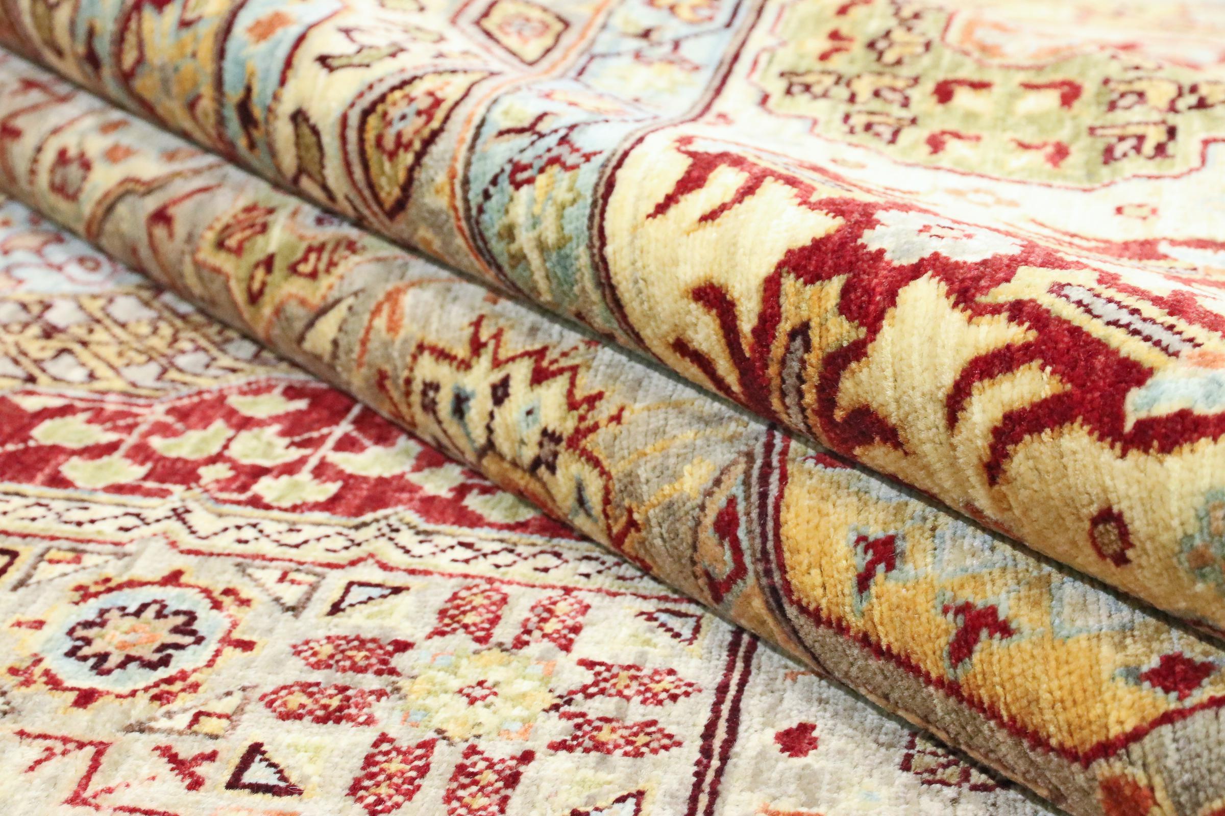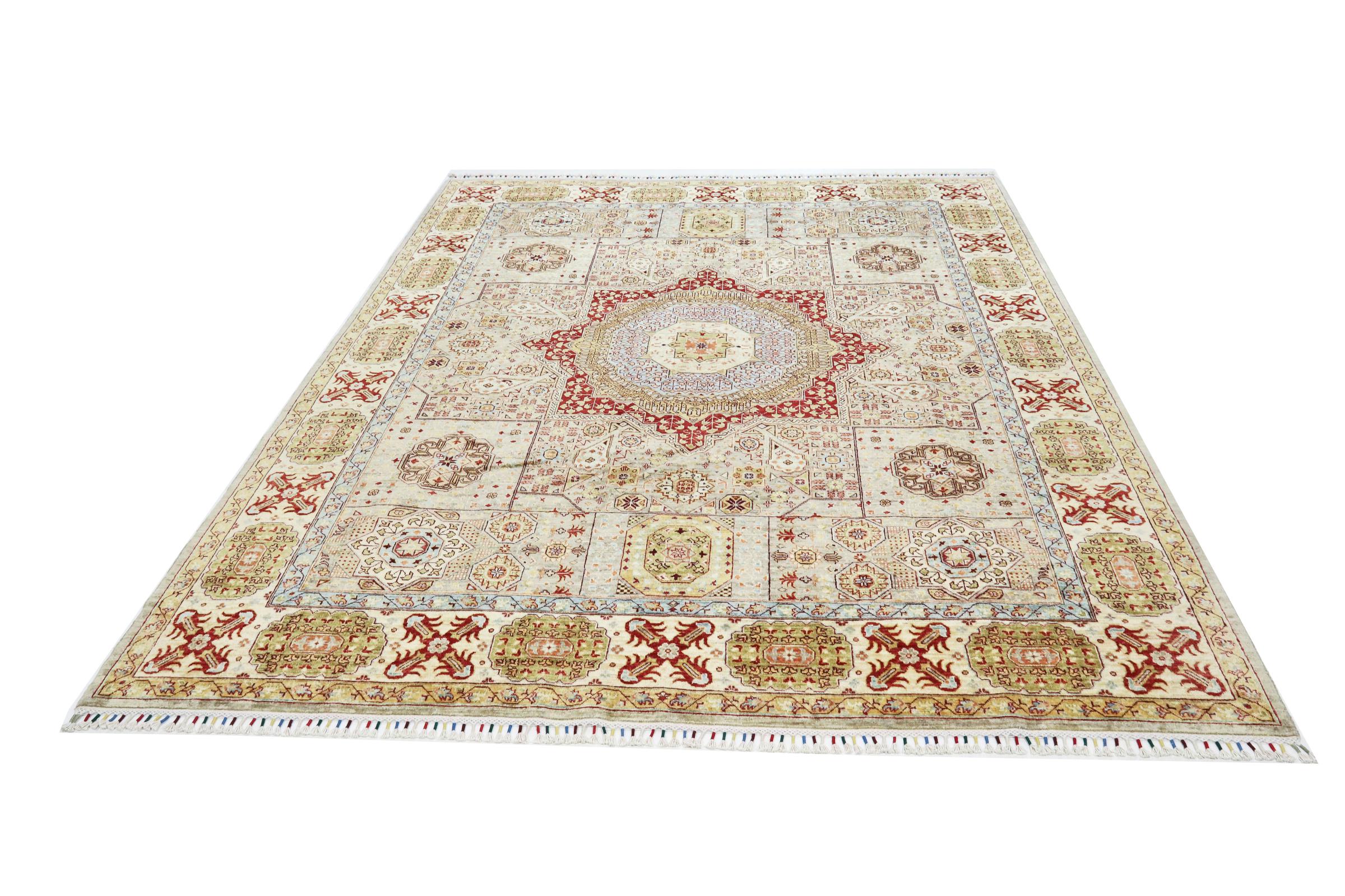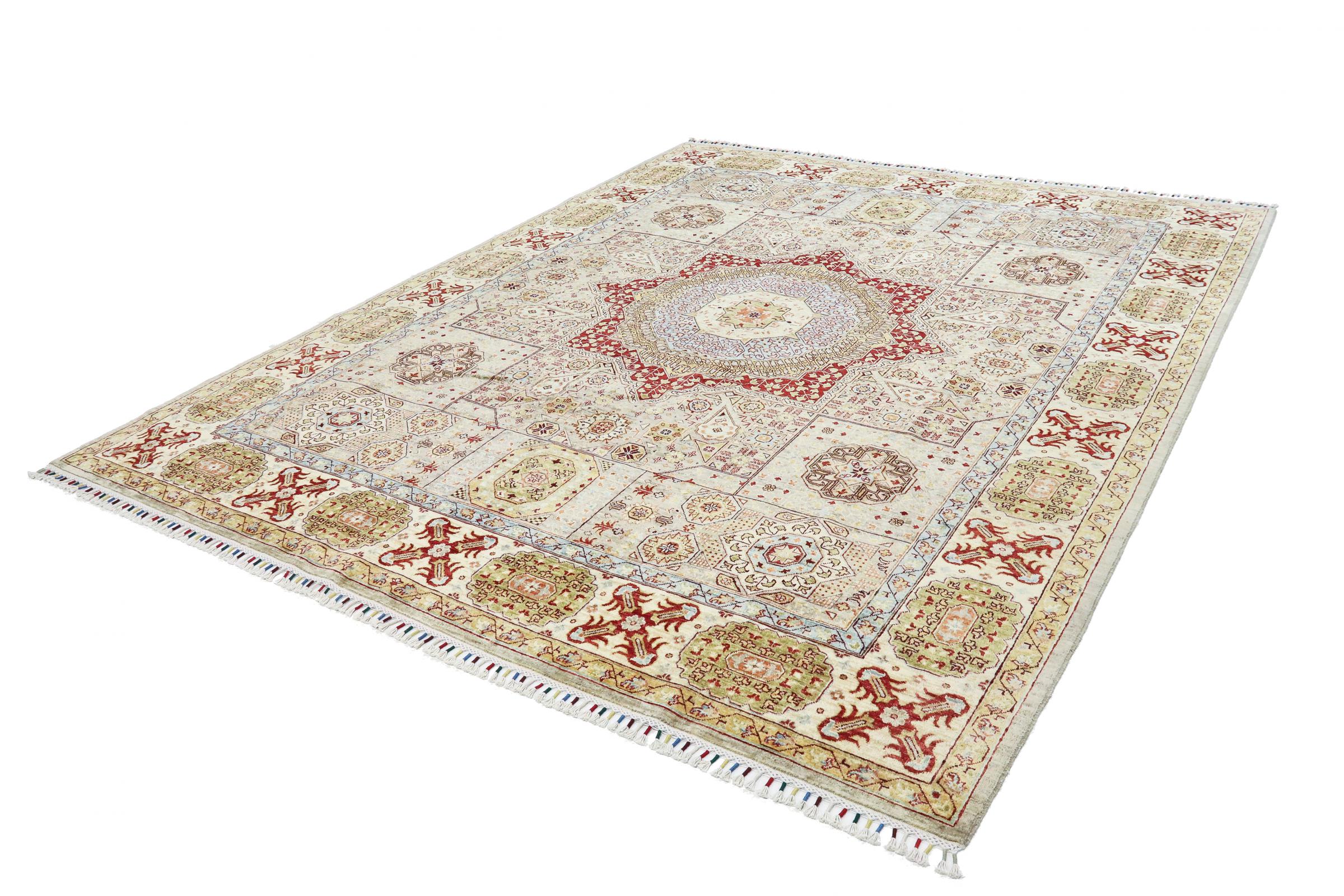 Deze Mamluk is met de hand geknoopt en maakt indruk met zijn opwindende elegantie. Het ontwerp is extravagant en uniek, maar niet erg bekend. De kleuren van het oosterse tapijt zijn modieus gecombineerd en de unieke motieven brengen gegarandeerd leven en bewondering in uw kamer.