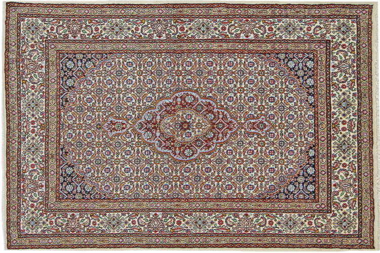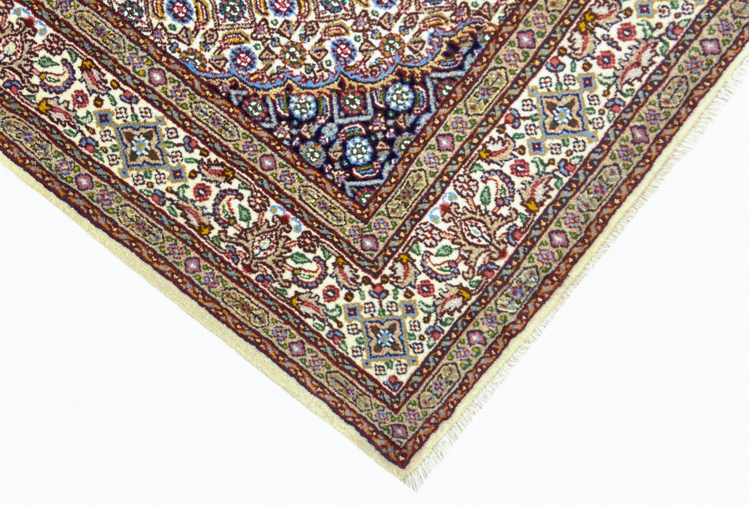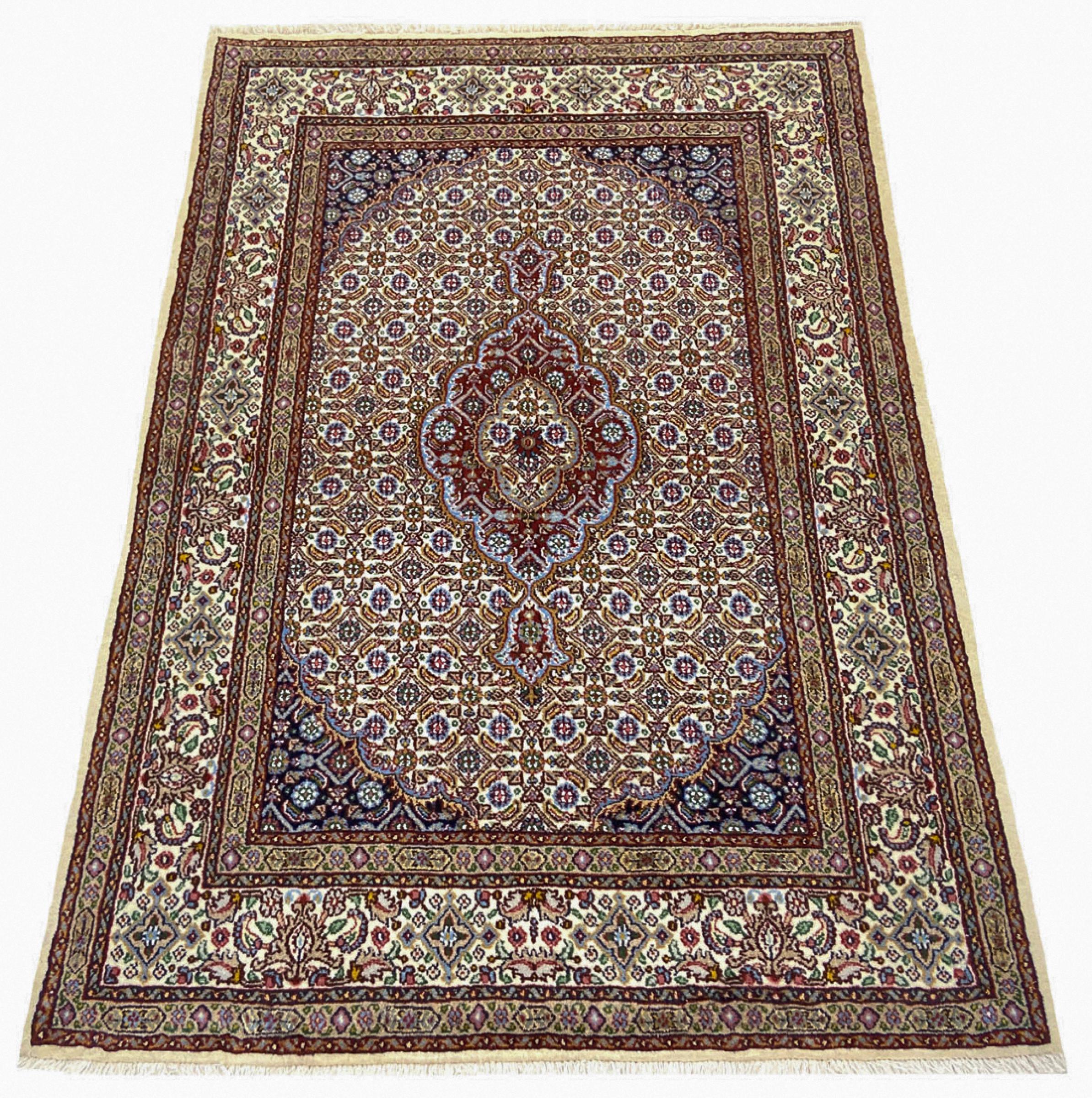 Dit tapijt uit Moud, een stadje 300 km ten zuiden van Mashhad, is op het eerste gezicht indrukwekkend. Het typische Herati-patroon of tuindessin wordt gewaardeerd door kenners en liefhebbers van echte Perzische tapijten. Als u op zoek bent naar een handgemaakt tapijt van fijne kwaliteit met een zeer uniek en onderscheidend ontwerp, dan is dit type tapijt absoluut iets voor u.