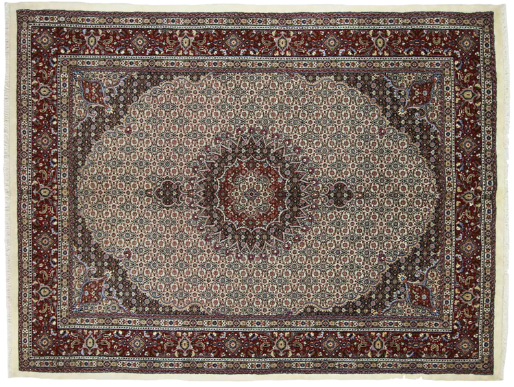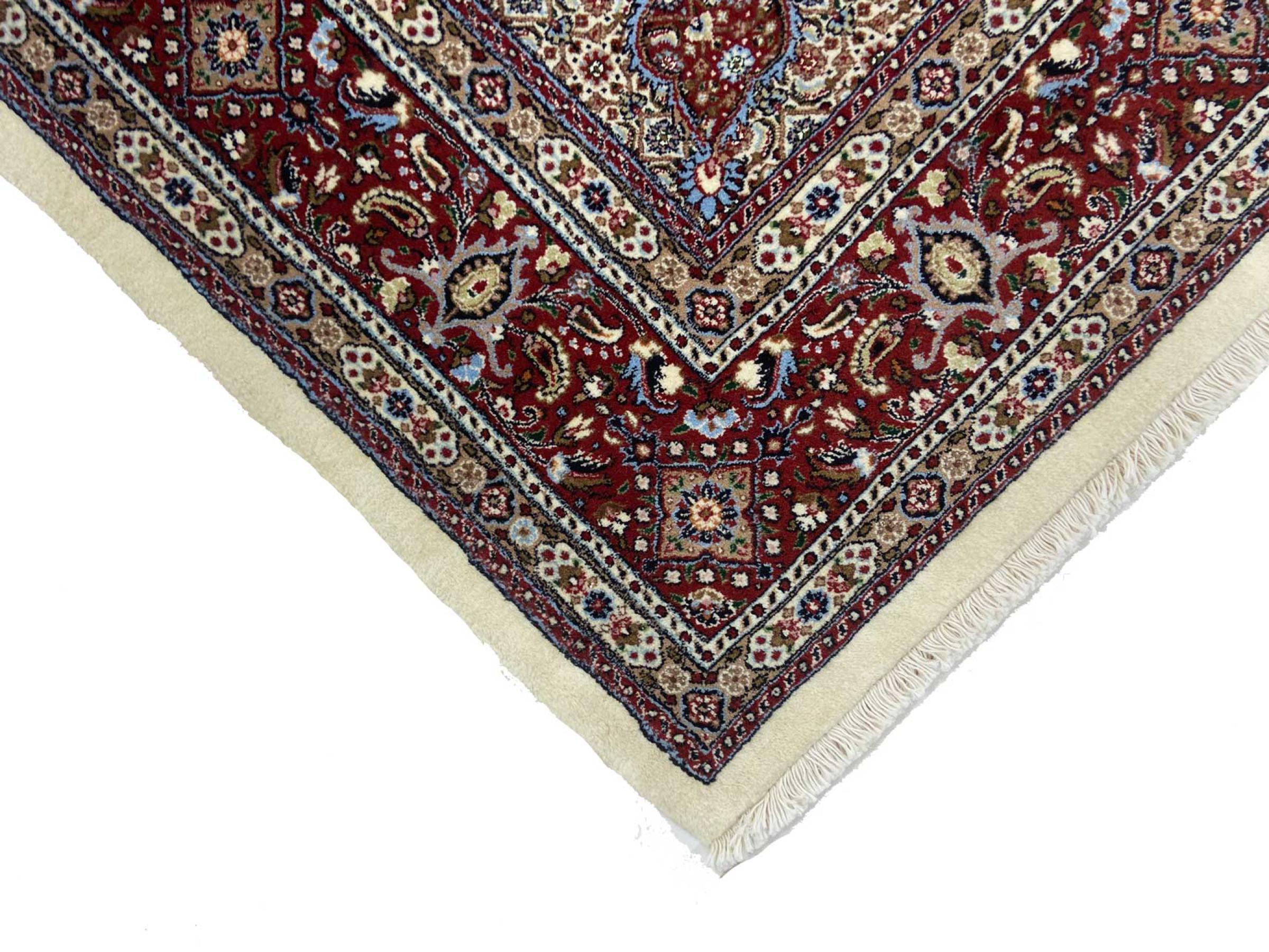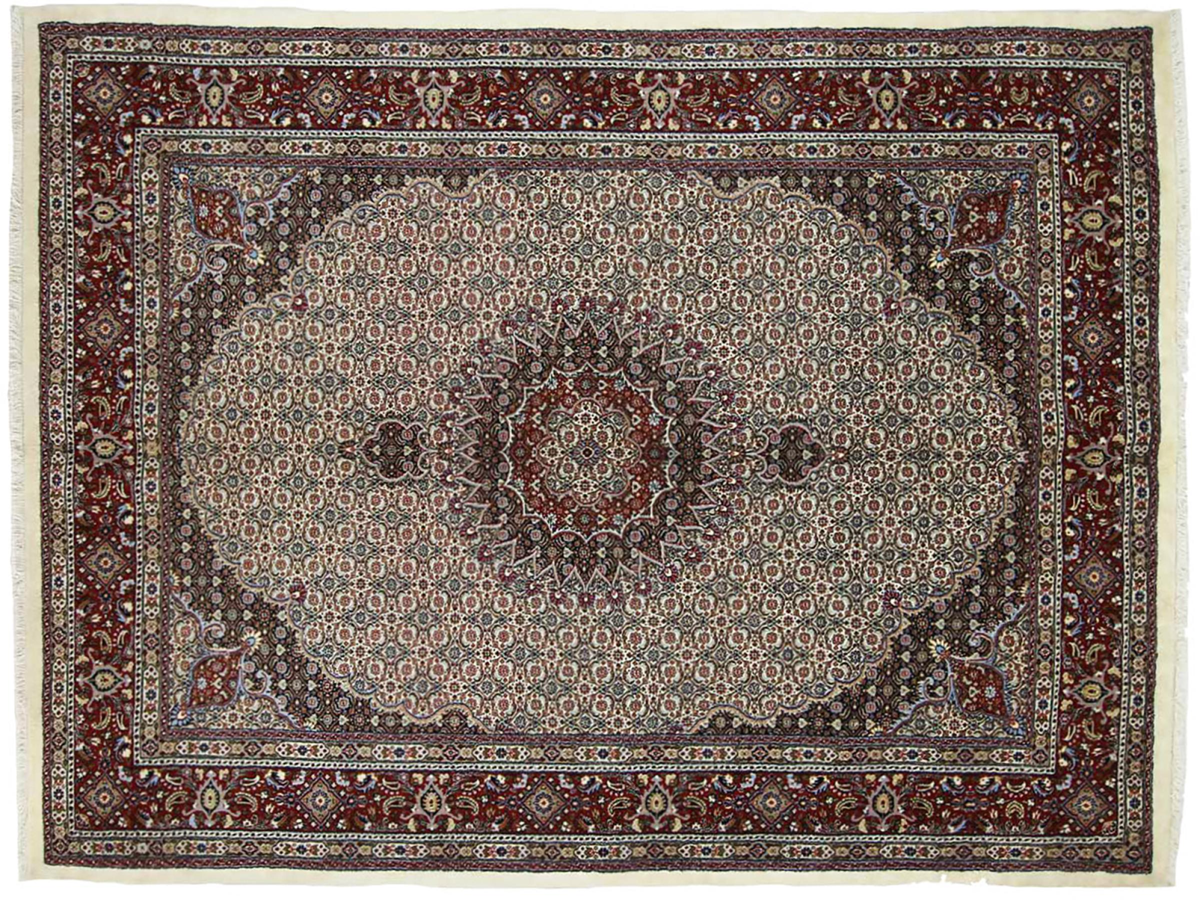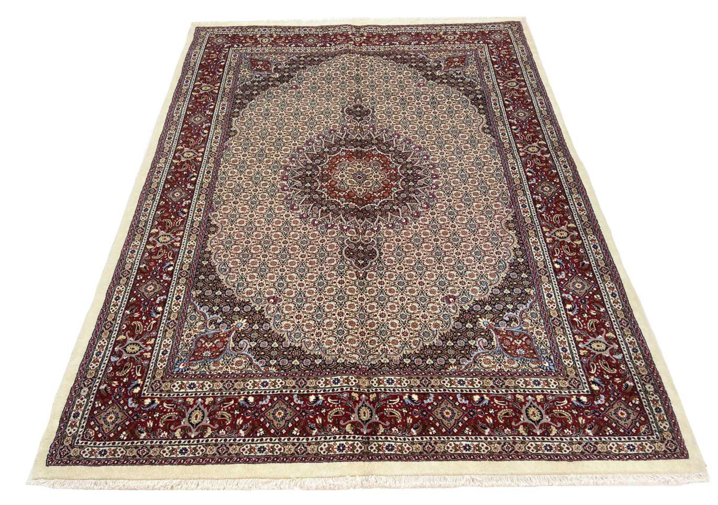 Dit tapijt uit Moud, een stadje 300 km ten zuiden van Mashhad, is op het eerste gezicht indrukwekkend. Het typische Herati-patroon of tuindessin wordt gewaardeerd door kenners en liefhebbers van echte Perzische tapijten. Als u op zoek bent naar een handgemaakt tapijt van fijne kwaliteit met een zeer uniek en onderscheidend ontwerp, dan is dit type tapijt absoluut iets voor u.