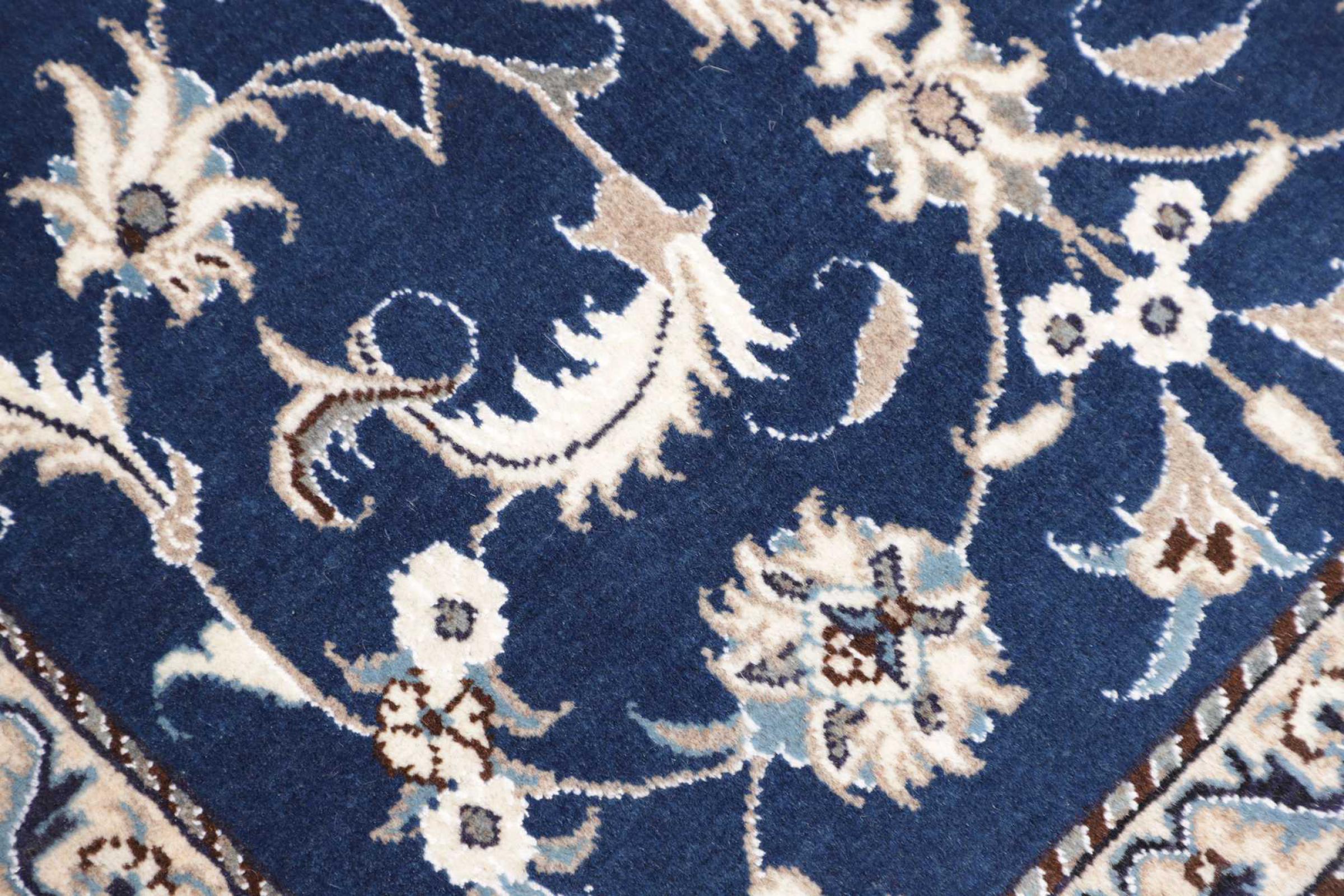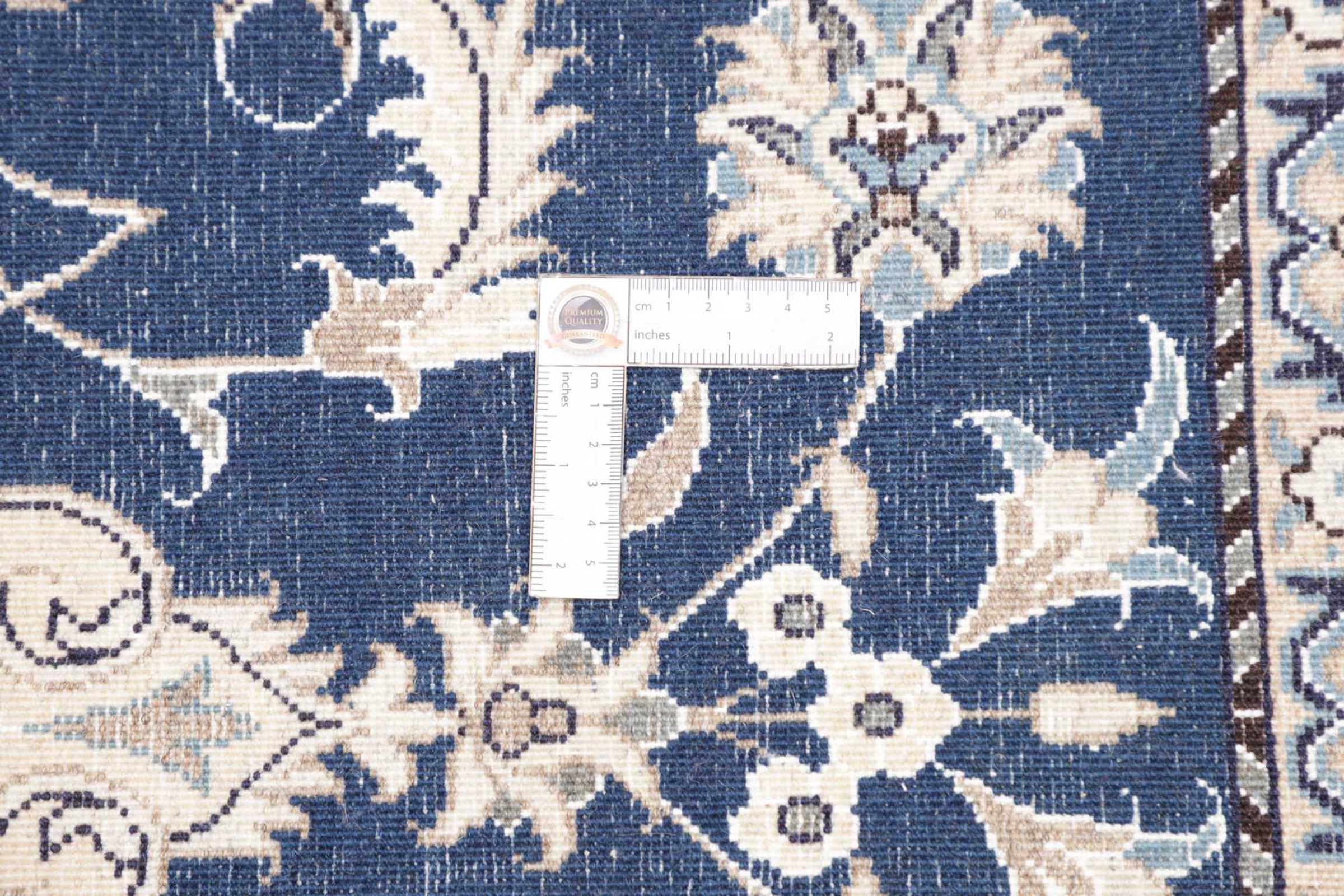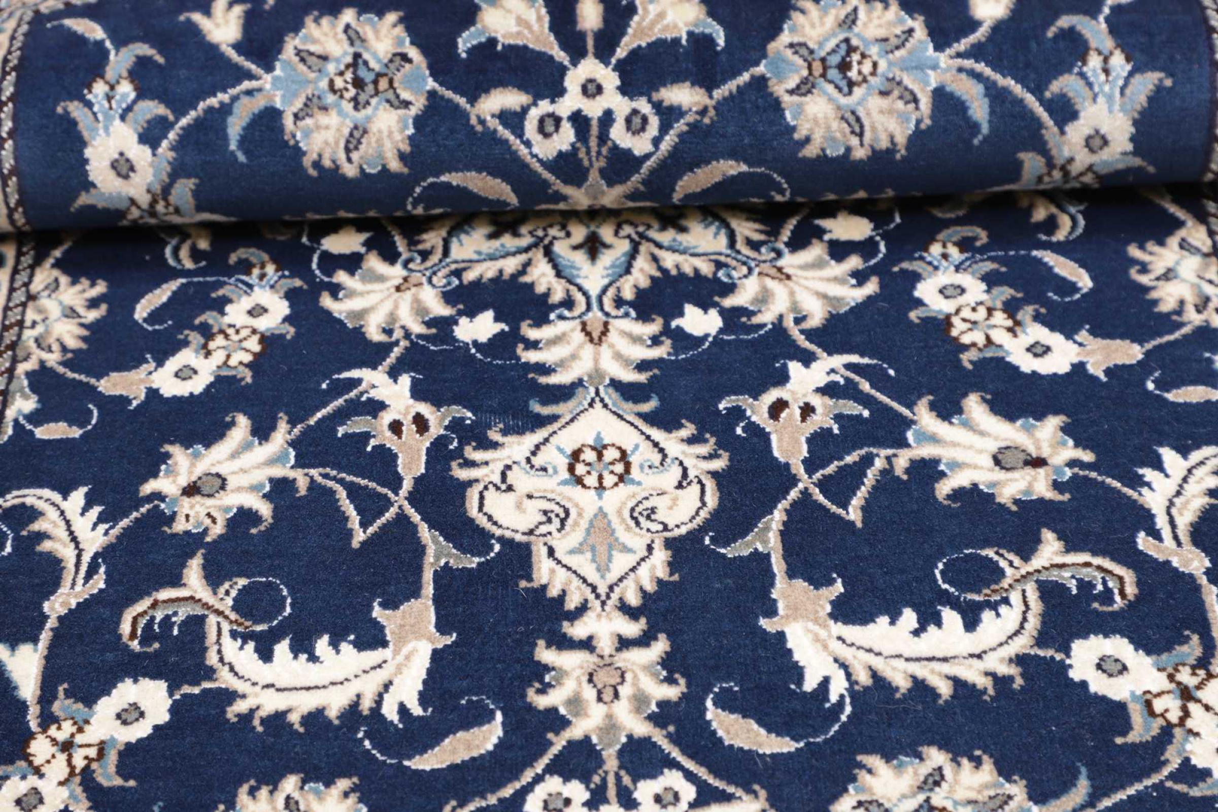 Dit Nain tapijt is geclassificeerd als 12La. Het heeft een elegante en verfijnde look met zijn typische Nain-kleuring. Dit Perzische tapijt werd met de hand geknoopt in de stad Nain, gelegen aan het westelijke uiteinde van de Dasht-e-Kavir woestijn, uit wol van hoge kwaliteit en natuurlijke zijde. Met zijn grootte van 12La is het niet zo fijn gedetailleerd met ornamenten als een Nain 9La of 6La.